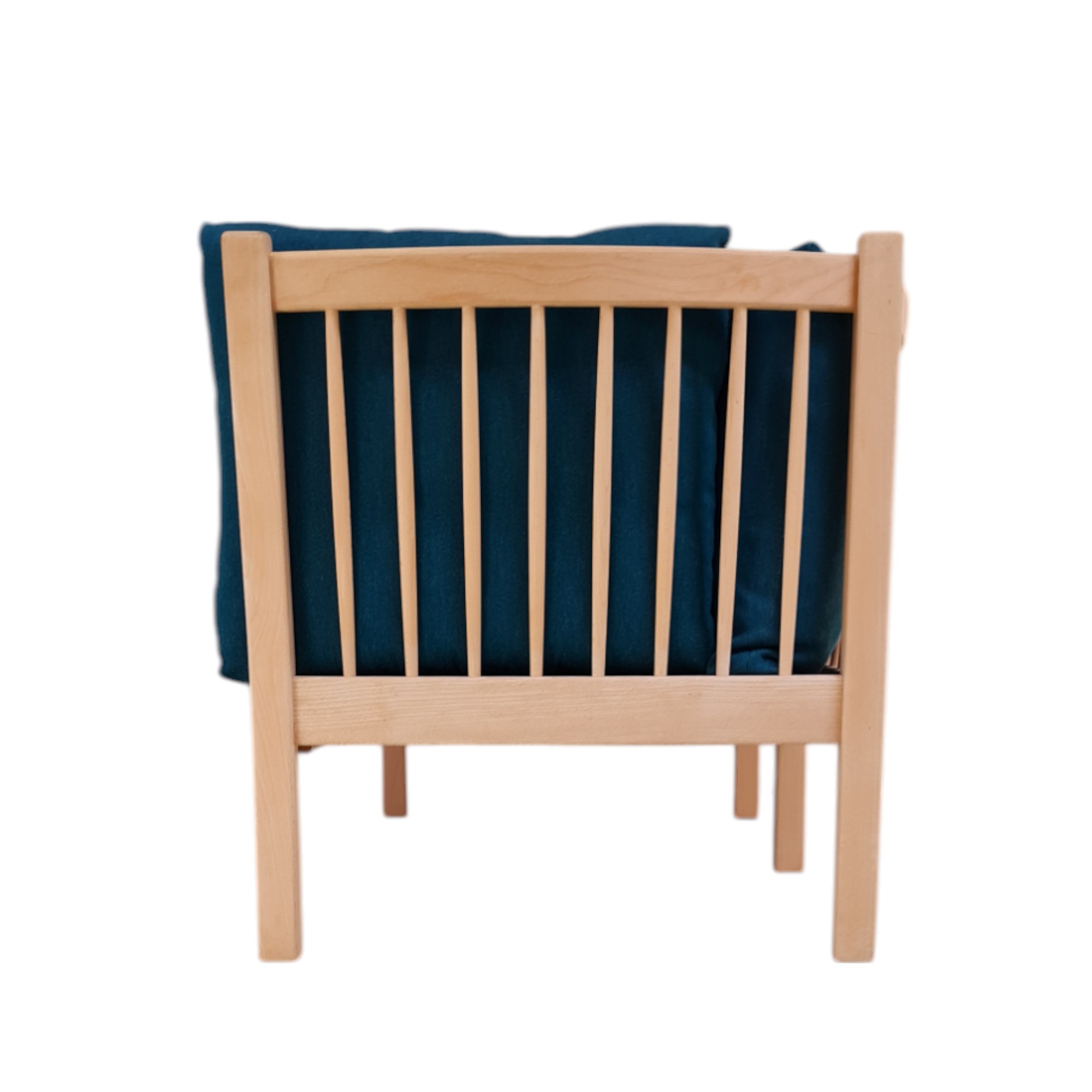 Sofaen er udført med stel i bøg og hynder af grøn uld.