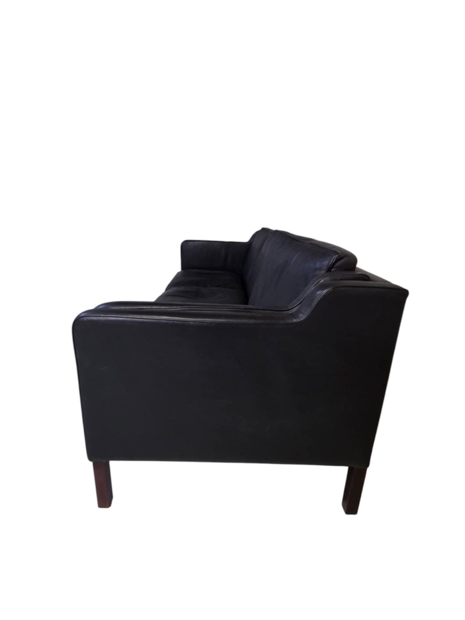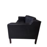 3-Personers sofa model EVA med løse hynder. Formgivet 1970’erne. Udført fuldpolstret med sorte læder hynder og ben i mahogny. Fremstillet hos Stouby Furniture A/S.