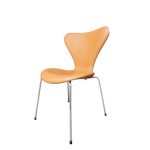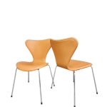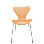 Ikonisk og tidløs spisebordsstol designet af Arne Jacobsen i 1955 – model 3107, også kendt som “Syveren”. Stolen er udført med formspændt skal og kromstel, og er en af de mest kendte og elskede danske designklassikere. Den er polstret i originalt nougatfarvet læder.