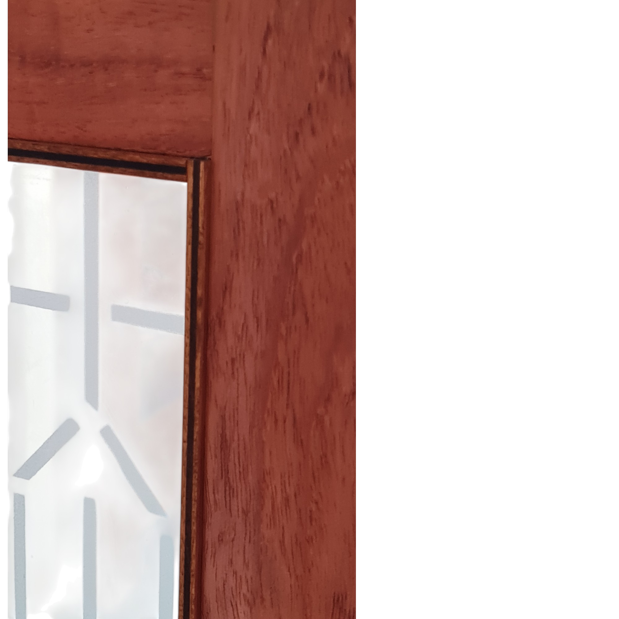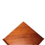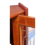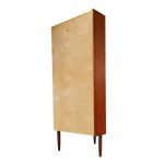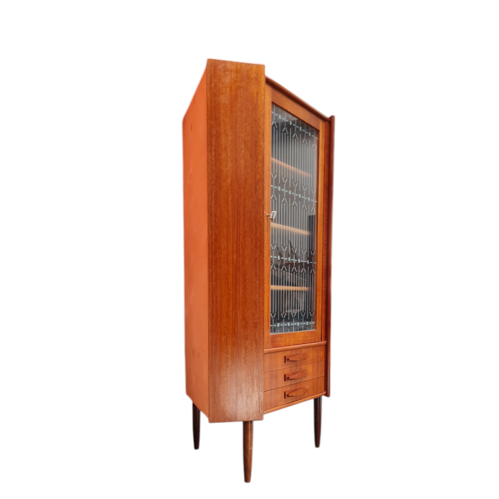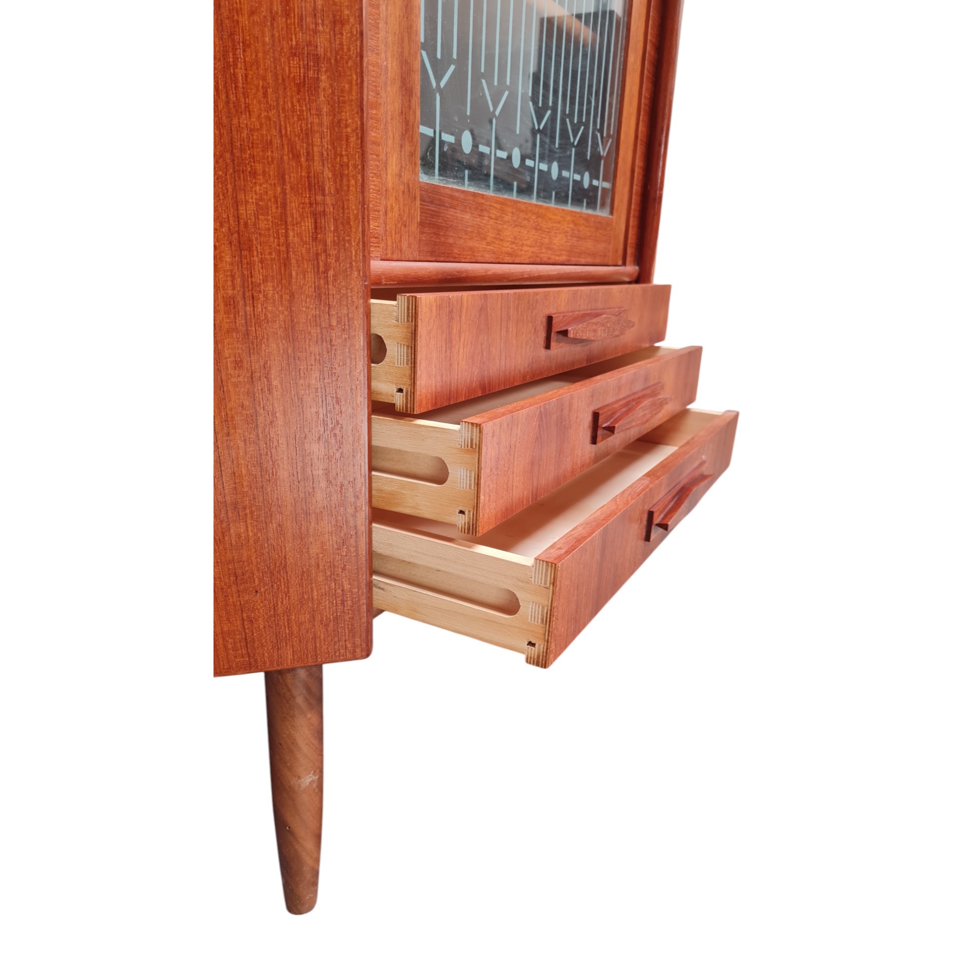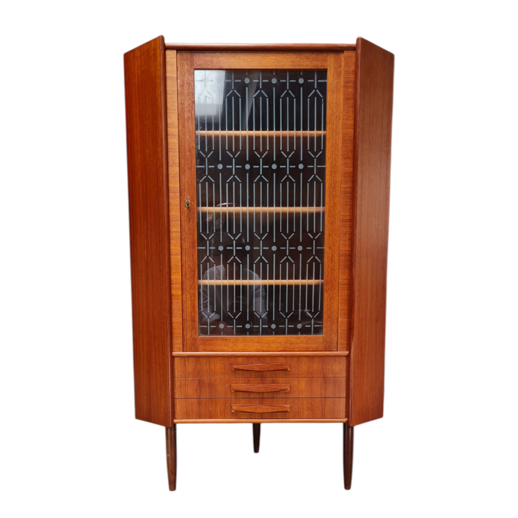 Eksklusivt hjørneskab med tre skuffer samt to glaslåger i smukt slebet glas. Dansk design udført i fineret og massiv teak.