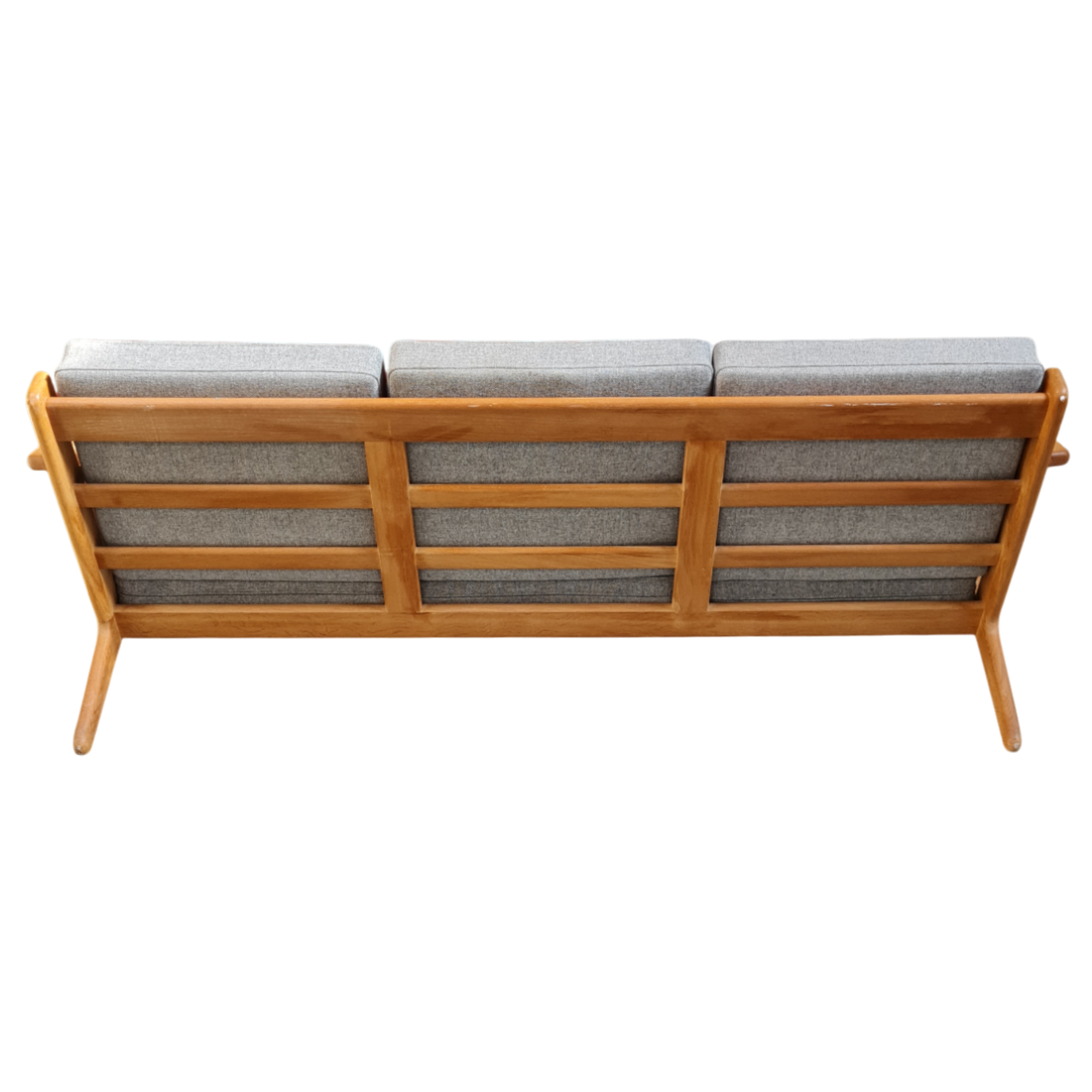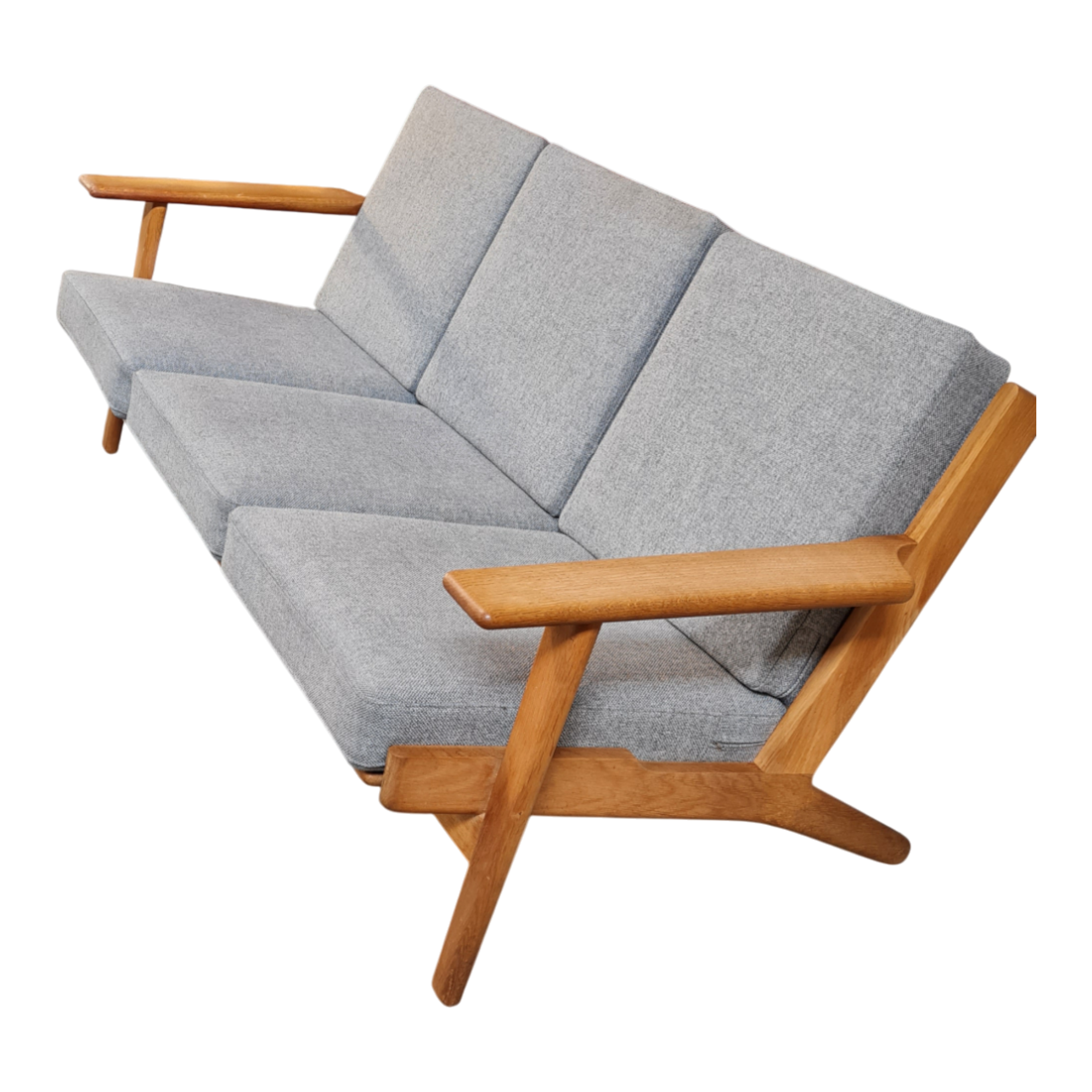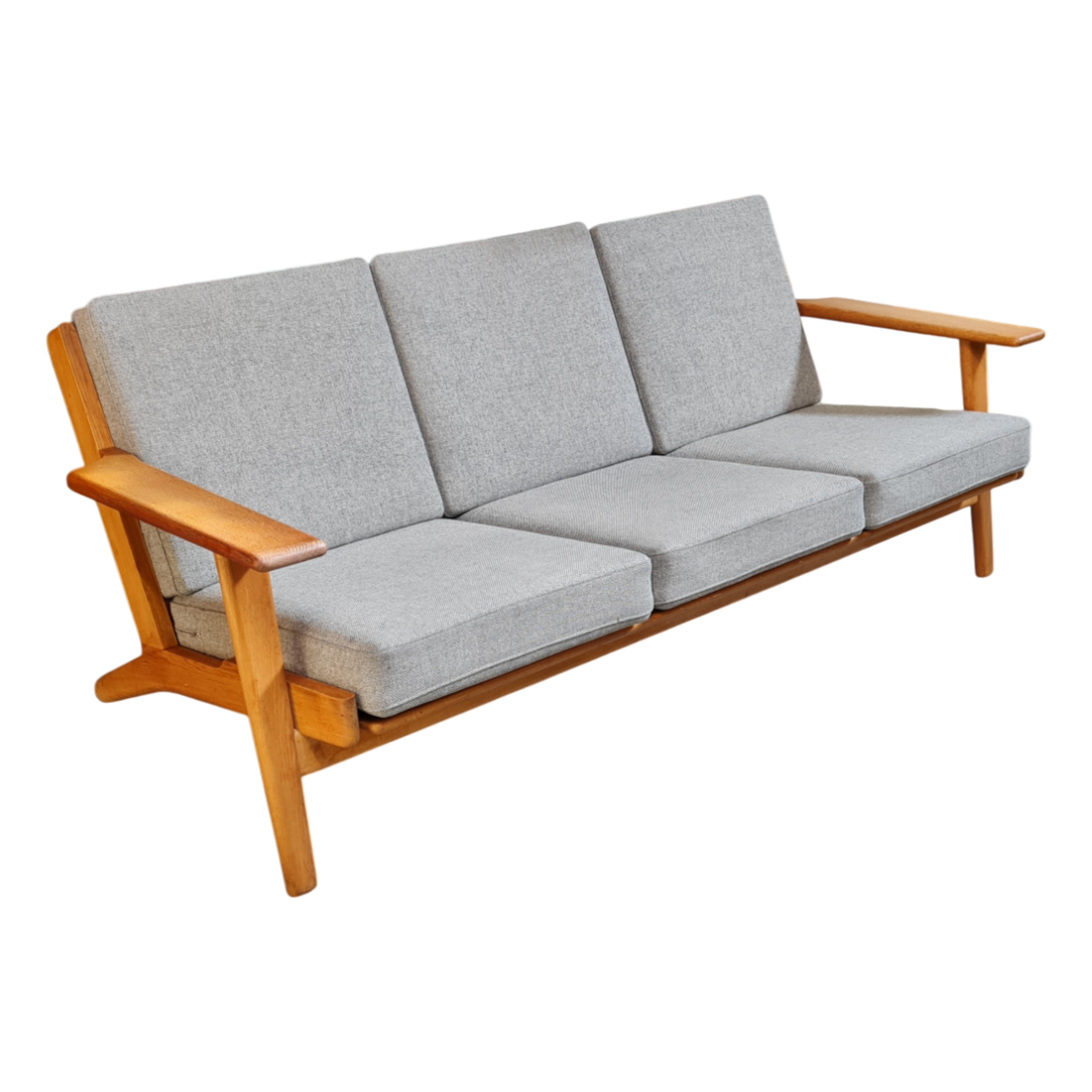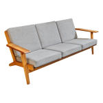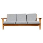 Elegant 3-personers sofa designet af Hans J. Wegner for Getama i 1953. Sofaen er udført i massivt egetræ og har faste hynder betrukket med gråligt uld, som fremhæver det rene og tidløse formsprog.