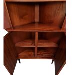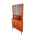 Eksklusivt hjørneskab med to låger samt to glaslåger i smukt slebet glas. Dansk design udført i fineret og massiv teak.