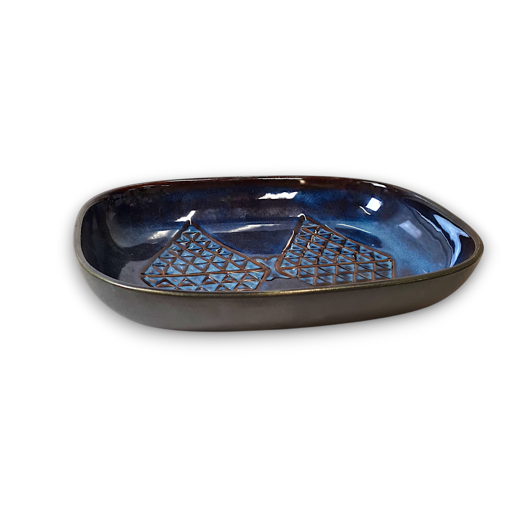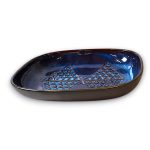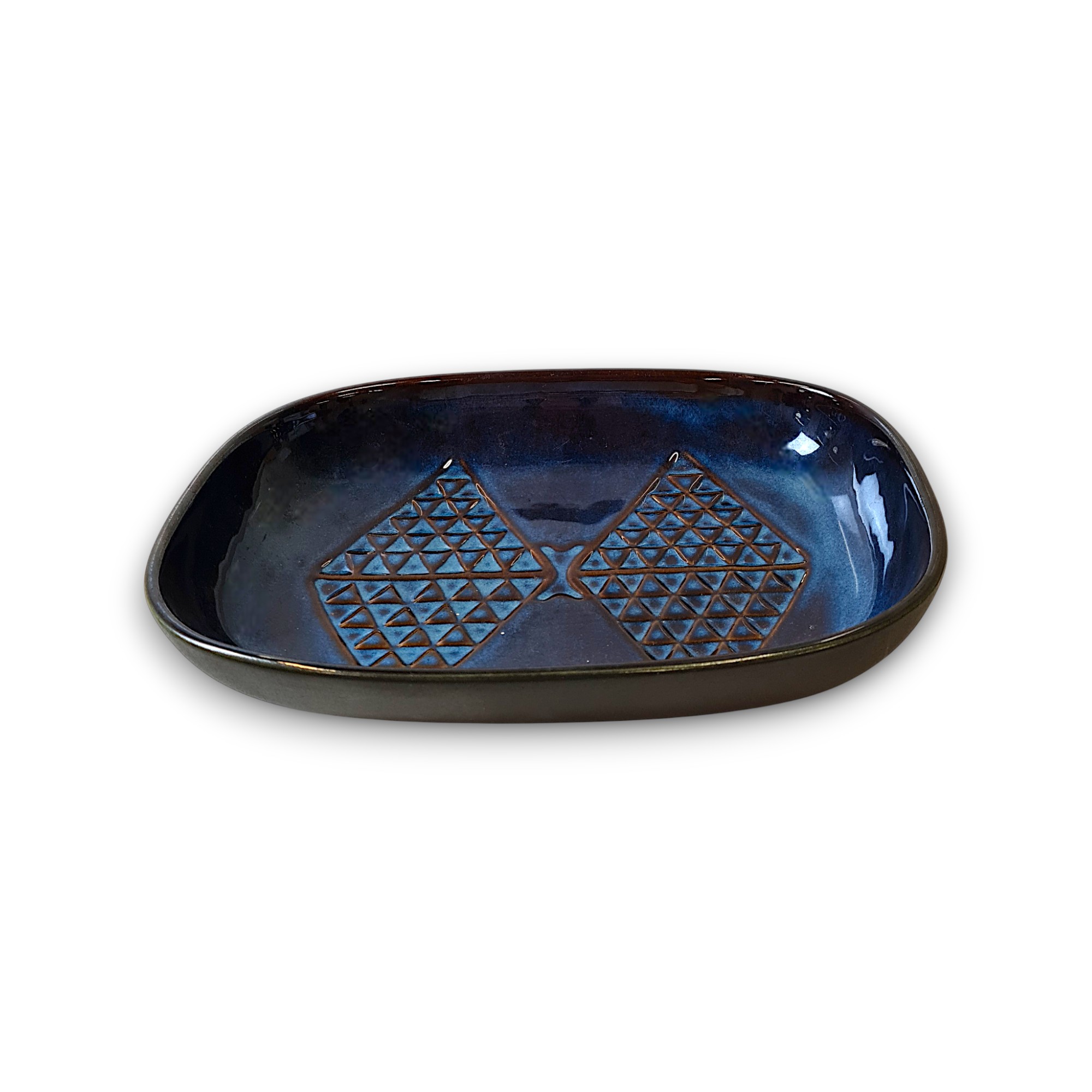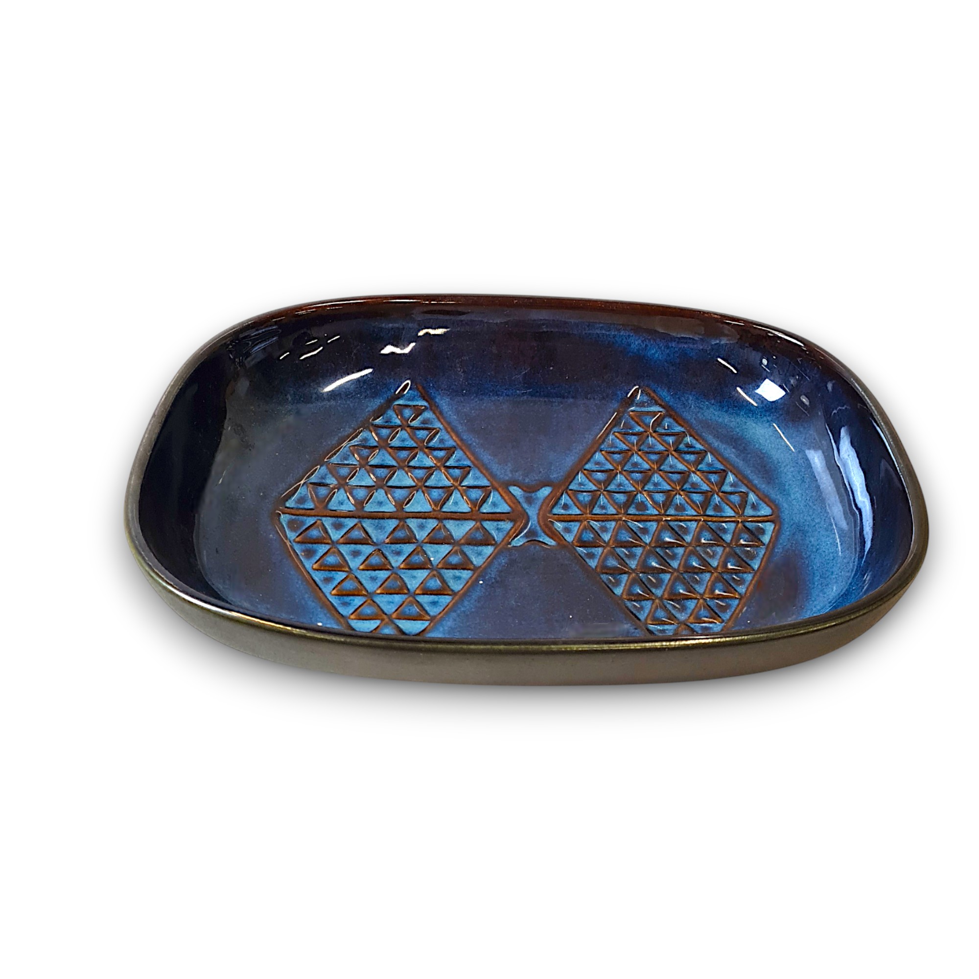 Flot rektangulært bordfad fra Søholm Keramik. Design af Einar Johansen. Fadet har et smukt harlekin mønster og glasur i smukke blå farver.