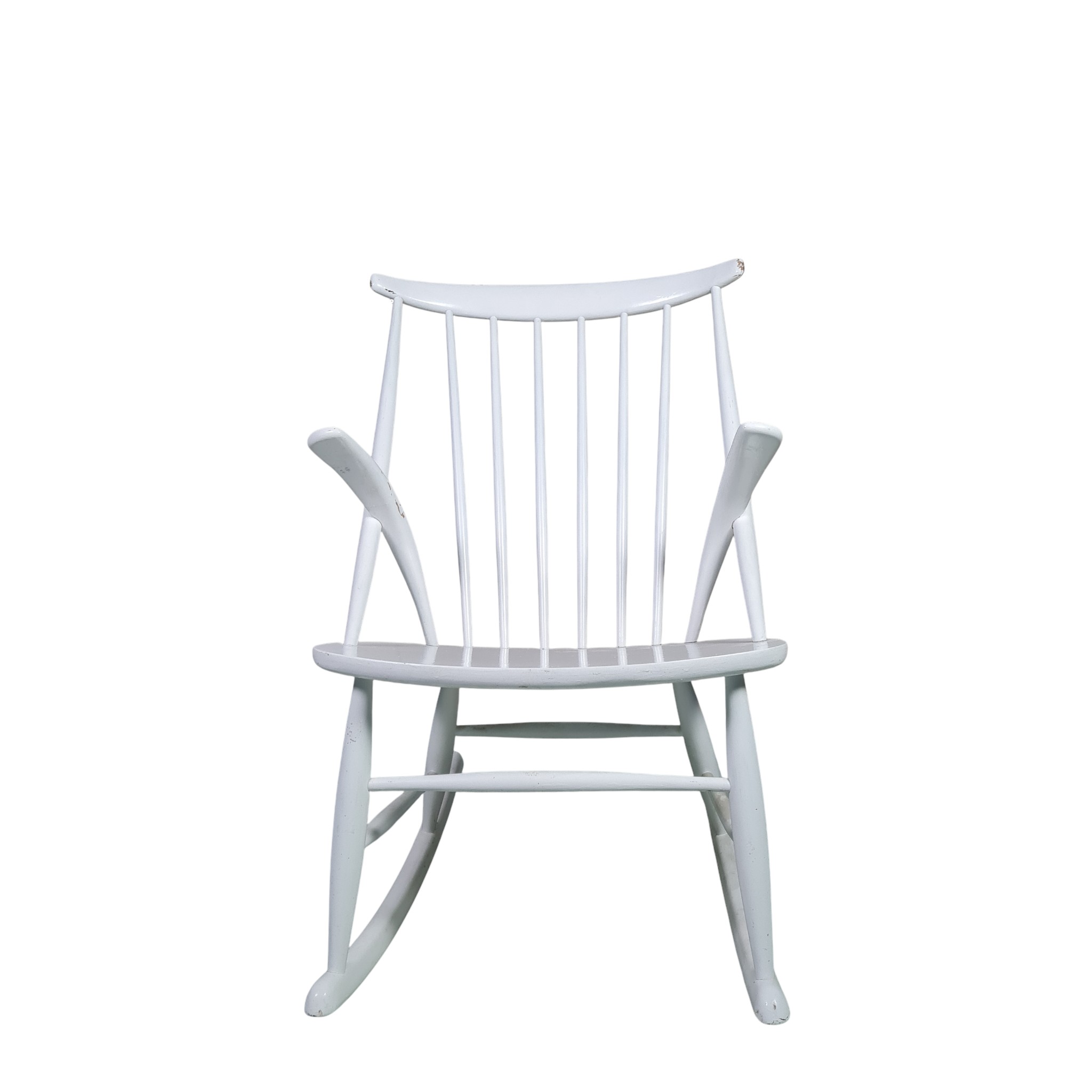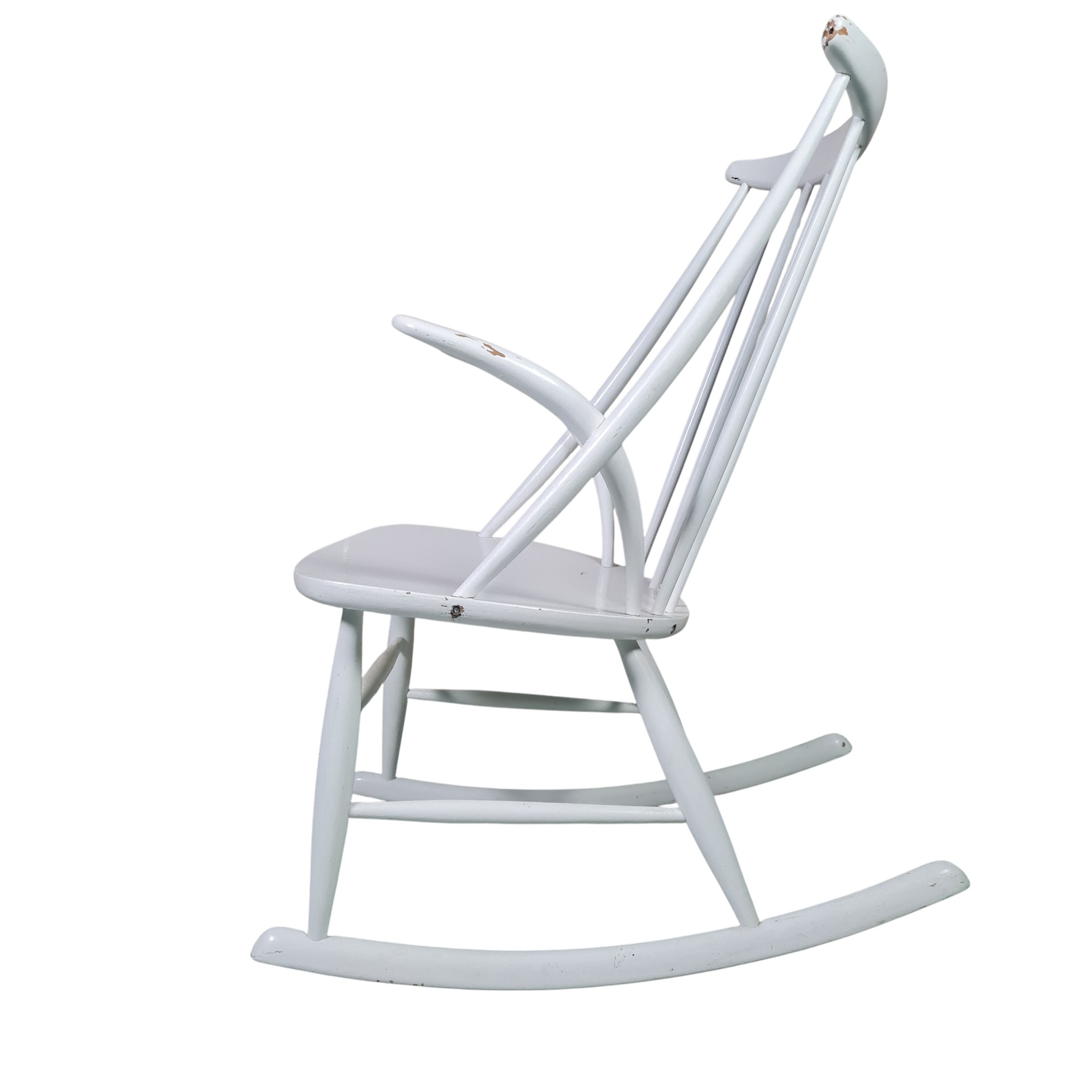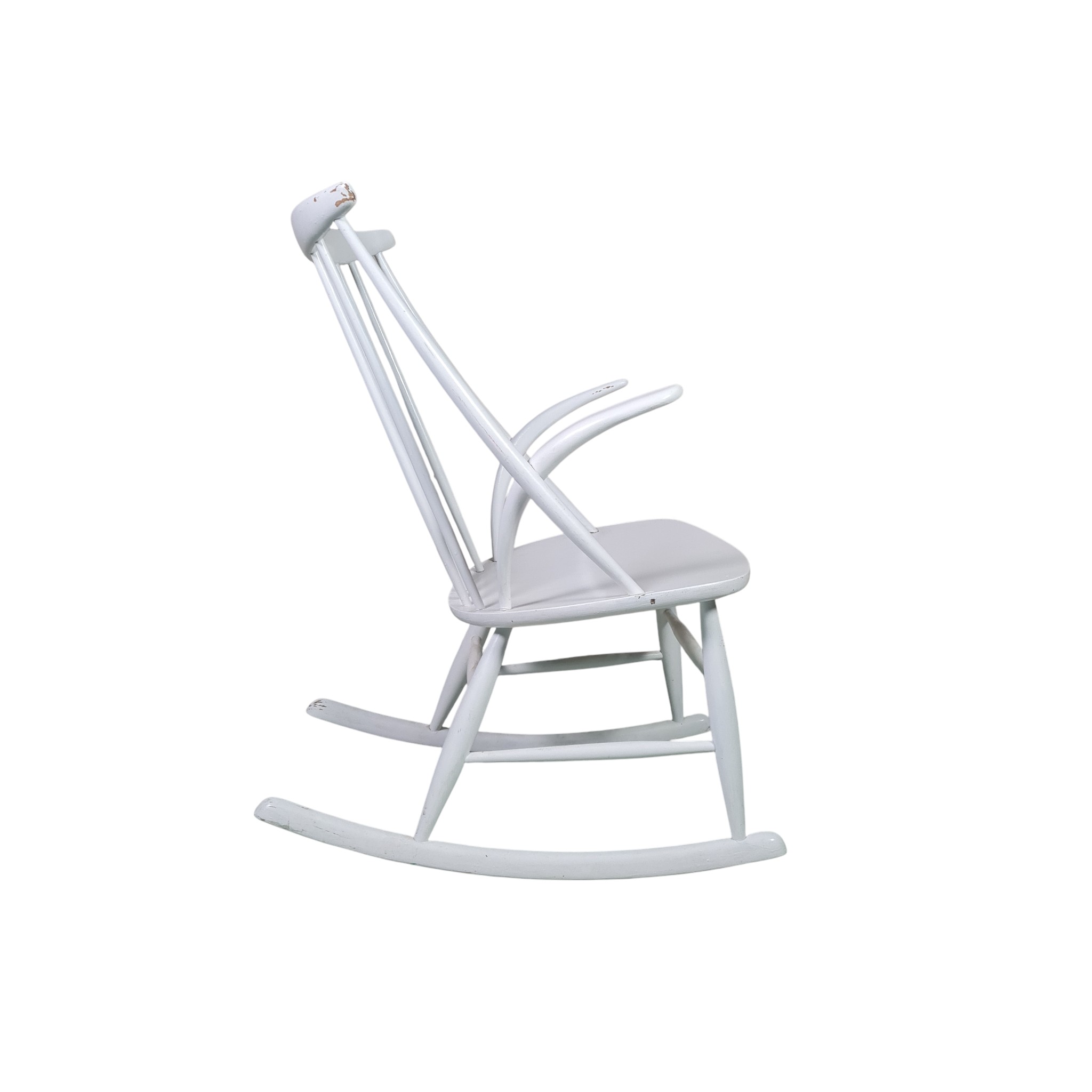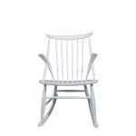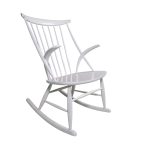 Den klassiske og ikoniske gyngestol tegnet af Illum Wikkelsø i 1958 og fremstillet hos Eilertsen. Udført i hvidlakeret træ.