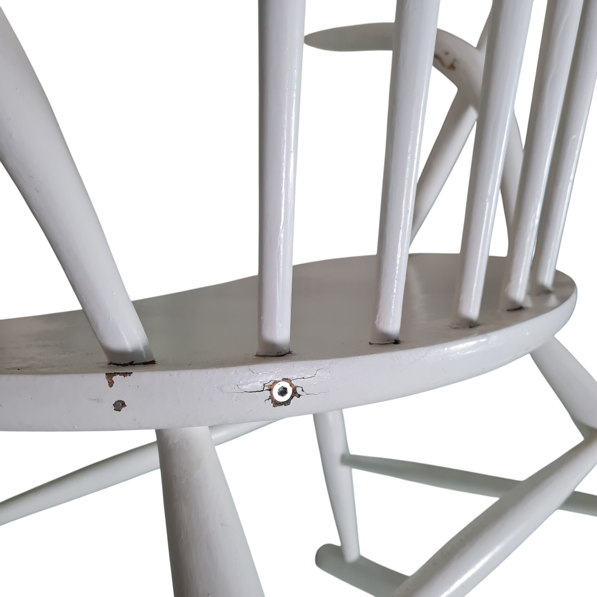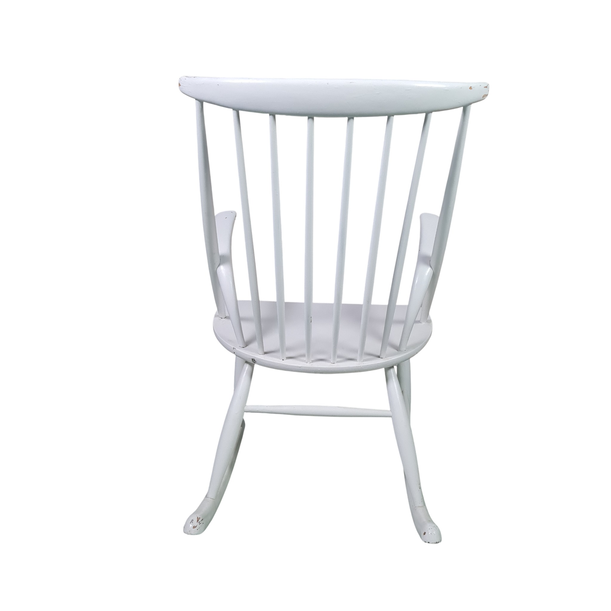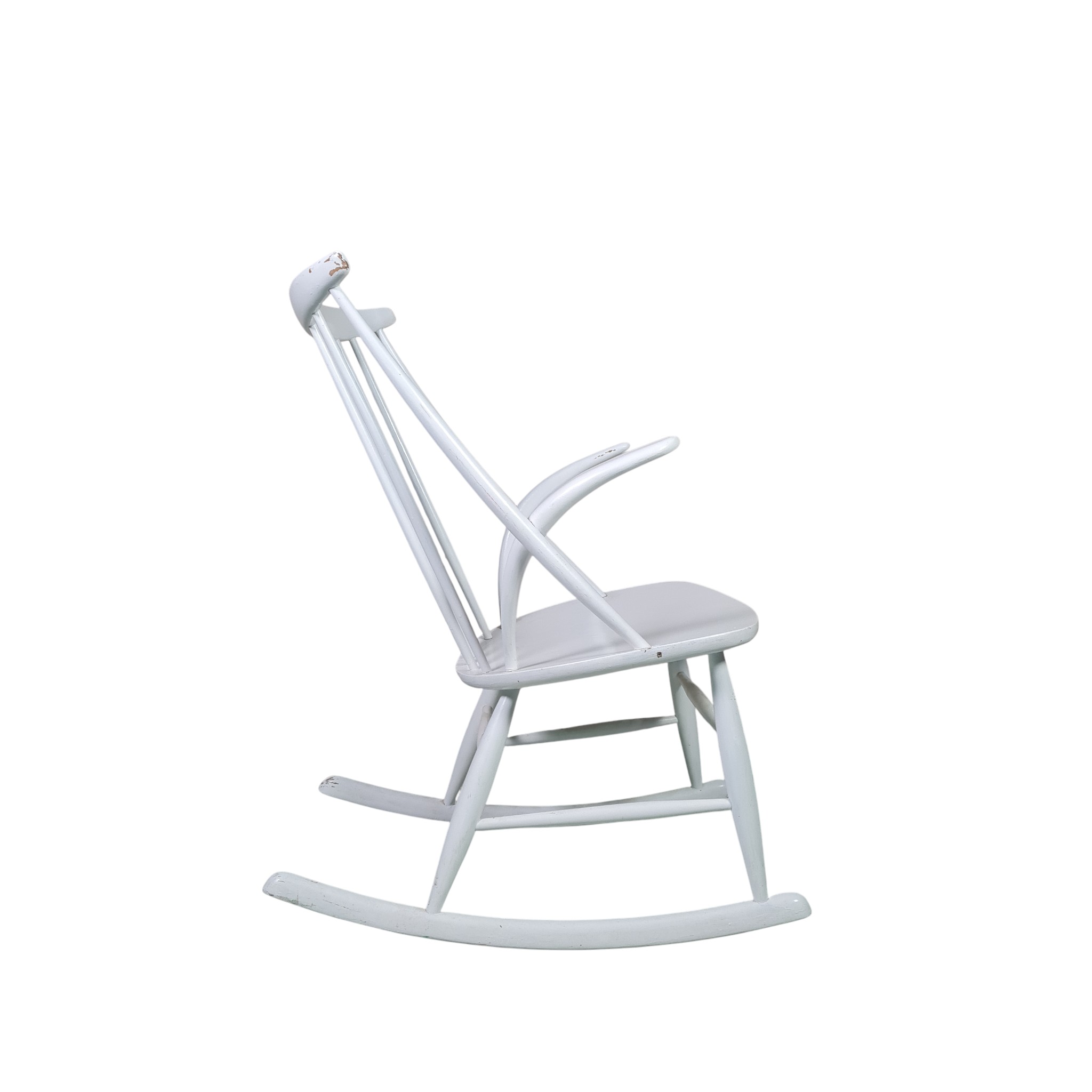 Den klassiske og ikoniske gyngestol tegnet af Illum Wikkelsø i 1958 og fremstillet hos Eilertsen. Udført i hvidlakeret træ.