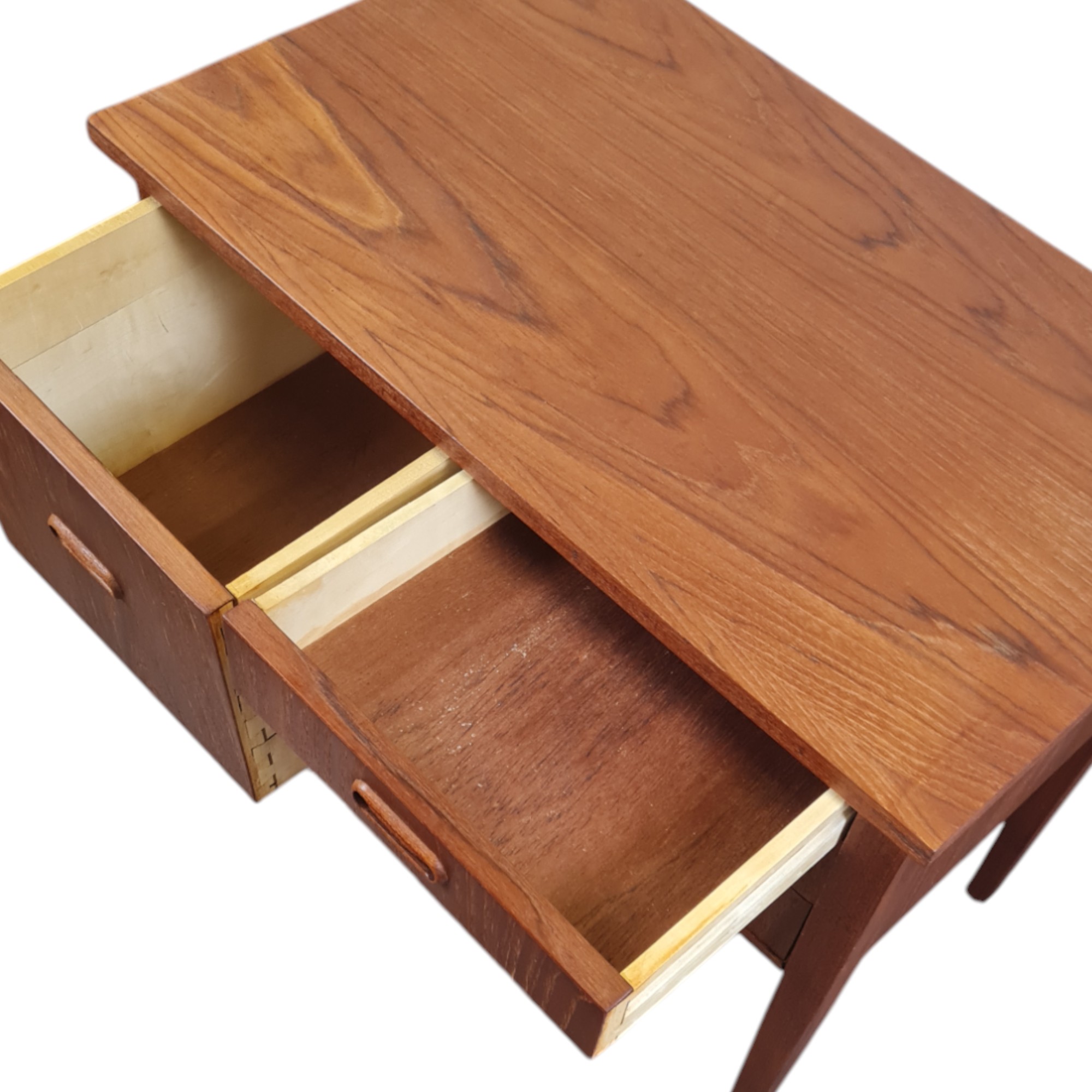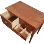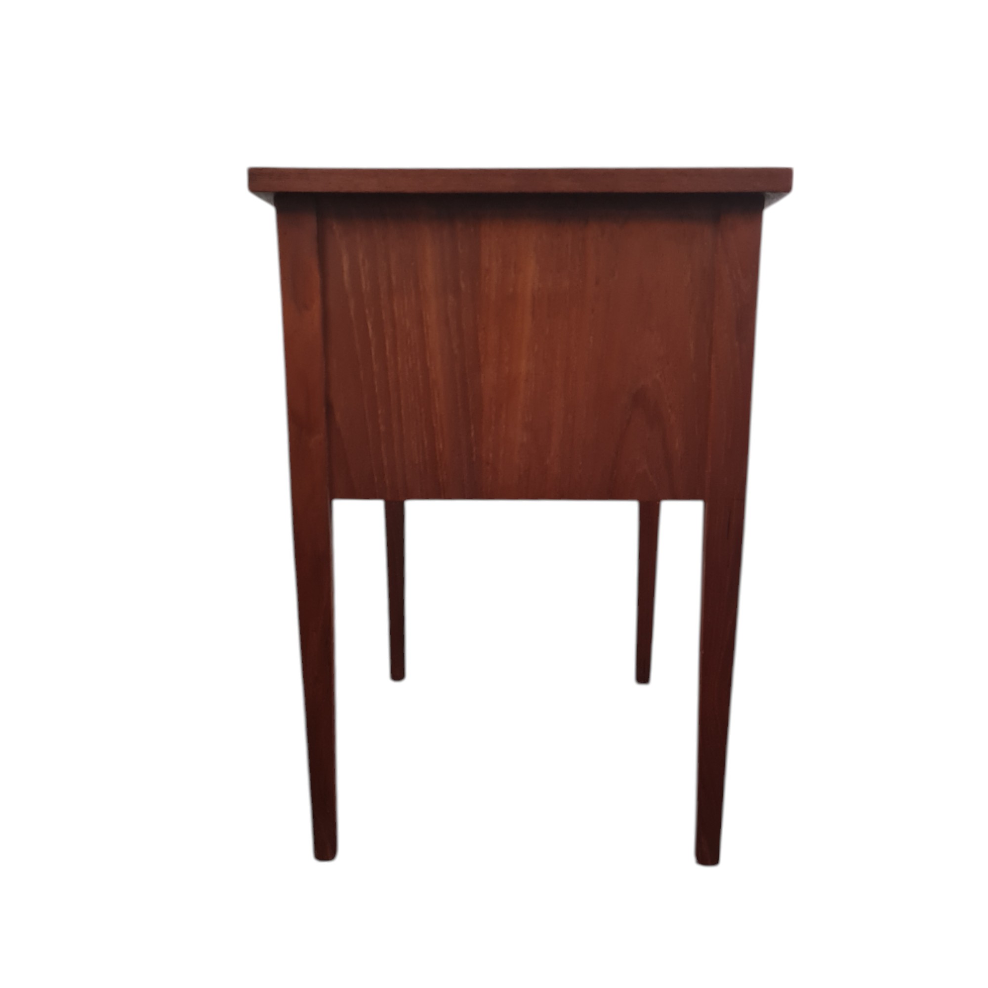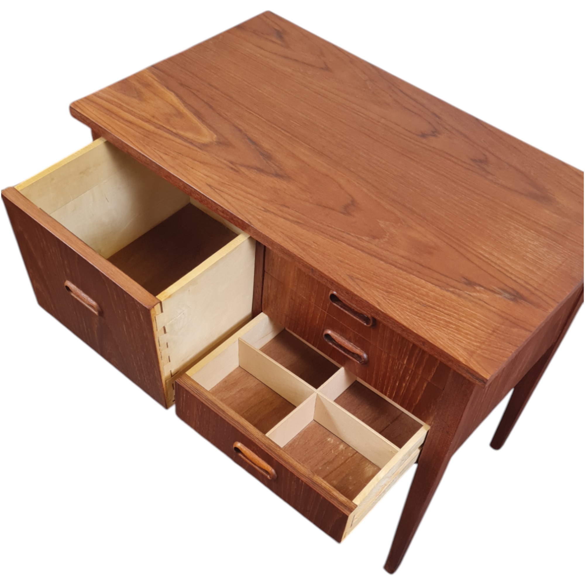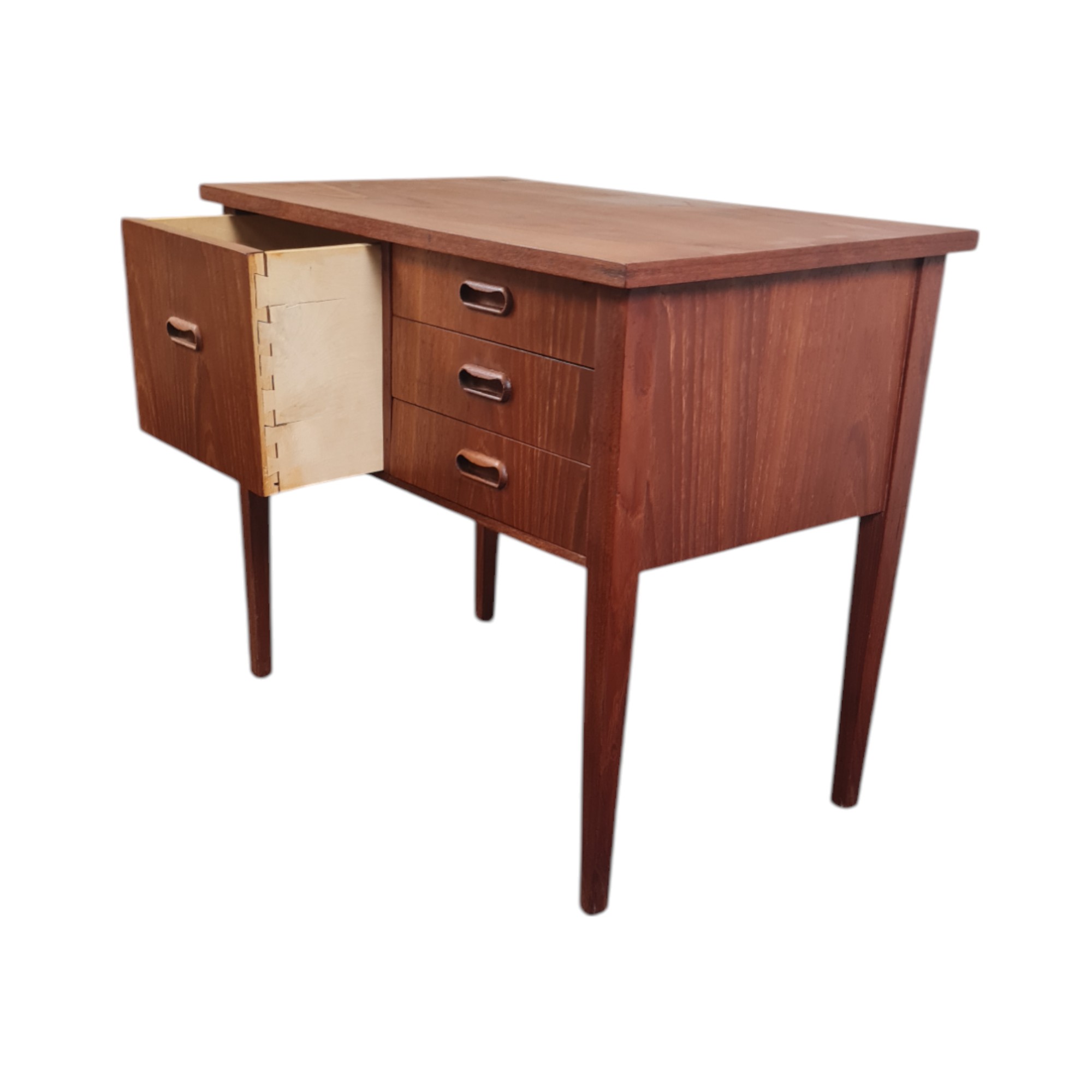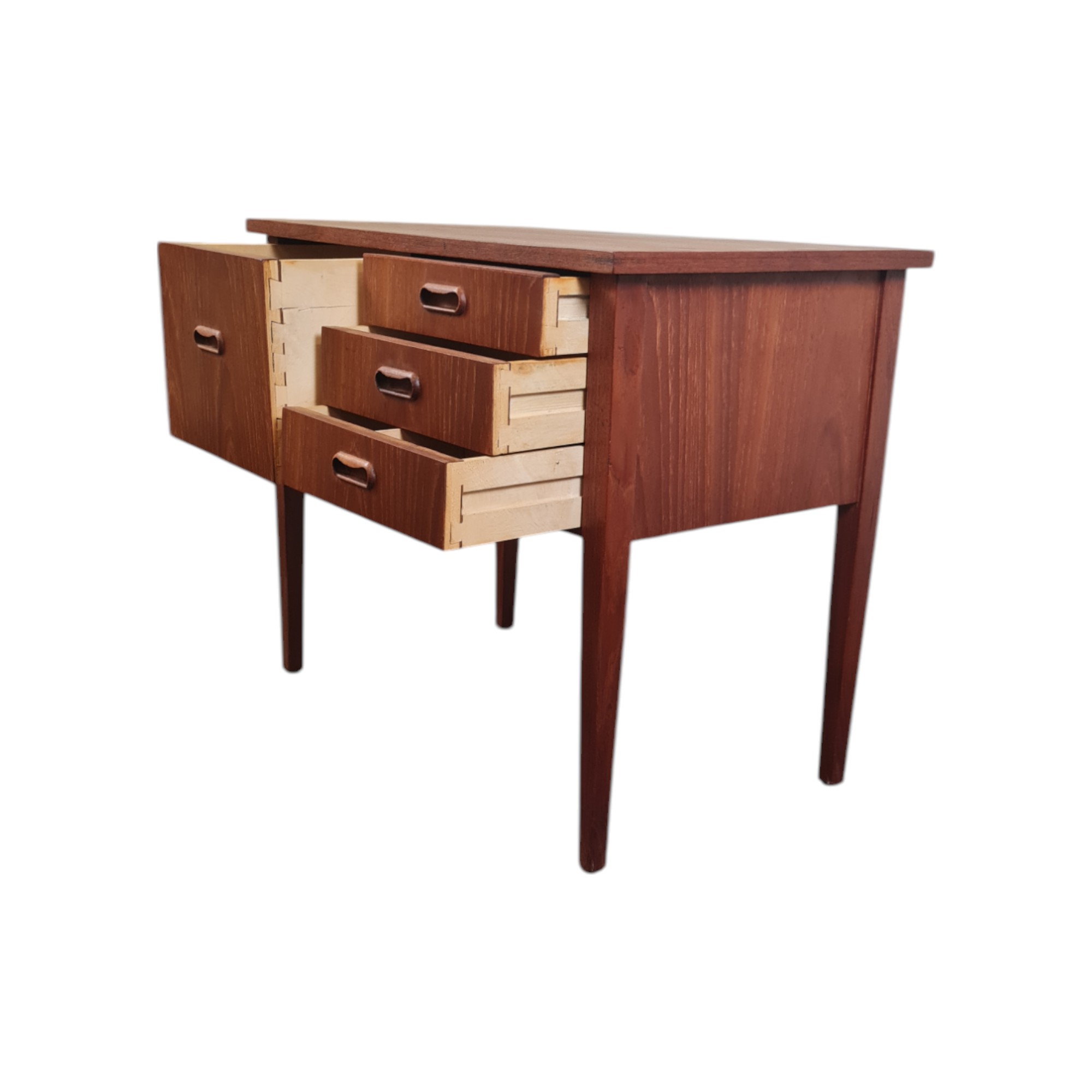 Fin og elegant kommode fra 1960’erne med fire skuffer i front. Udført i teakfiner med klassiske greb og rene linjer – et smukt eksempel på dansk snedkerhåndværk og tidstypisk design.