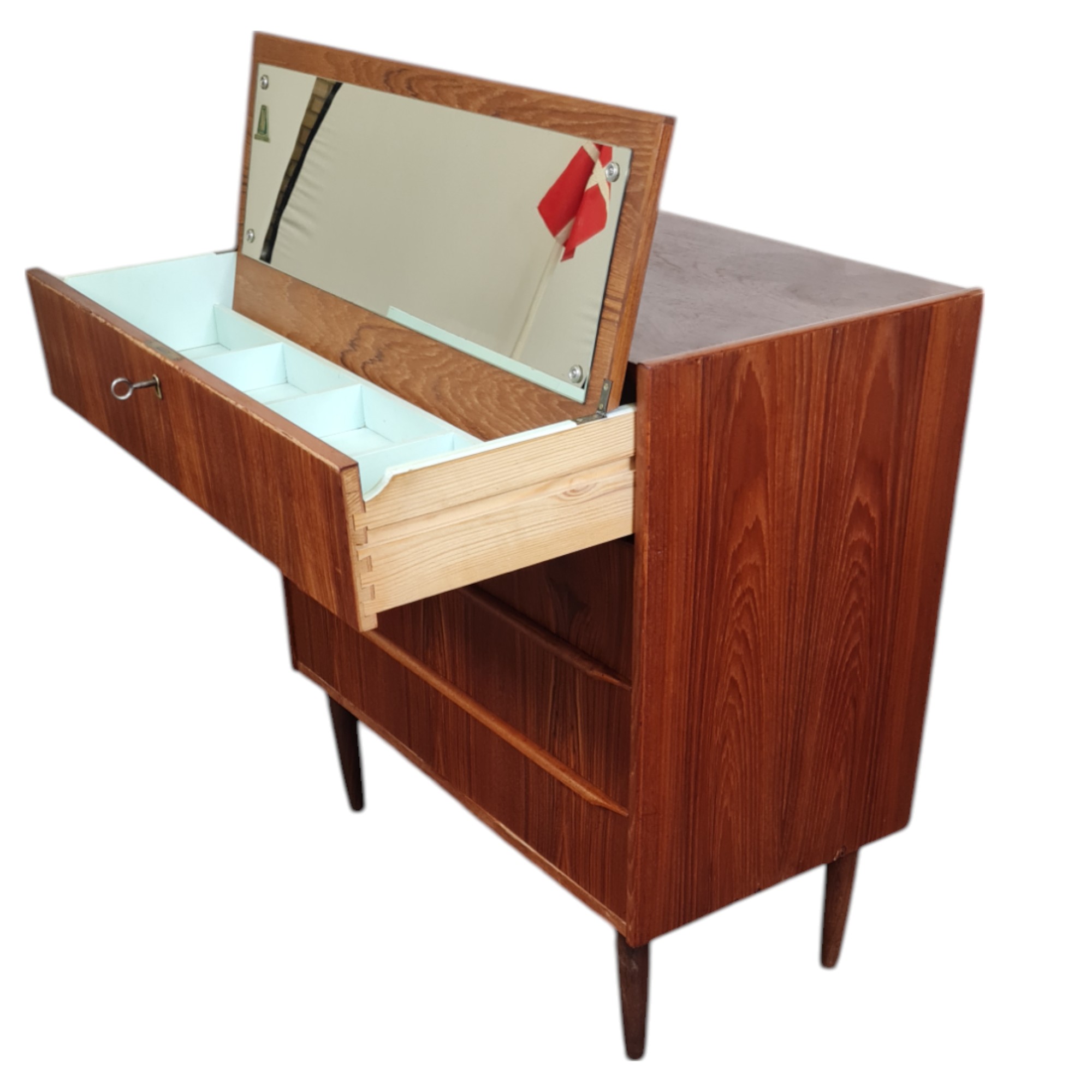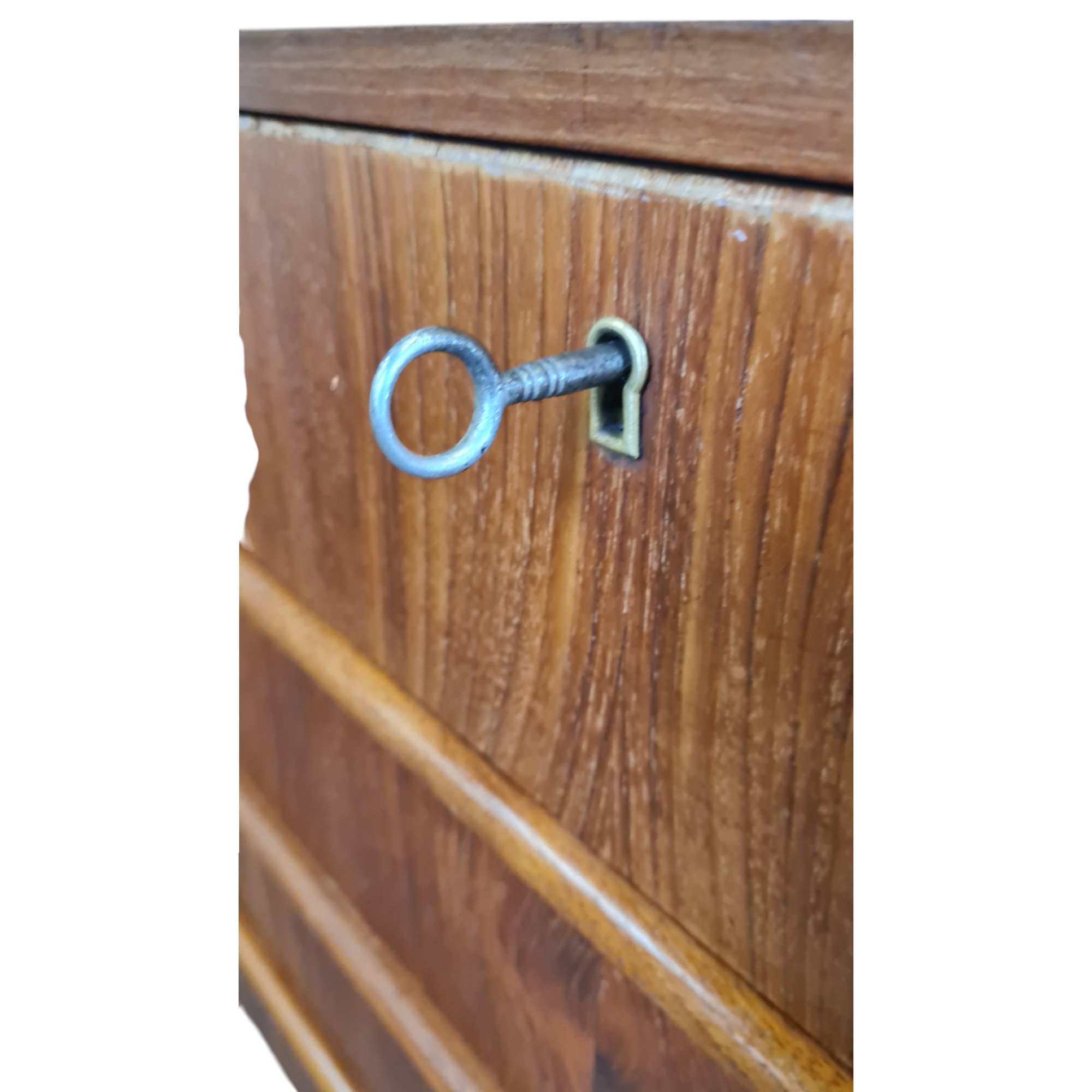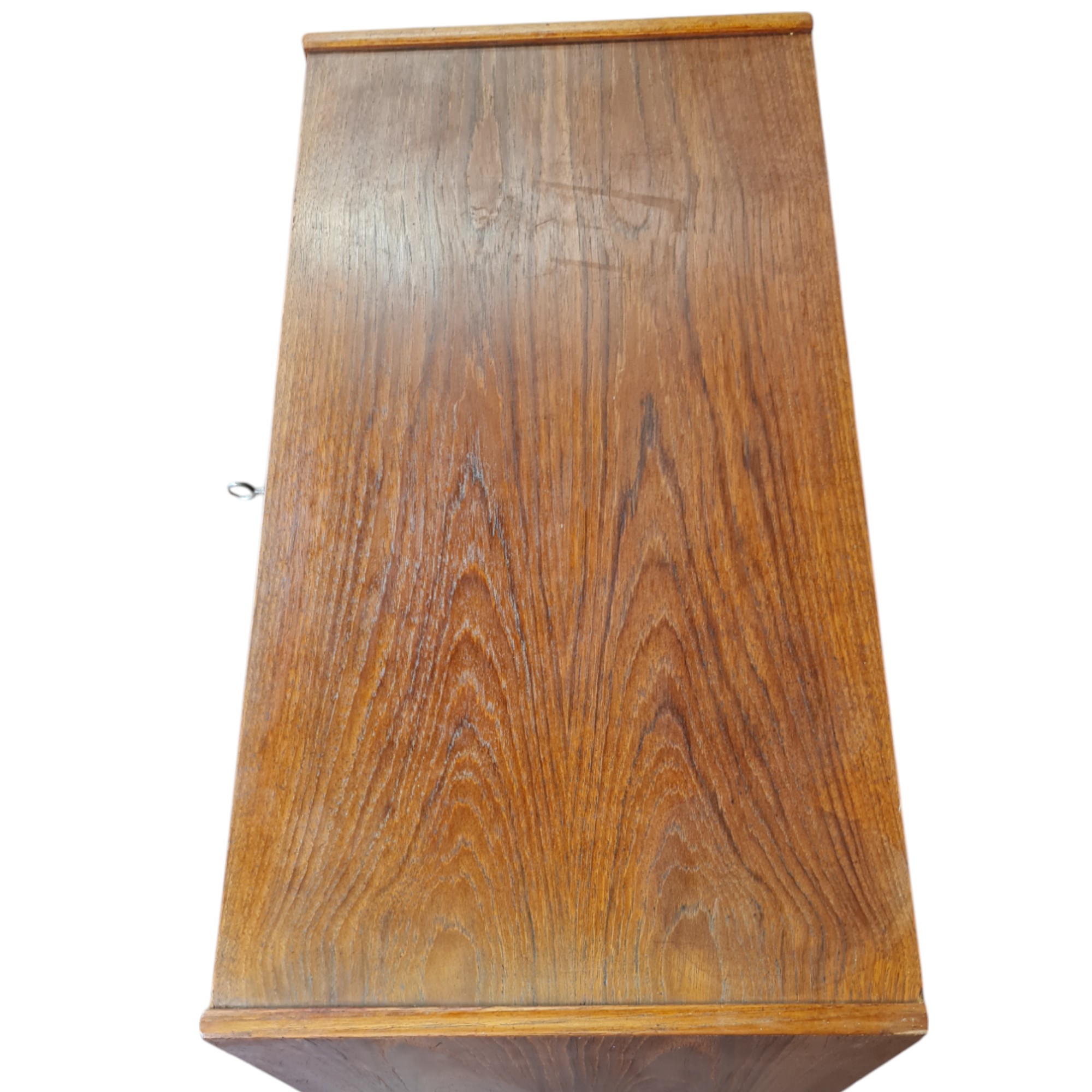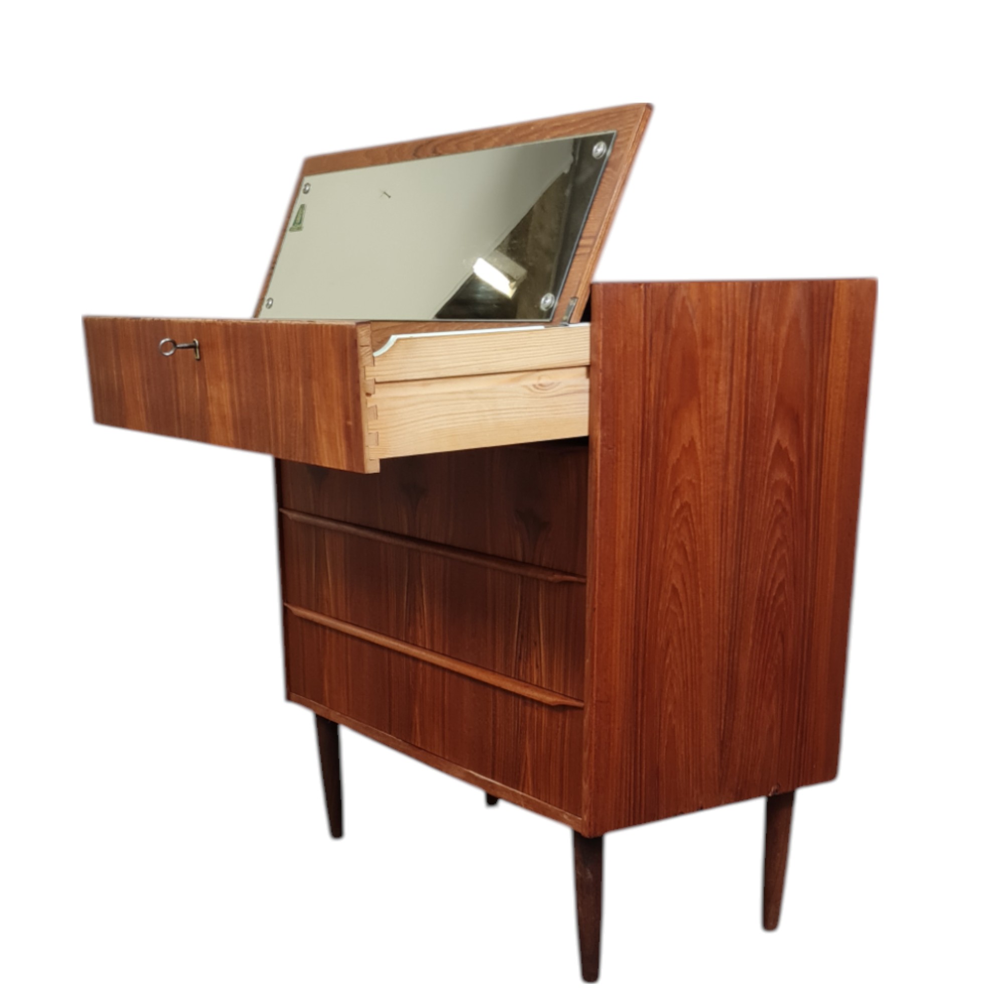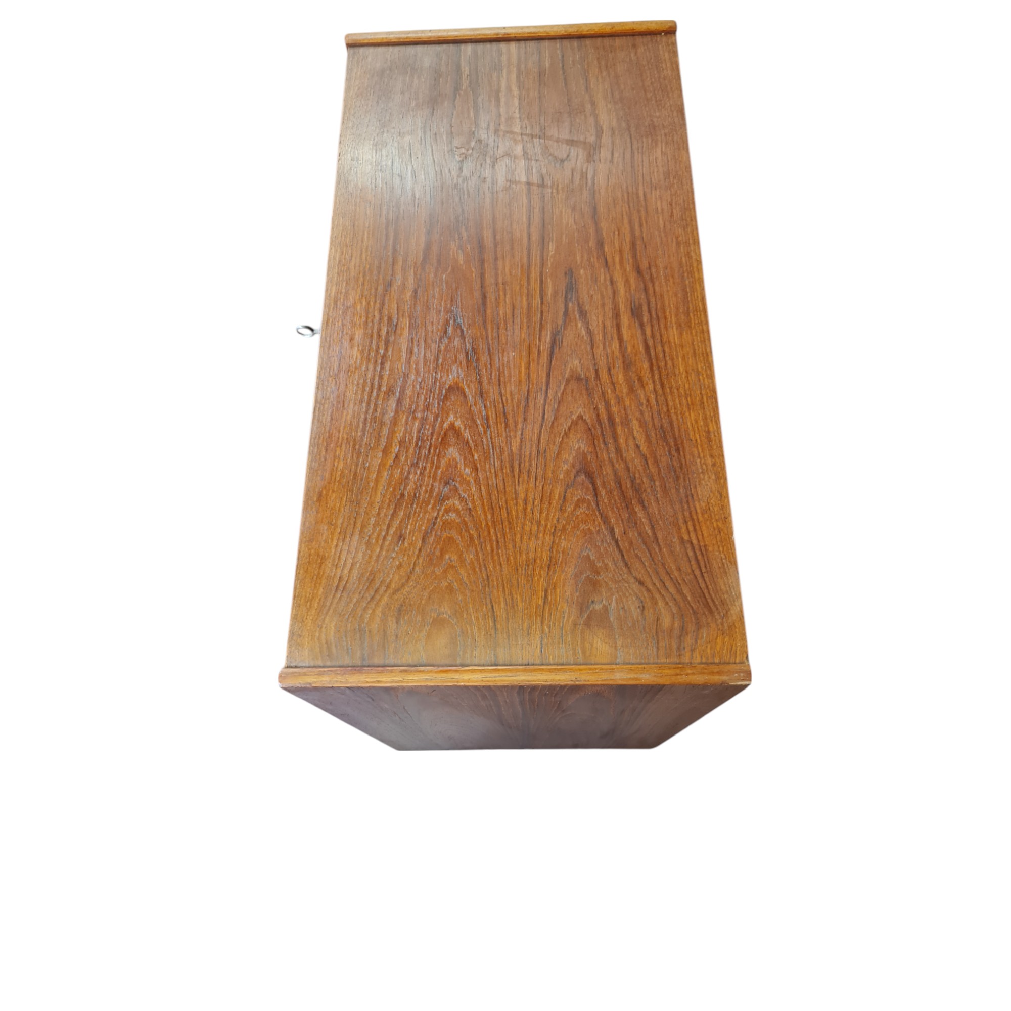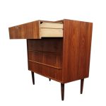 Fin lille kommode i klassisk dansk design fra 1950’erne, udført i fineret teak med varm glød og et enkelt, harmonisk formsprog. Kommoden har fire rummelige skuffer og fremstår som en både funktionel og dekorativ løsning til opbevaring i entré, soveværelse eller stue.