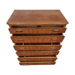 Fin og funktionel lille kommode med seks skuffer – et klassisk eksempel på dansk design fra 1950’erne. Kommoden er udført i fineret teak med smuk glød og harmoniske proportioner, og den er fremstillet hos en dansk møbelproducent med sans for kvalitet og godt håndværk.