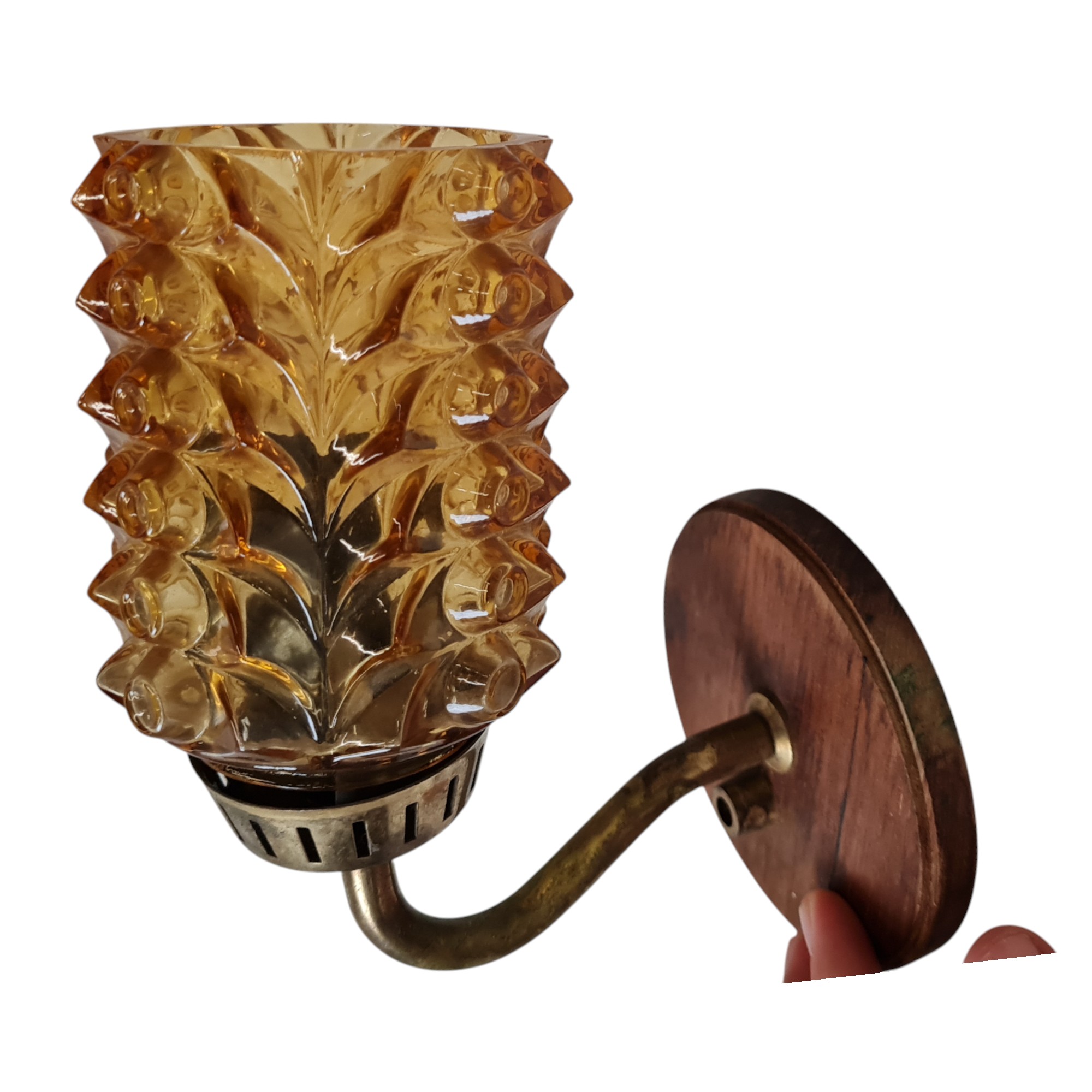 Lav retro væglampe i dansk design monteret på teakplade og gult glas.