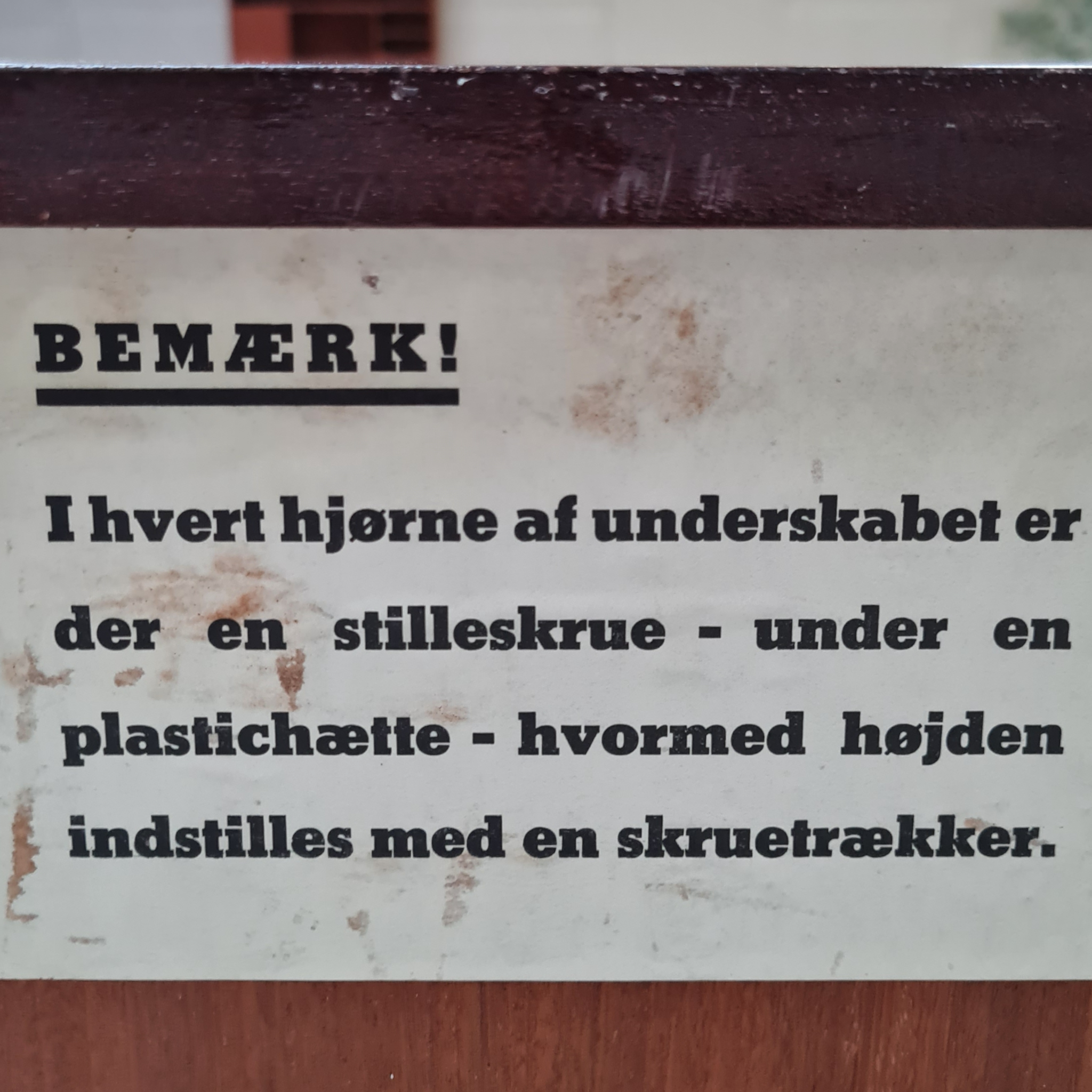 Bag de to låger gemmer sig praktisk opbevaringsplads med hylder, hvilket gør møblet ideelt som f.eks. entré- eller stueskab. Skabet fremstår i pæn stand med almindelige aldersrelaterede brugsspor og er opdateret med nye ben, som tilføjer et let og moderne udtryk uden at gå på kompromis med det originale design.