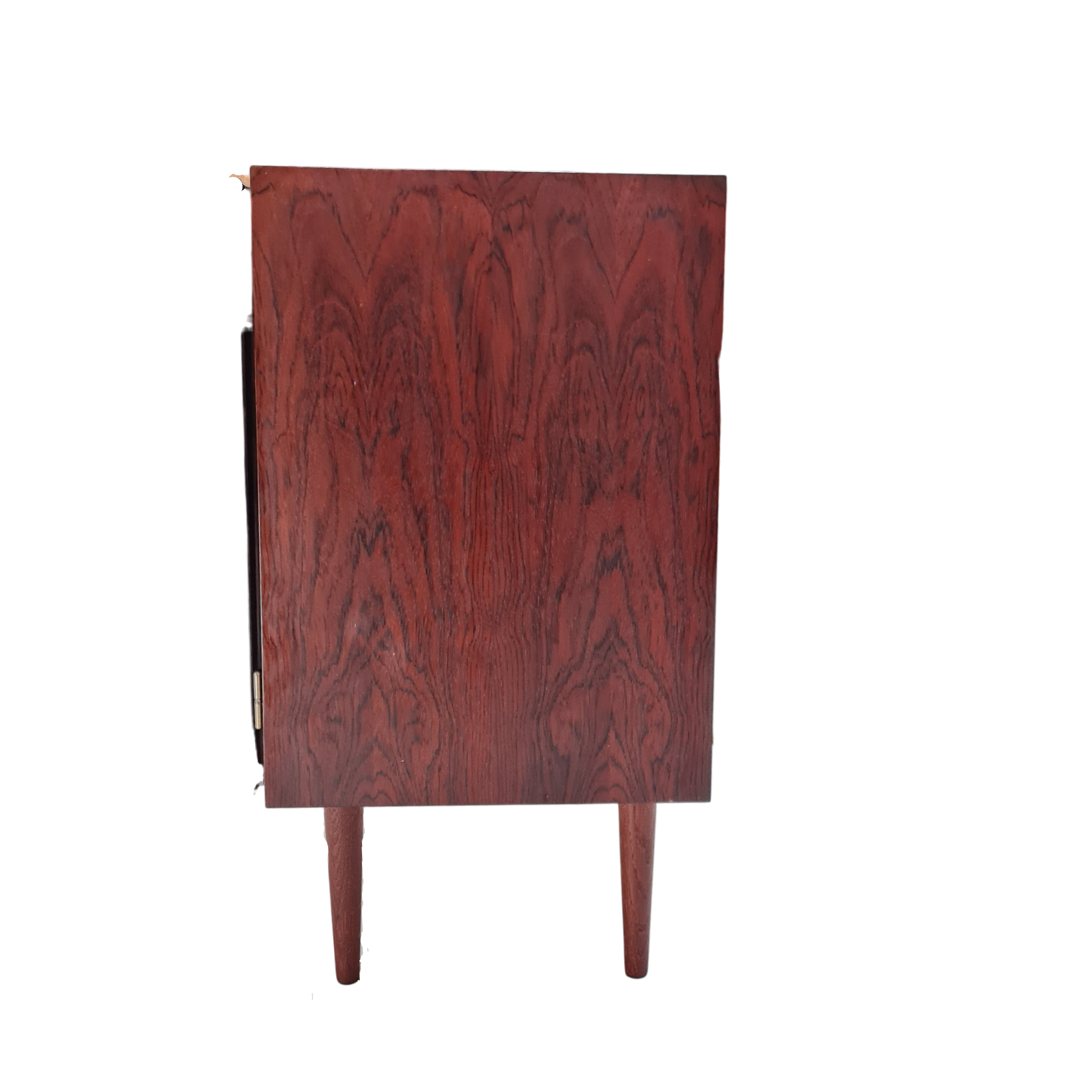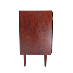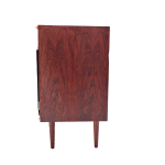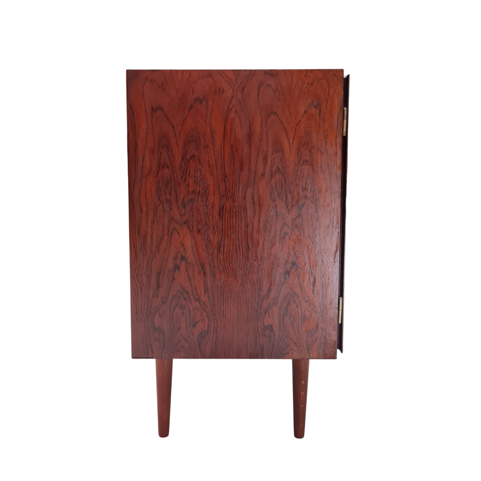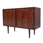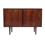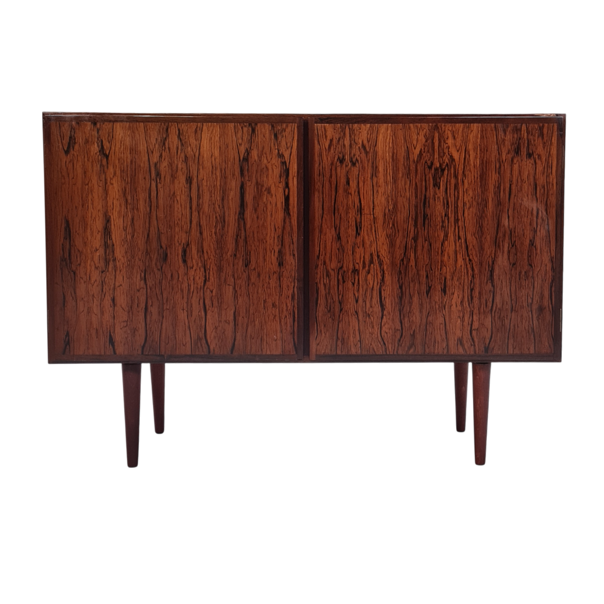 Dette lave skab fra 1964 er et klassisk eksempel på dansk møbeldesign, formgivet med fokus på både funktionalitet og æstetik. Udført i fineret palisander (Dalbergia Latifolia) med elegante, skjulte greb, og produceret hos Omann Junior – en møbelproducent kendt for deres høje håndværksmæssige kvalitet og tidløse formsprog.