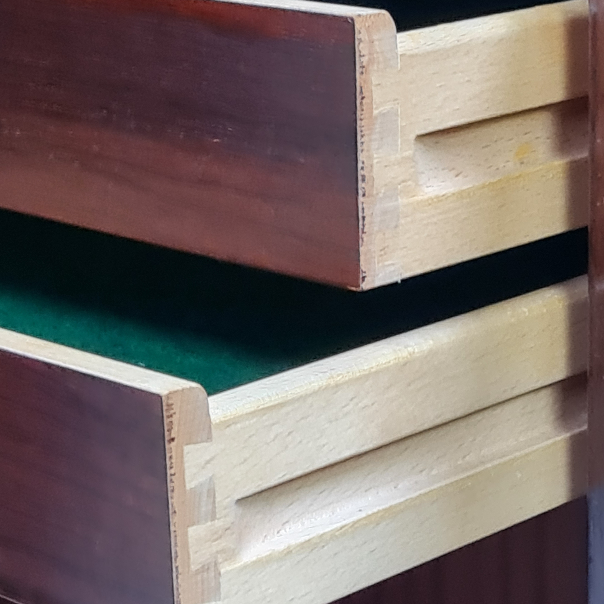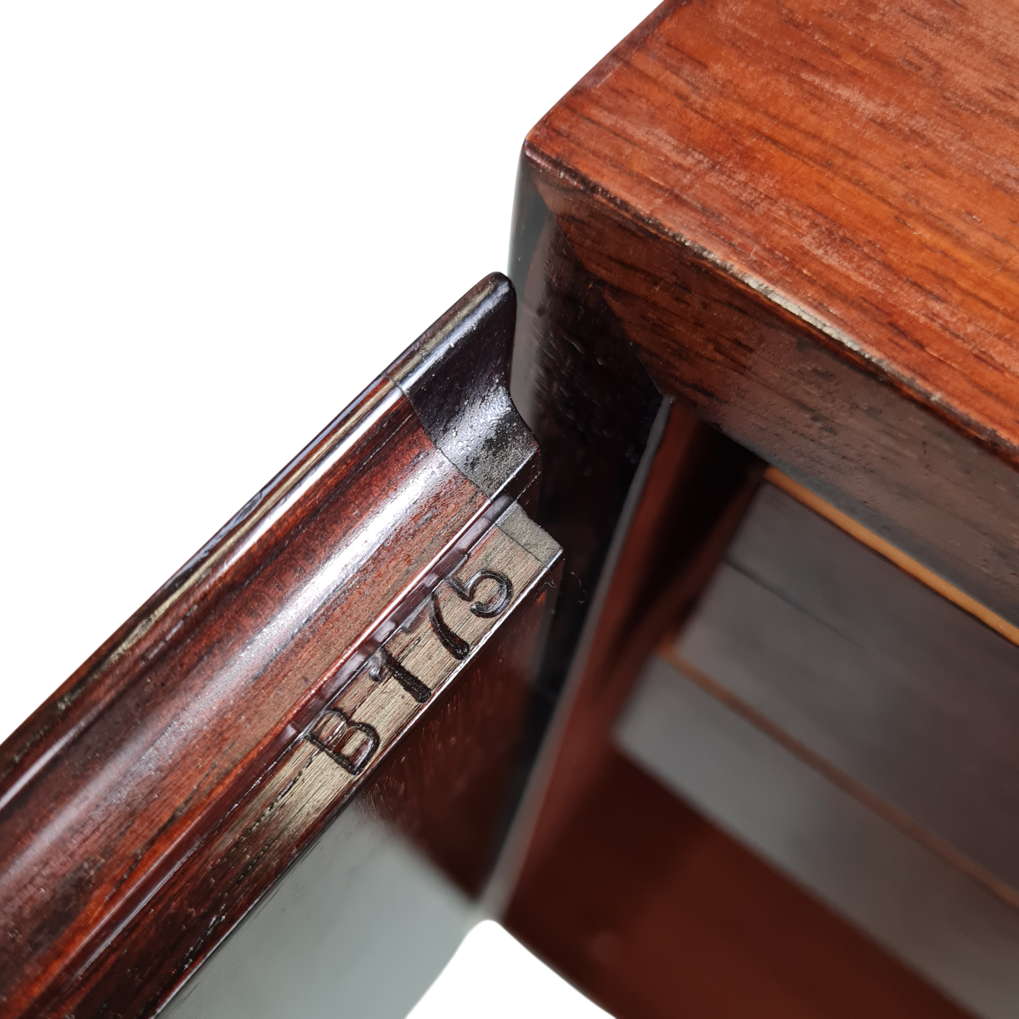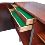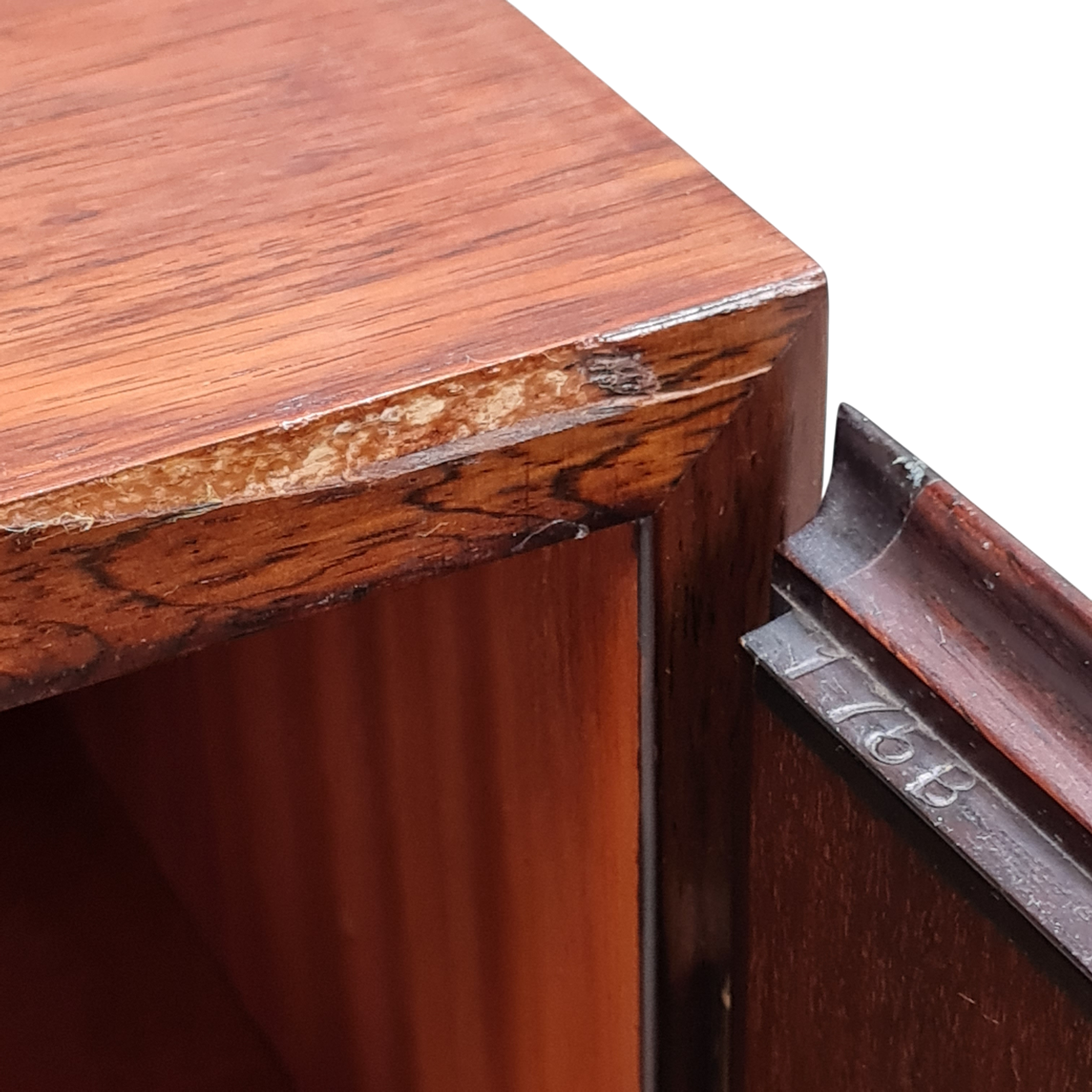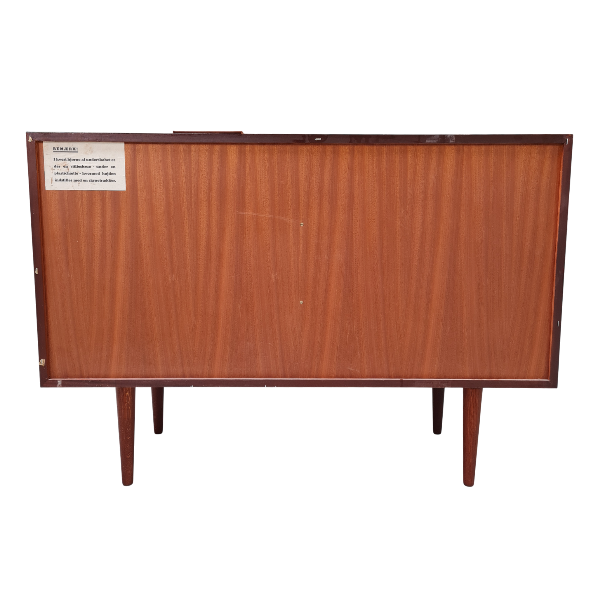 Dette lave skab fra 1964 er et klassisk eksempel på dansk møbeldesign, formgivet med fokus på både funktionalitet og æstetik. Udført i fineret palisander (Dalbergia Latifolia) med elegante, skjulte greb, og produceret hos Omann Junior – en møbelproducent kendt for deres høje håndværksmæssige kvalitet og tidløse formsprog.