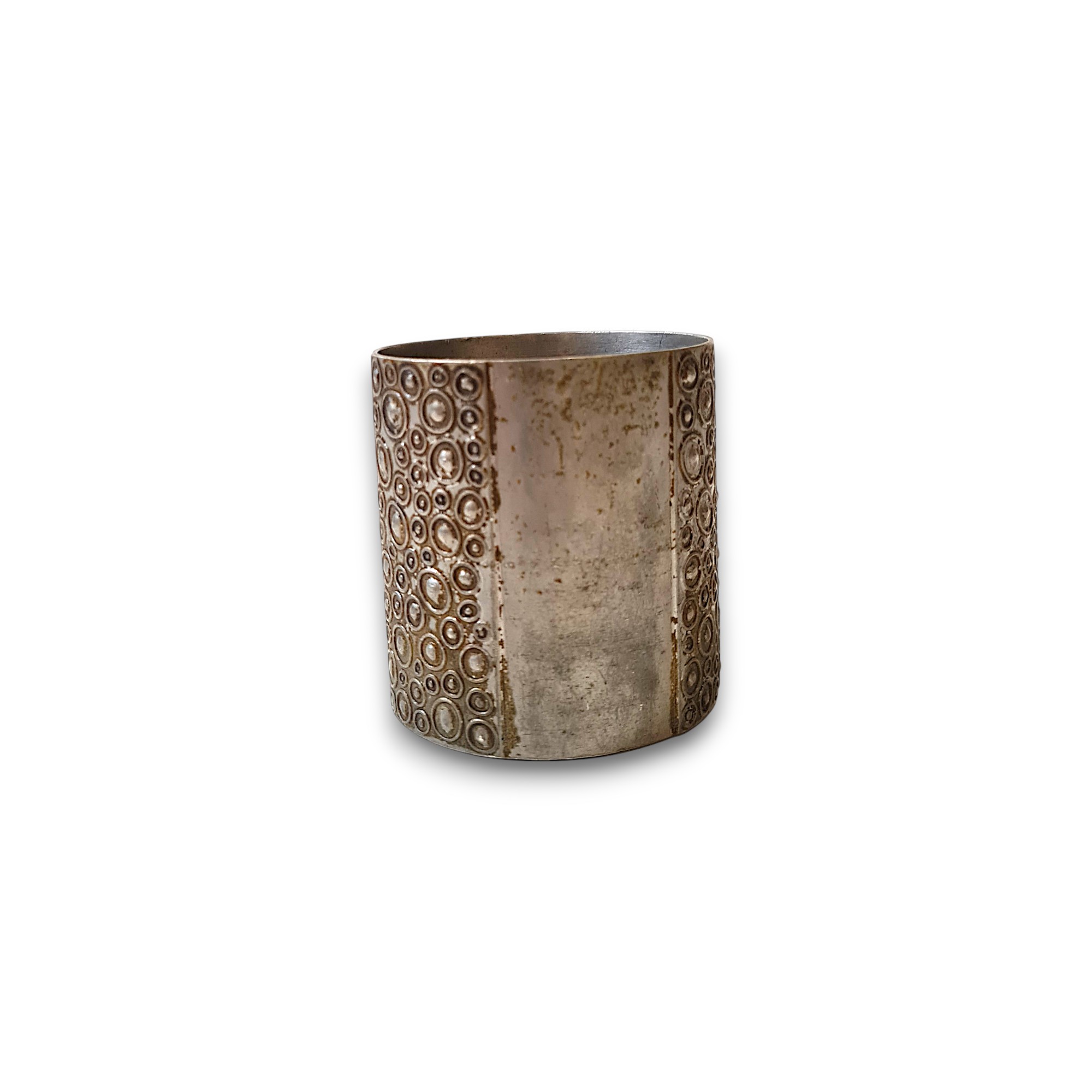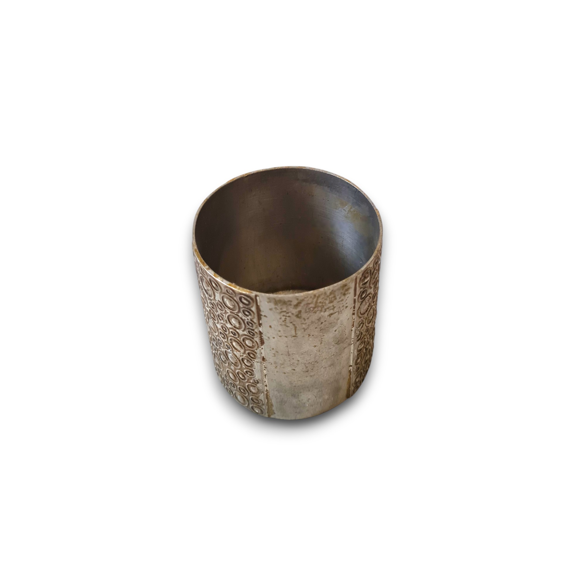Lille fint metalbæger med ornamenter på siden. Designet af Just Andersen i formentlig 1930’erne.