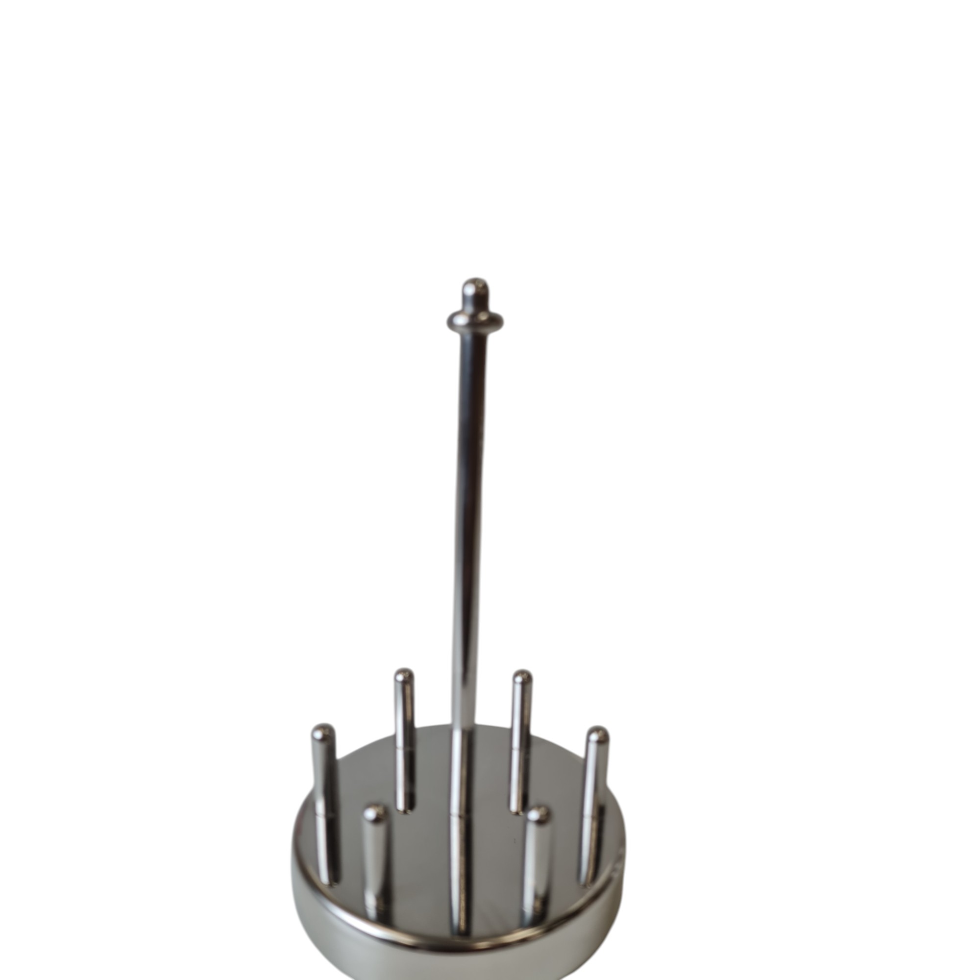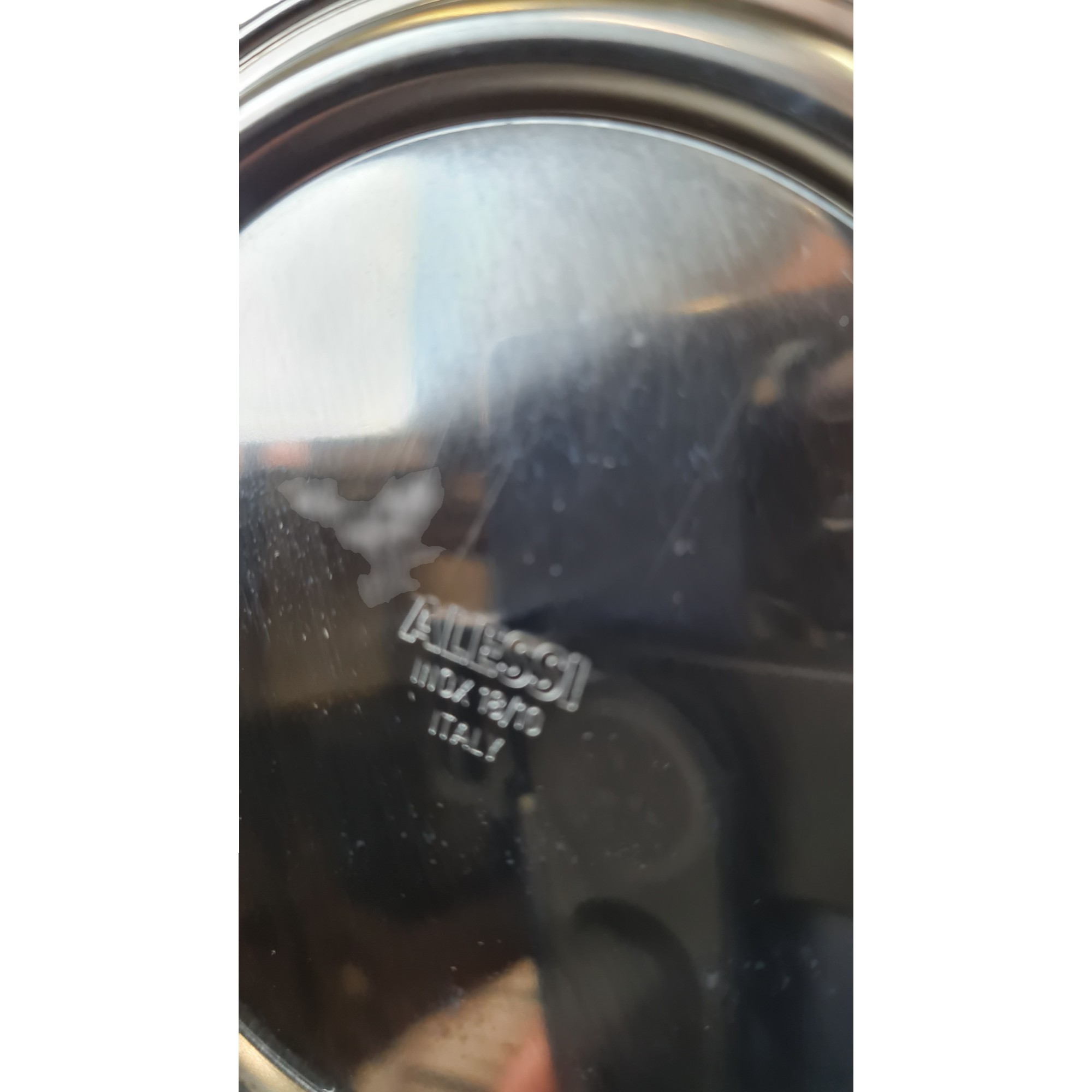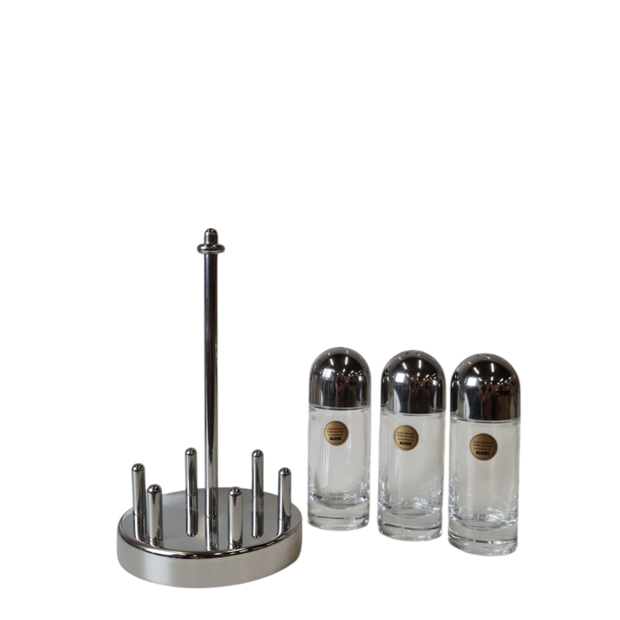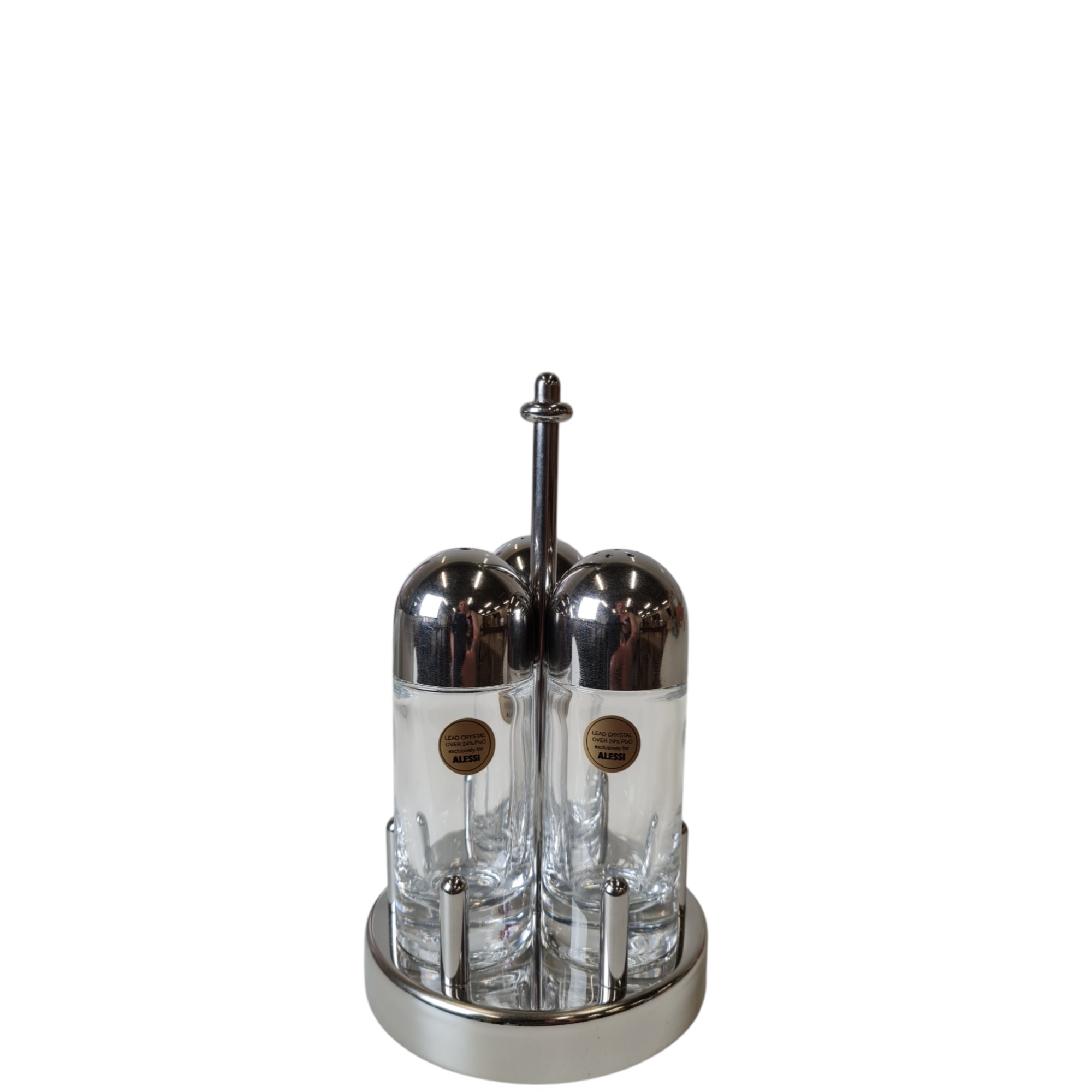 Smuk Plat de menage model 5073 til salt, peber og tandstikker tegnet af Ettore Sottsass i 1978 for Alessi. Sættet er udført i det flotteste spejlpoleret stål og glassene er udført i blykrystal.