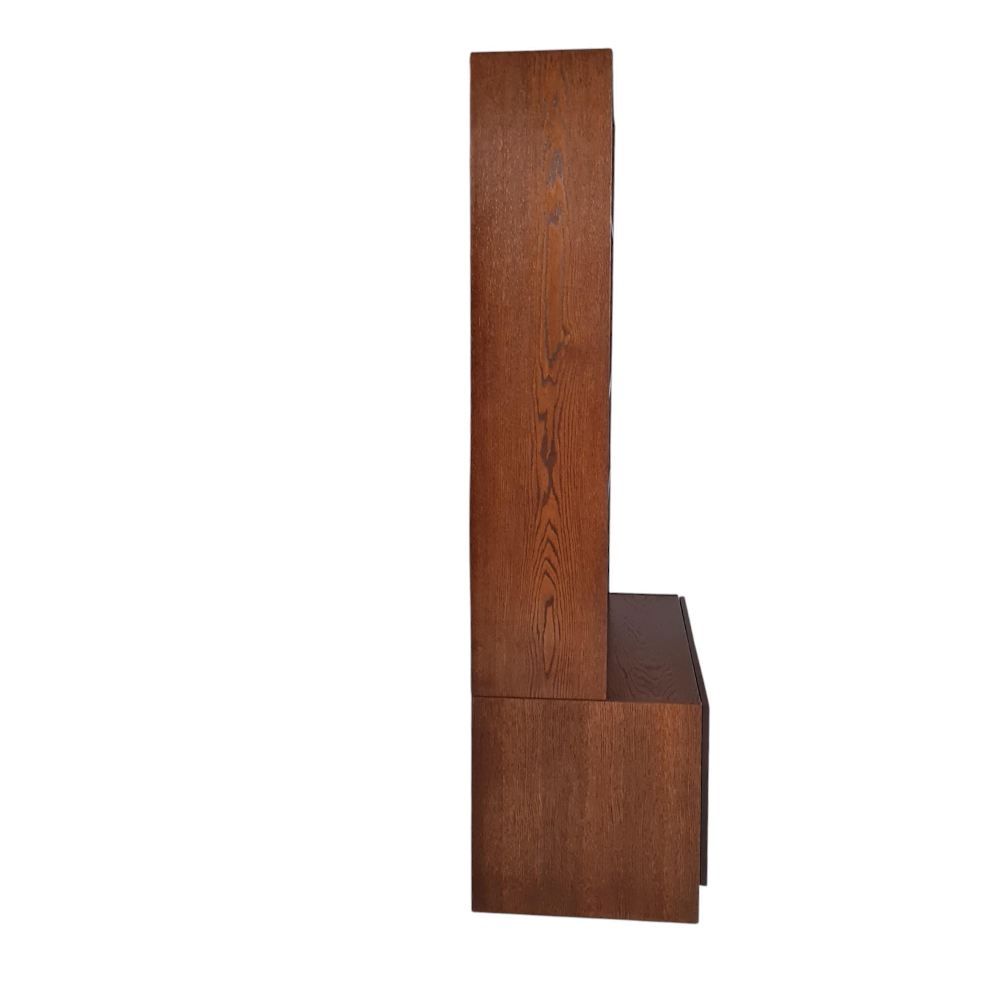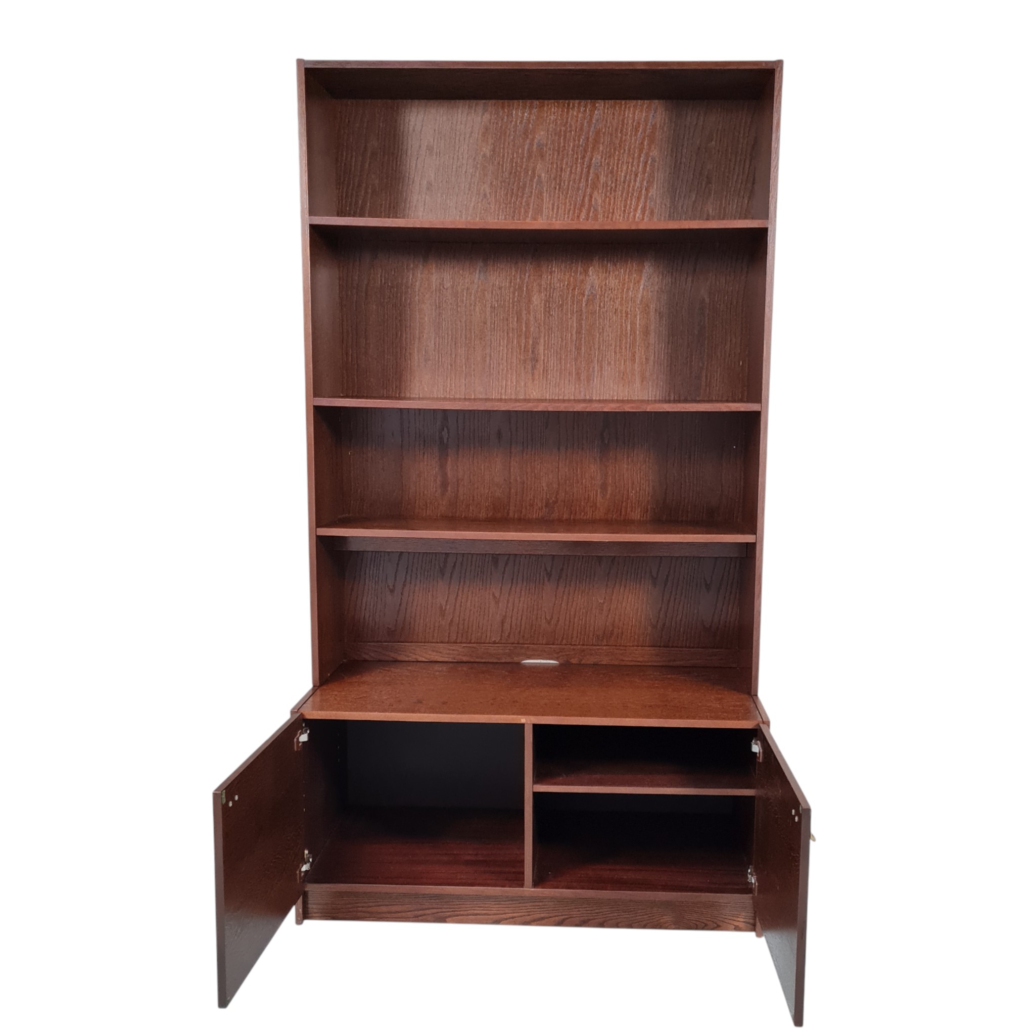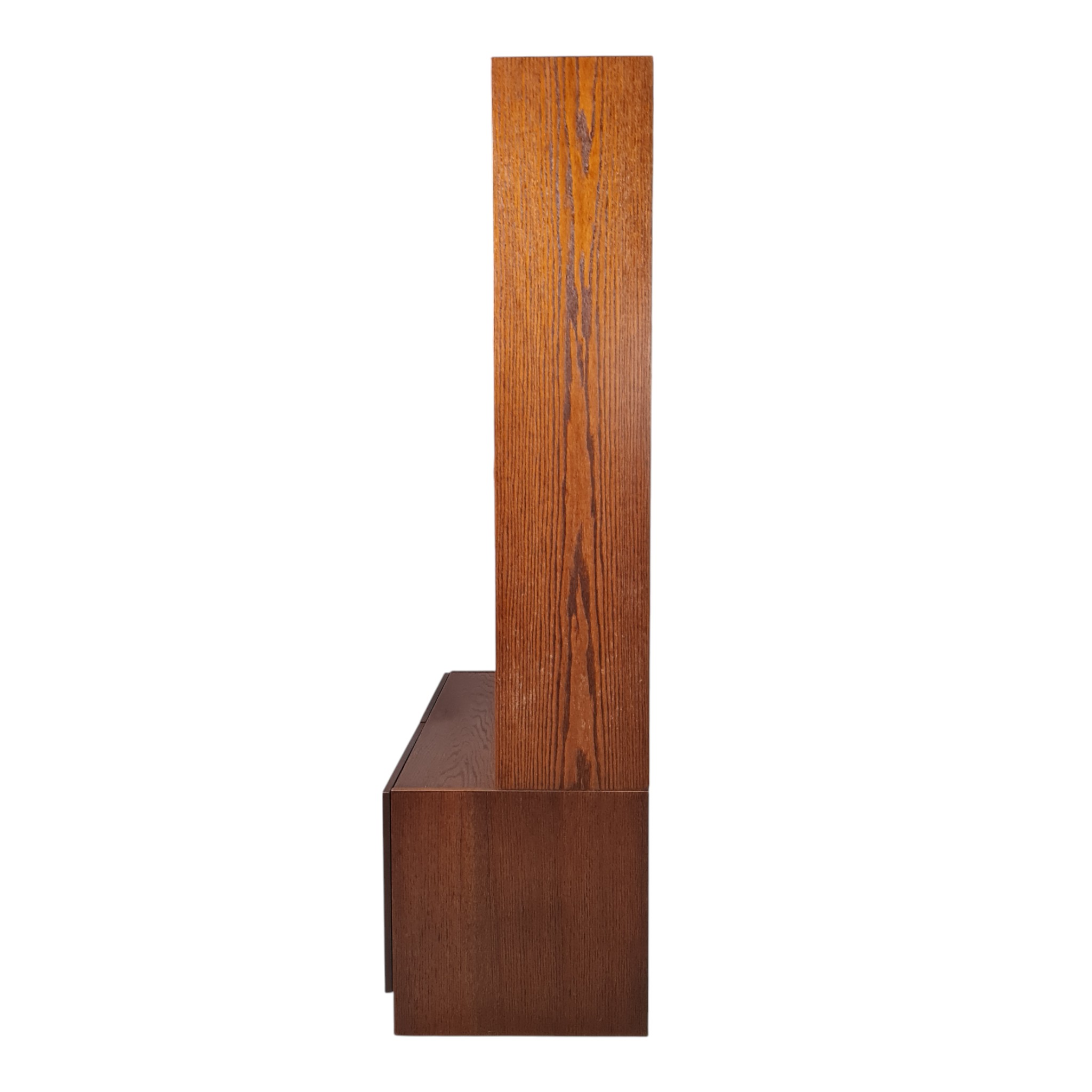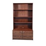 Flot og praktisk reol i mørkbejdset eg med hylder og underskab med to lager bag hvilket hylder. Formgivet 1970’erne.