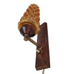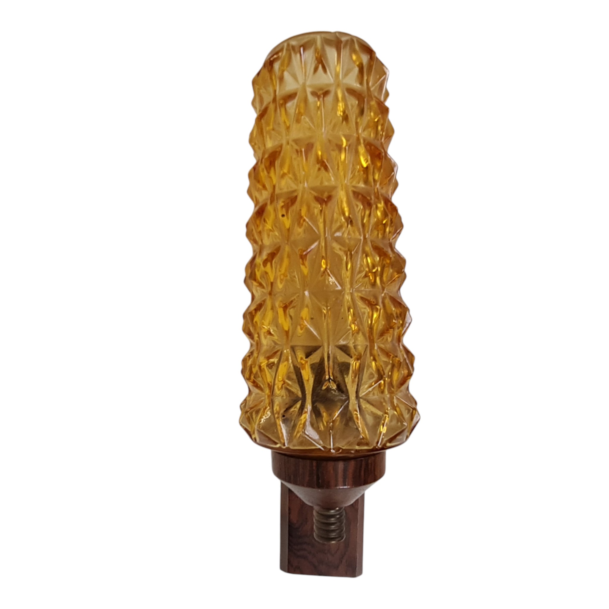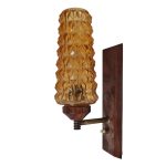 Retro væglampe i dansk design monteret på teakplade og gult glas.