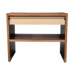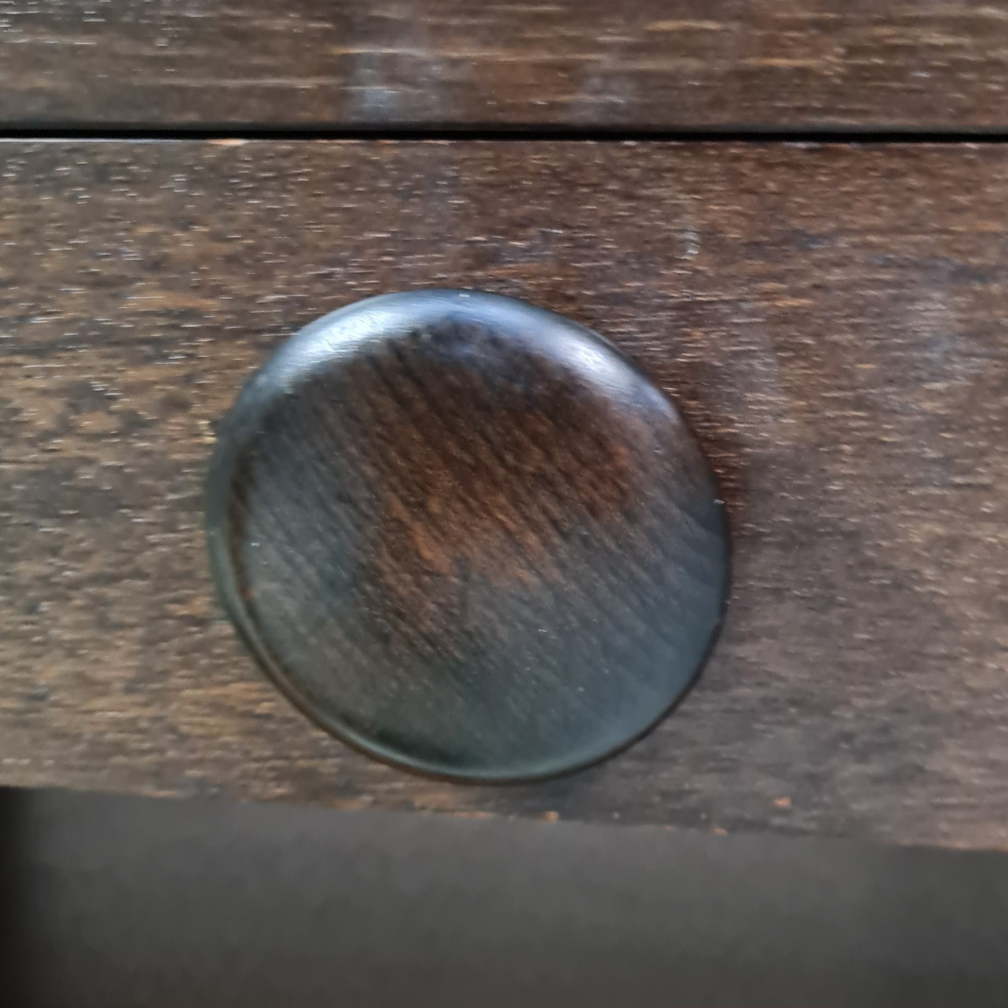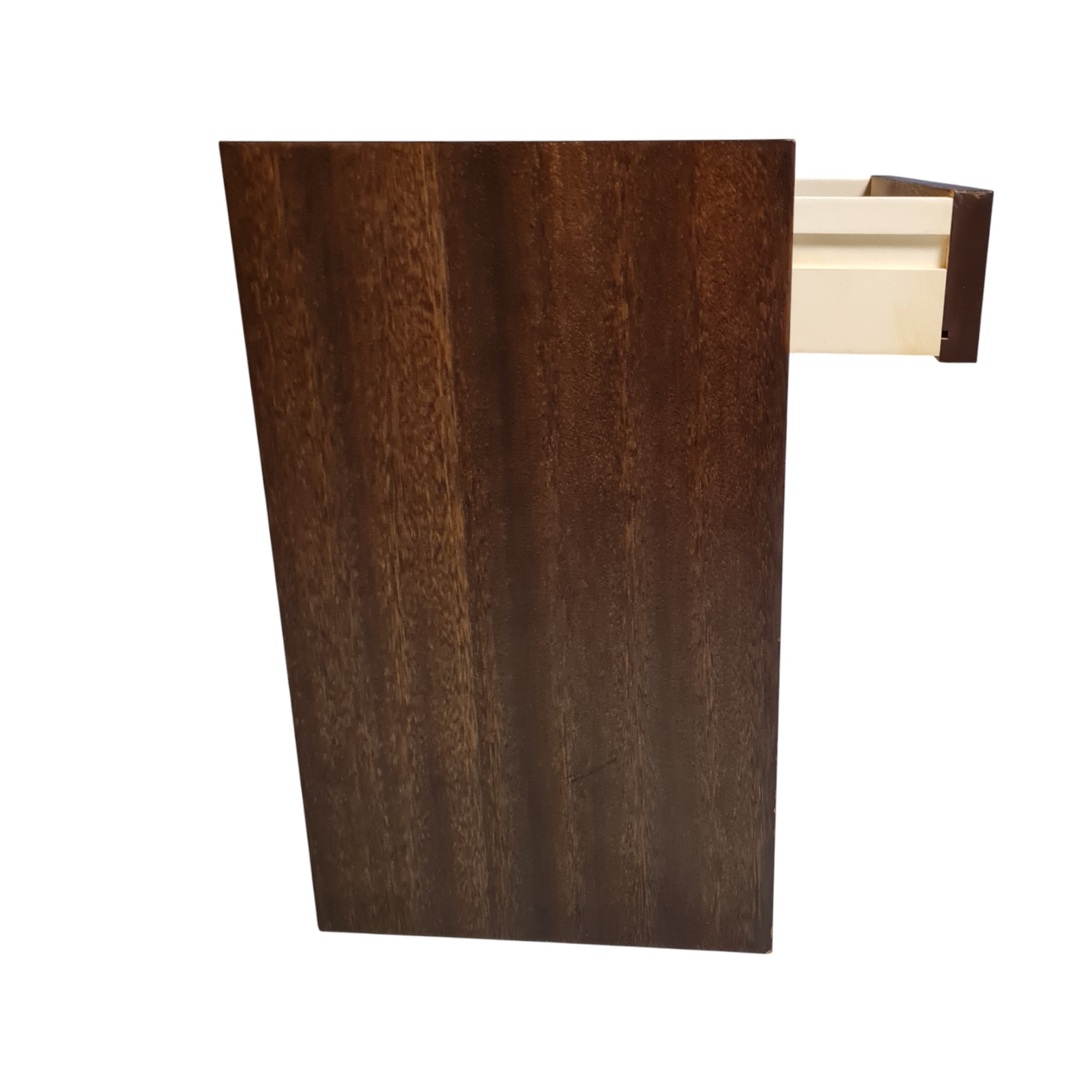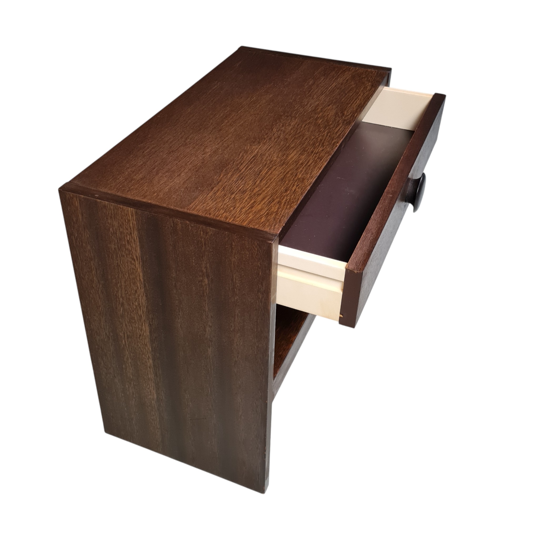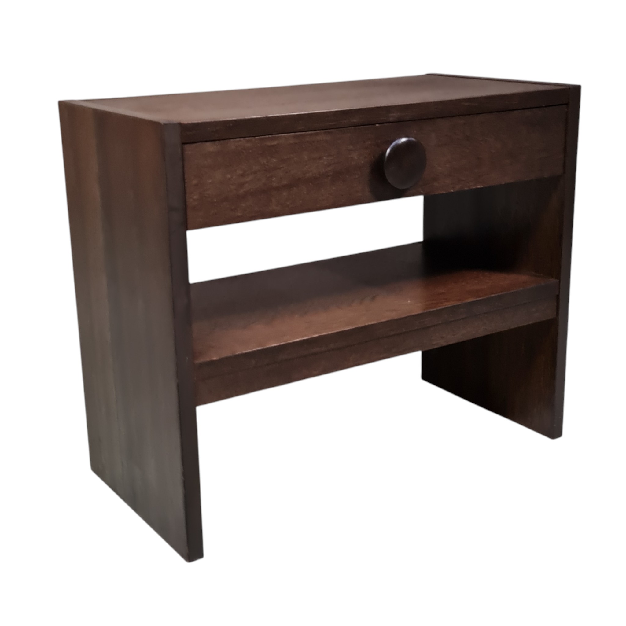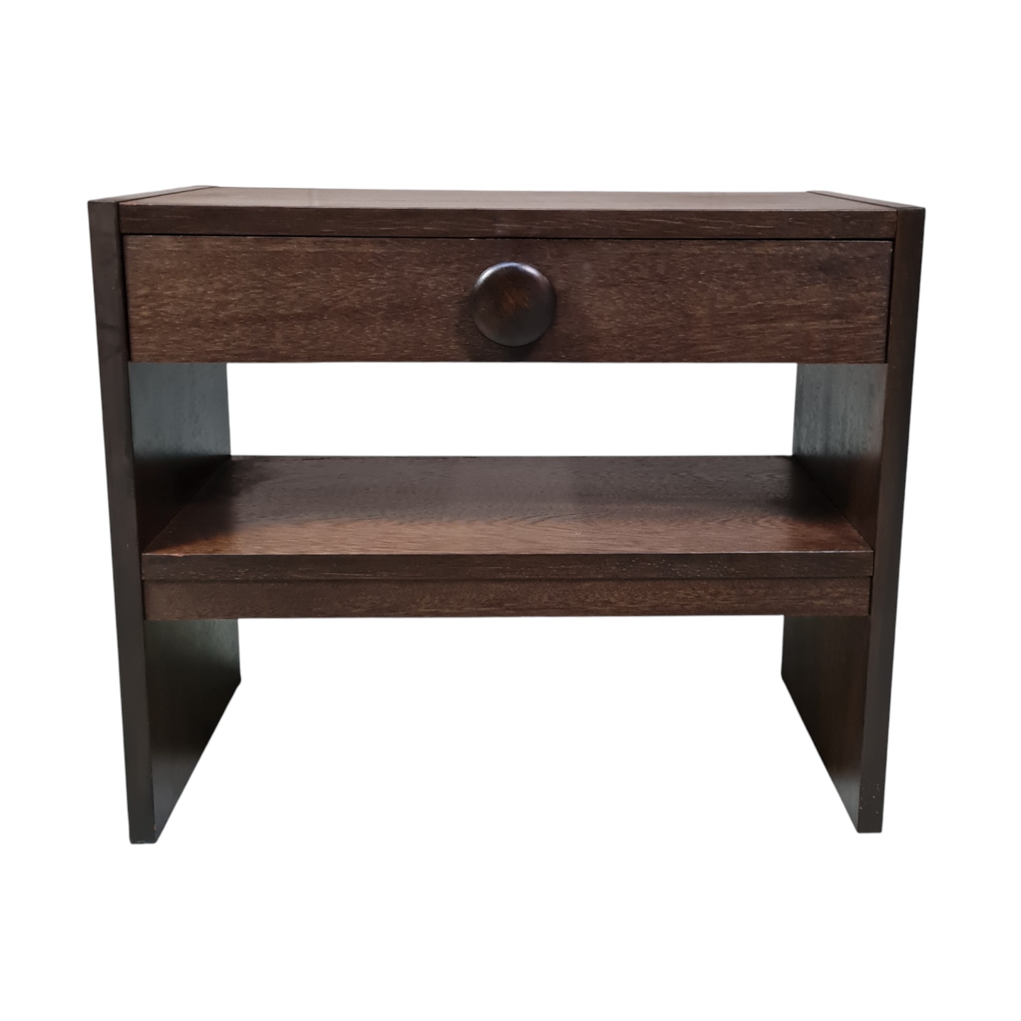 Praktisk lille sengebord i mørkbejdset eg med en skuffe og underliggende hylde.