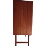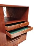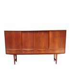 Flot og praktisk skænk med fire skydelåger bag hvilket hylder og barsektion samt fire skuffer i front. Dansk design fra 1950’erne udført i fineret og massiv teak.