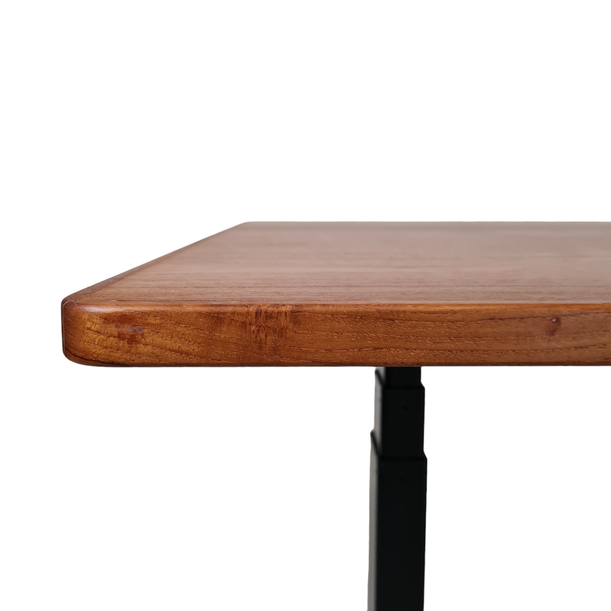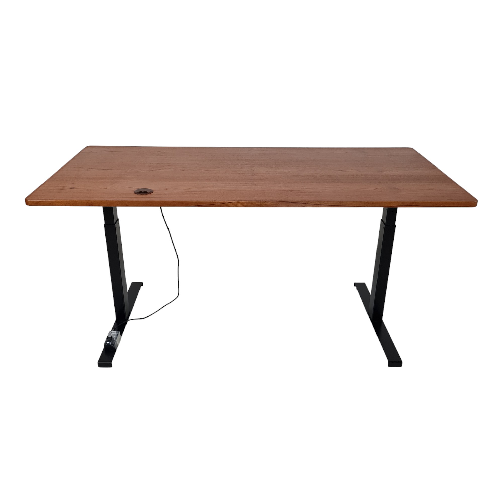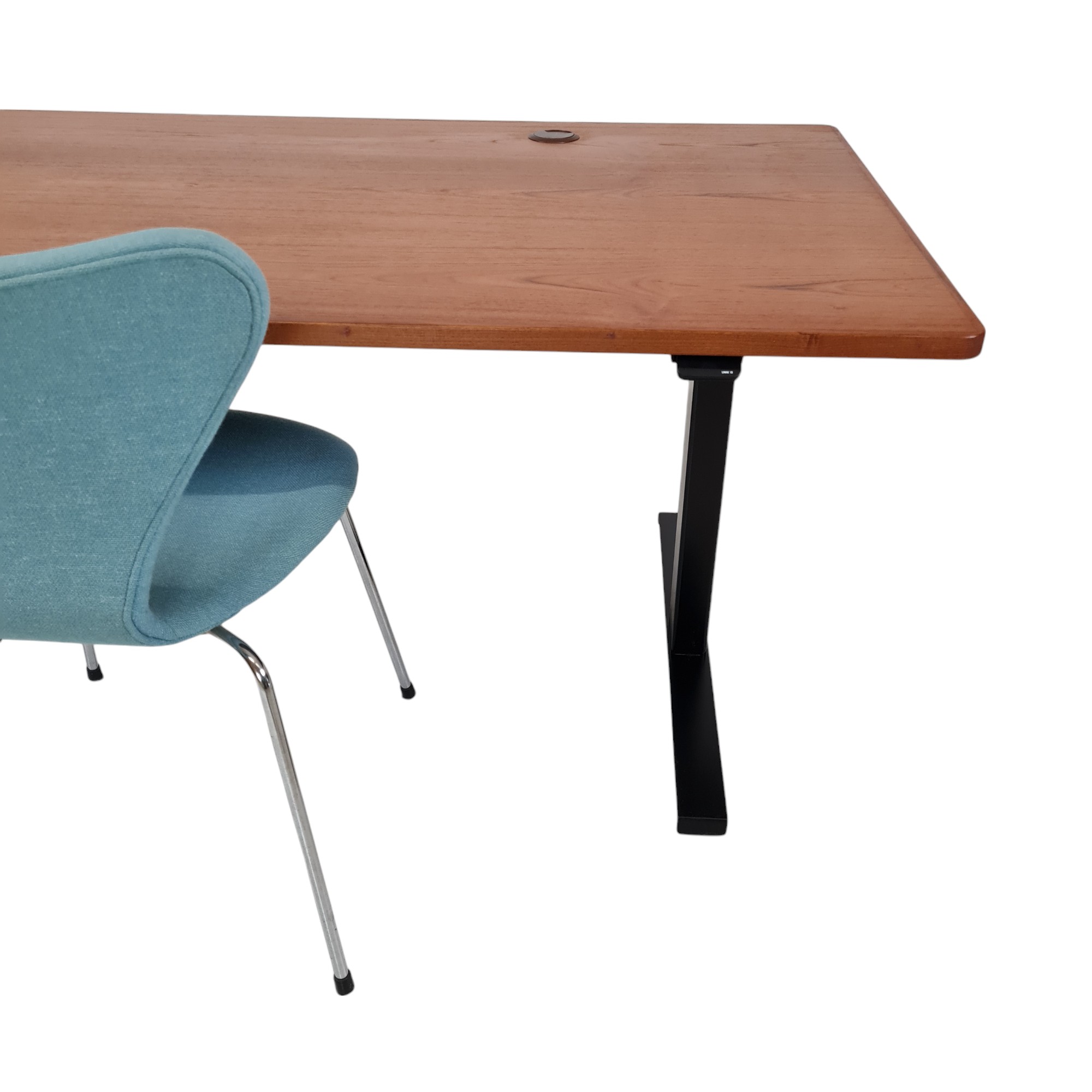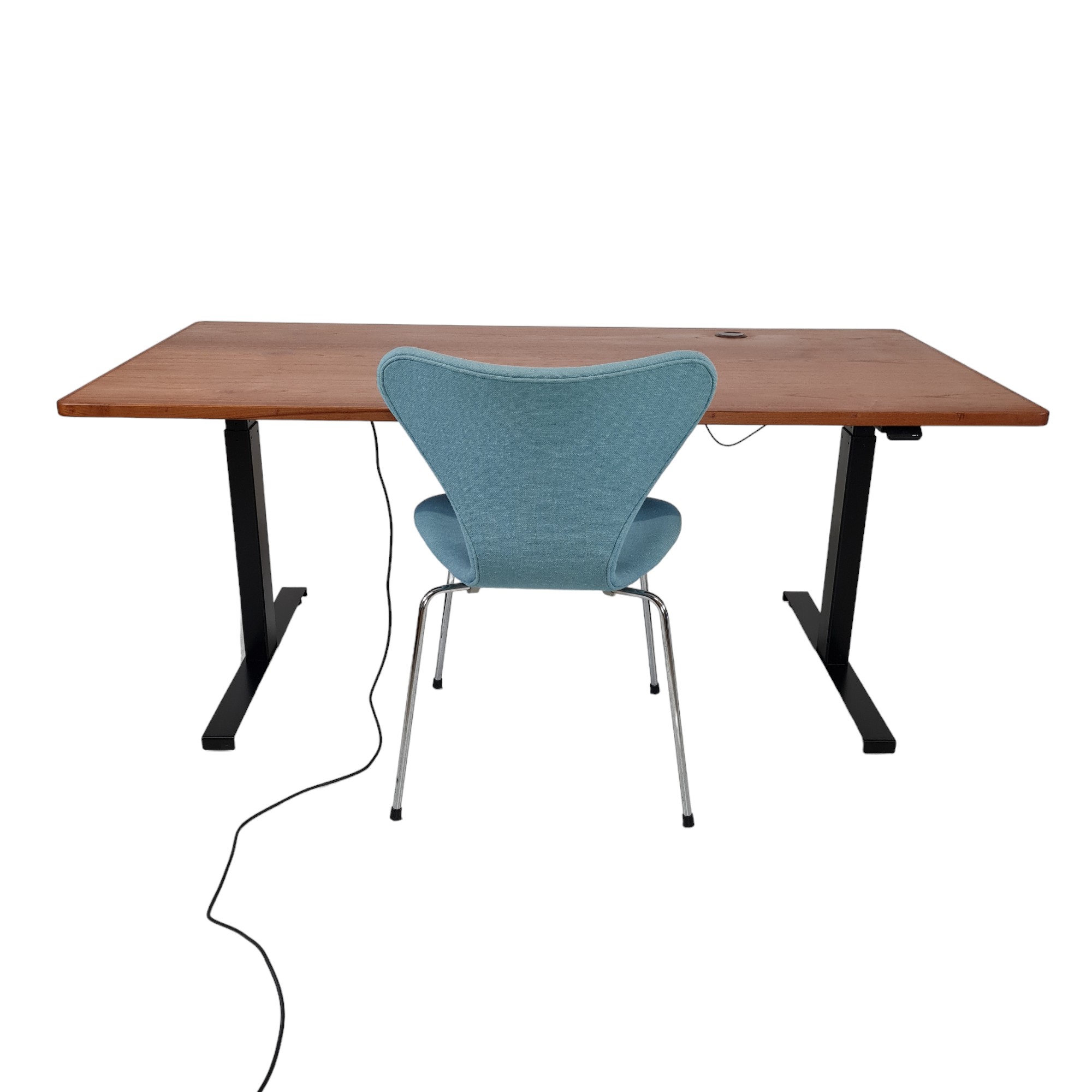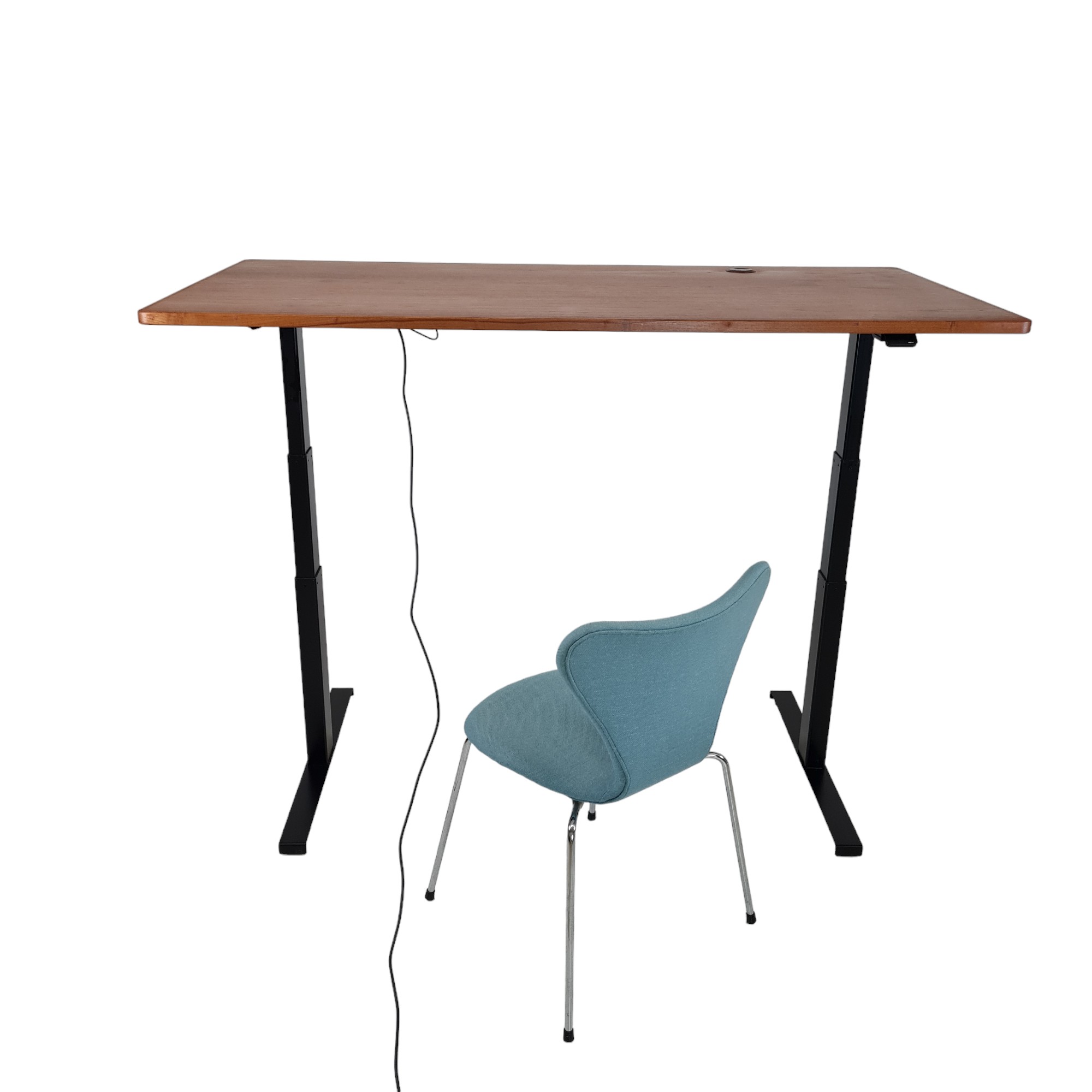 Stilrent og funktionelt skrivebord med bordplade i smuk teak-finér og elektrisk højdejustering. Bordet er danskproduceret i solide kvalitetsmaterialer og kombinerer klassisk æstetik med moderne ergonomi. Den elektriske hæve-/sænkefunktion gør det nemt at tilpasse bordet efter behov – fra siddende til stående arbejde.
