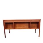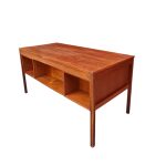 Smukt dansk design udført hos en dansk møbelproducent i 1950’erne. Skrivebordet er udstyret med seks rummelige skuffer i fronten og tre åbne rum på bagsiden – perfekt til både opbevaring og udstilling. De originale greb på skufferne giver møblet et tidstypisk og harmonisk udtryk.