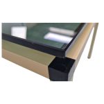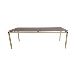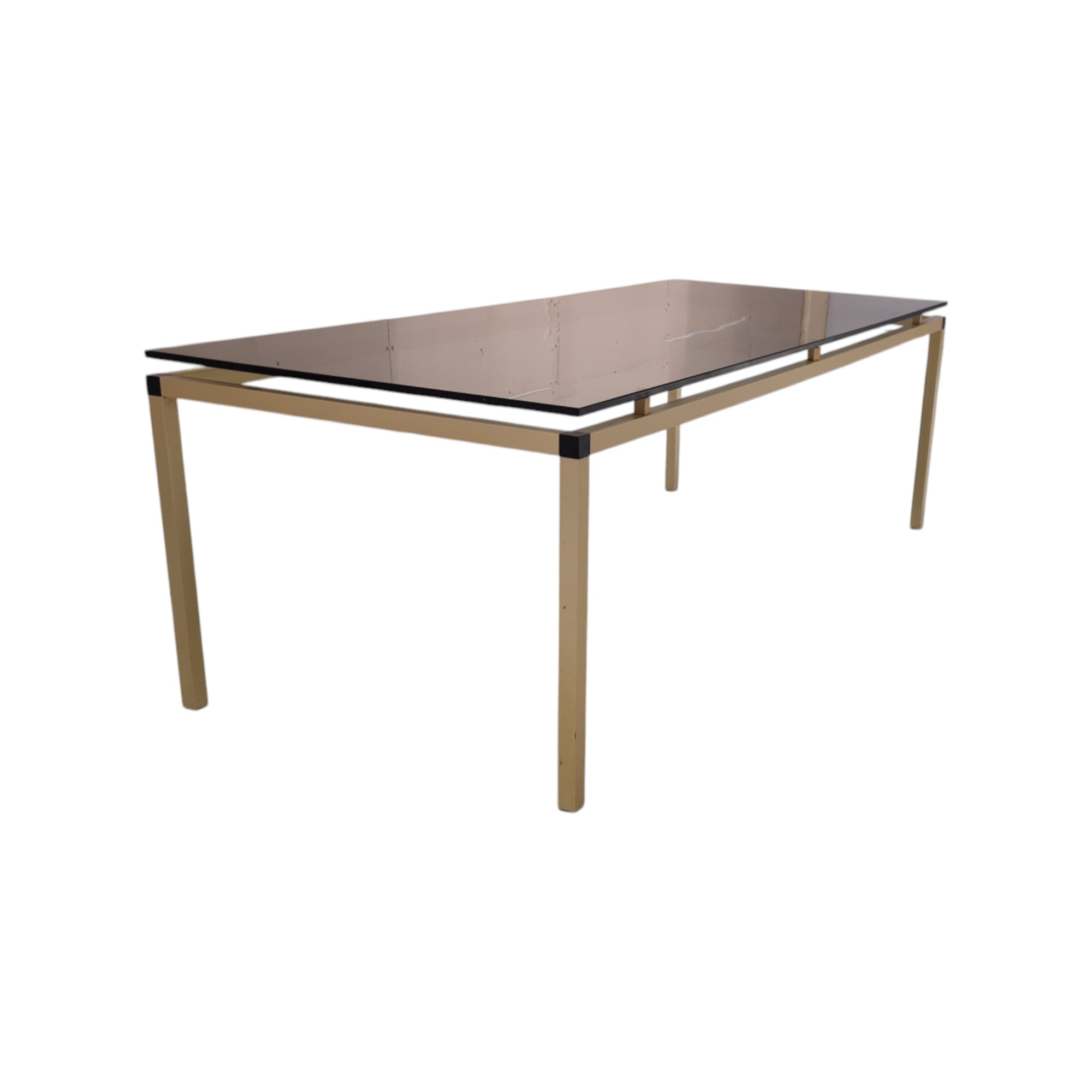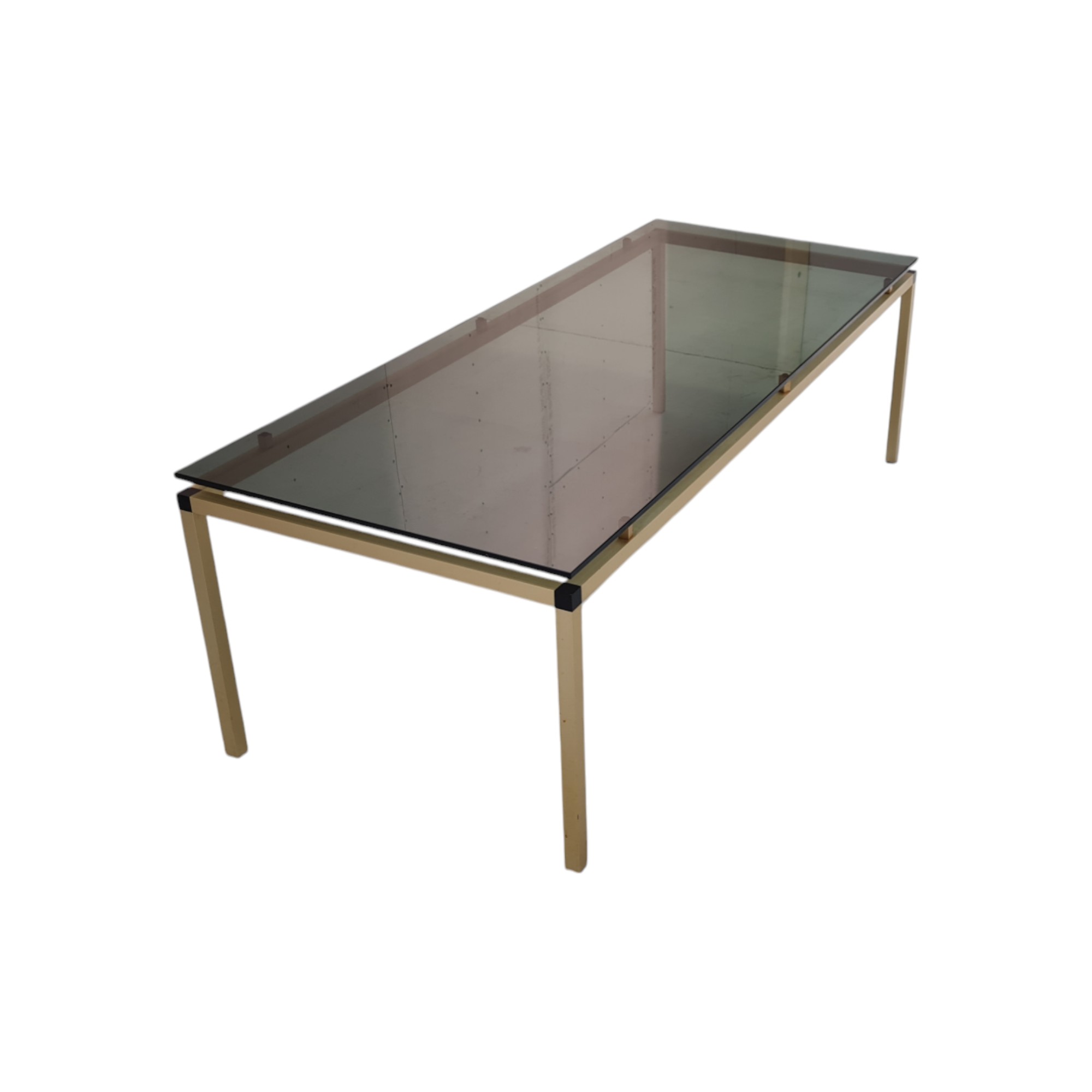 Elegant og minimalistisk sofabord med stel i guldfarvet metal og topplade i røgfarvet glas.