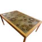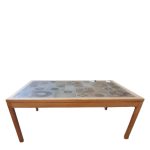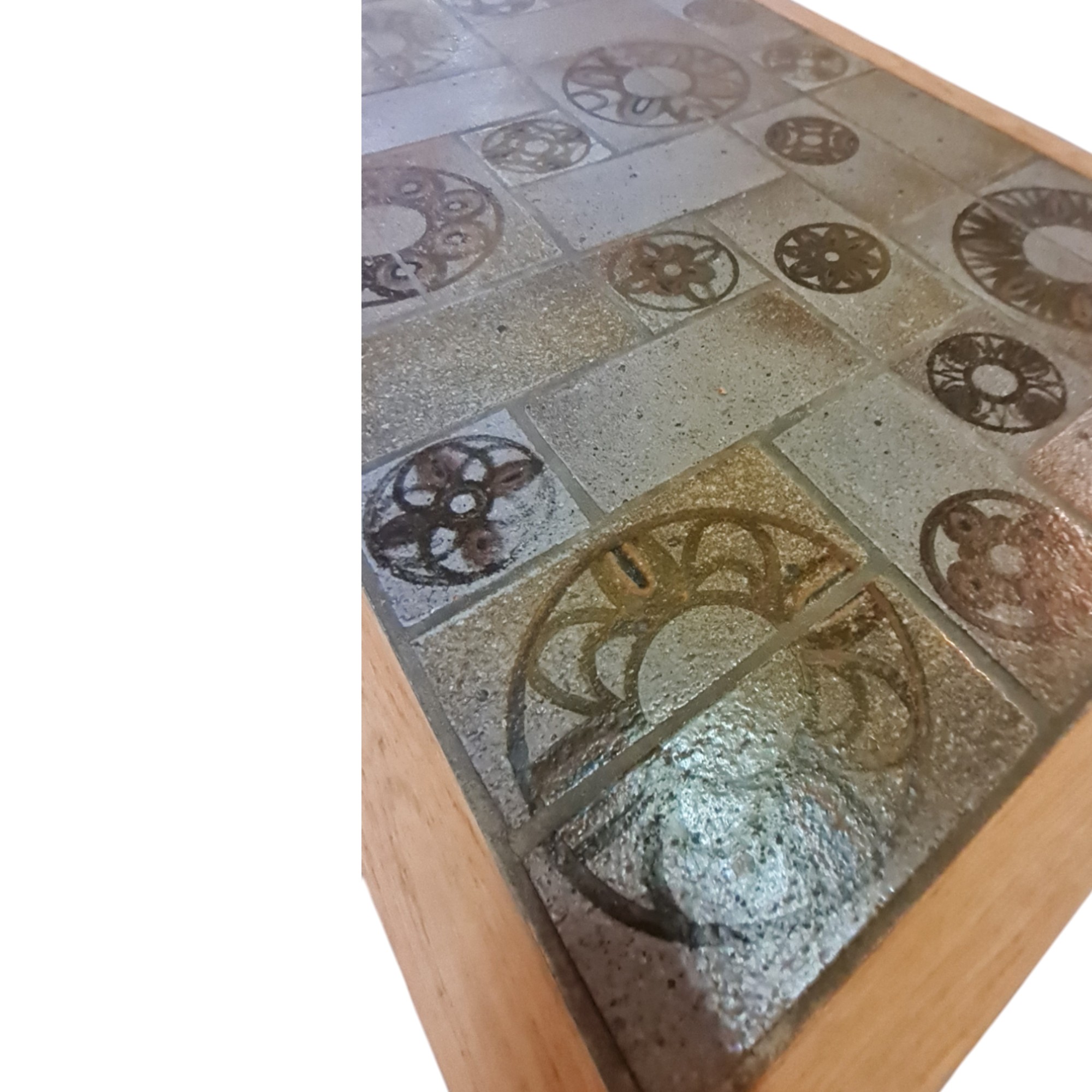 Flot og tidstypisk kakkelbord fremstillet af Sallingboe i 1970’erne. Bordet er udført med solidt stel i eg og en karakteristisk bordplade bestående af kakler i smukke blå og brunlige nuancer. Det fremstår i pæn stand med naturlige aldersrelaterede brugsspor. Bemærk dog, at noget af fugen i kanten er forsvundet, hvilket er afspejlet i prisen. Et dekorativt og funktionelt møbel med ægte retrocharme.