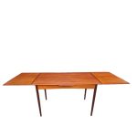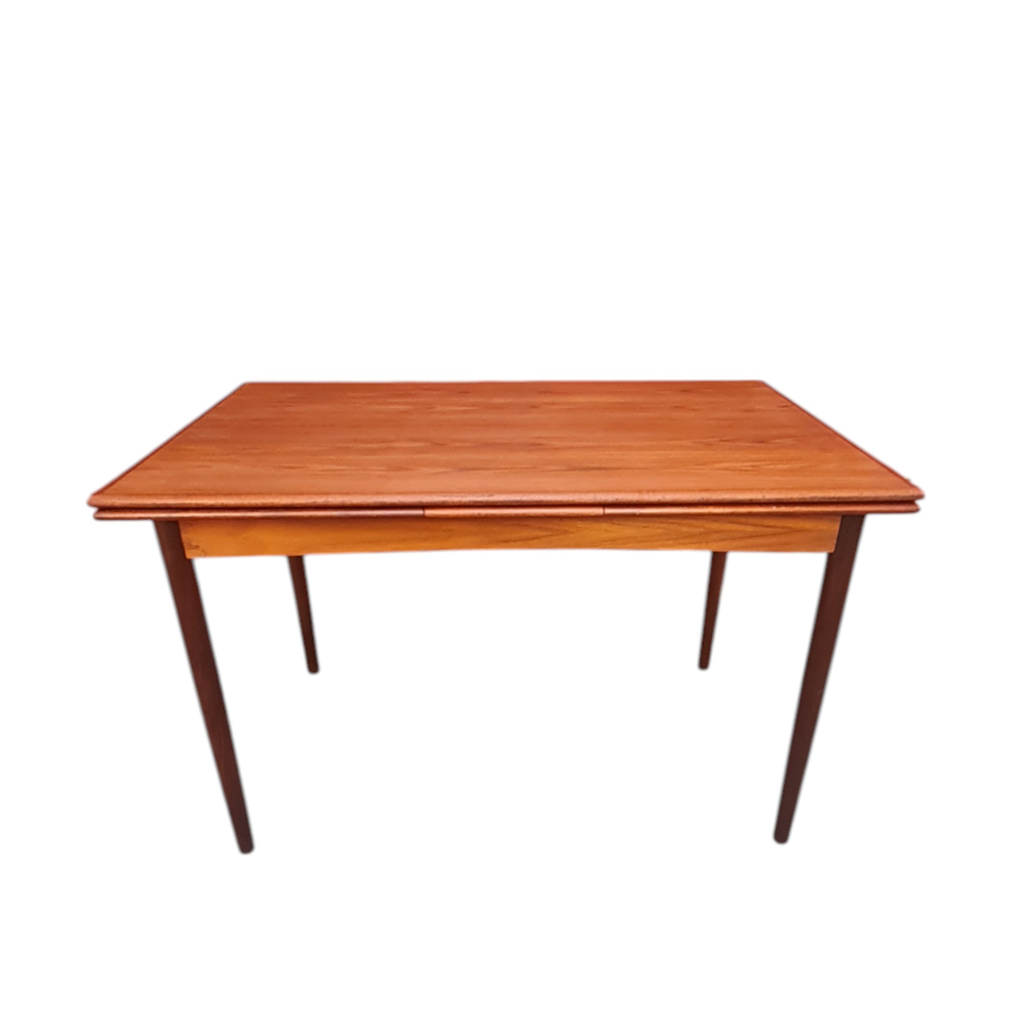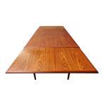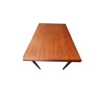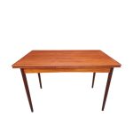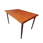 Klassisk spisebord i dansk design fra 1950’erne, udført i smuk fineret palisander med hollandsk udtræk og elegante, runde tilspidsede ben. Bordet har et let og harmonisk udtryk og kombinerer funktionalitet med tidløs æstetik.