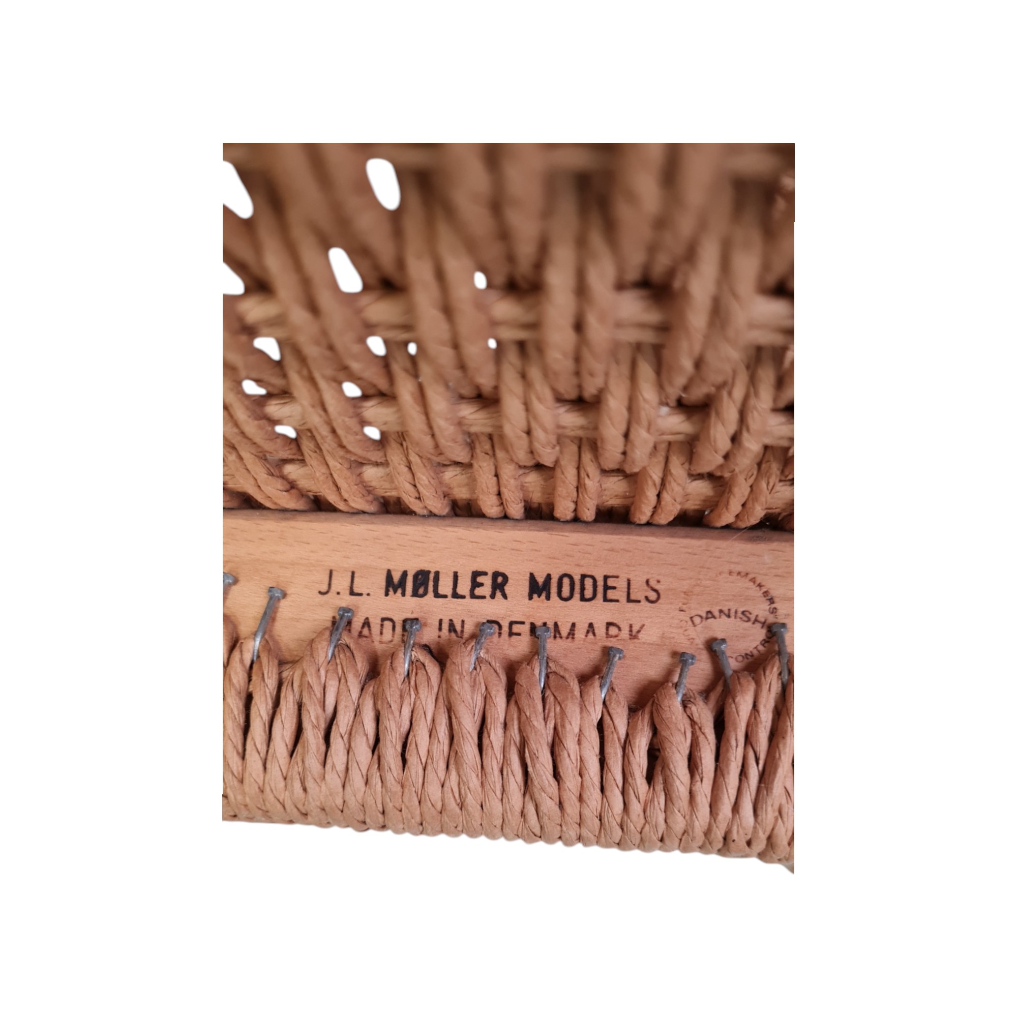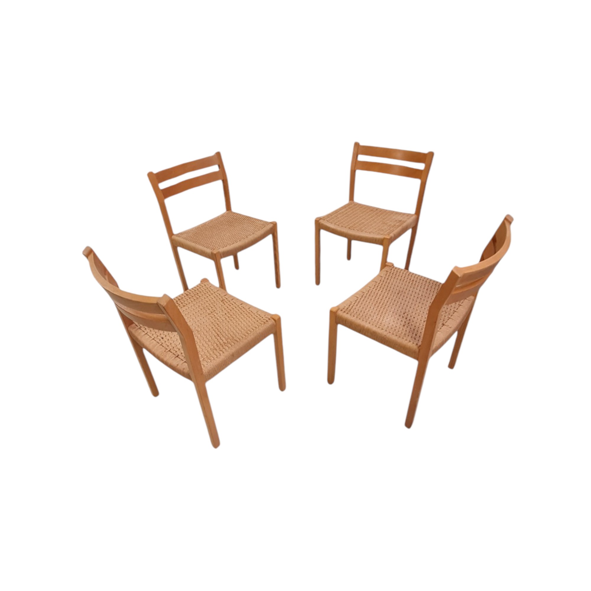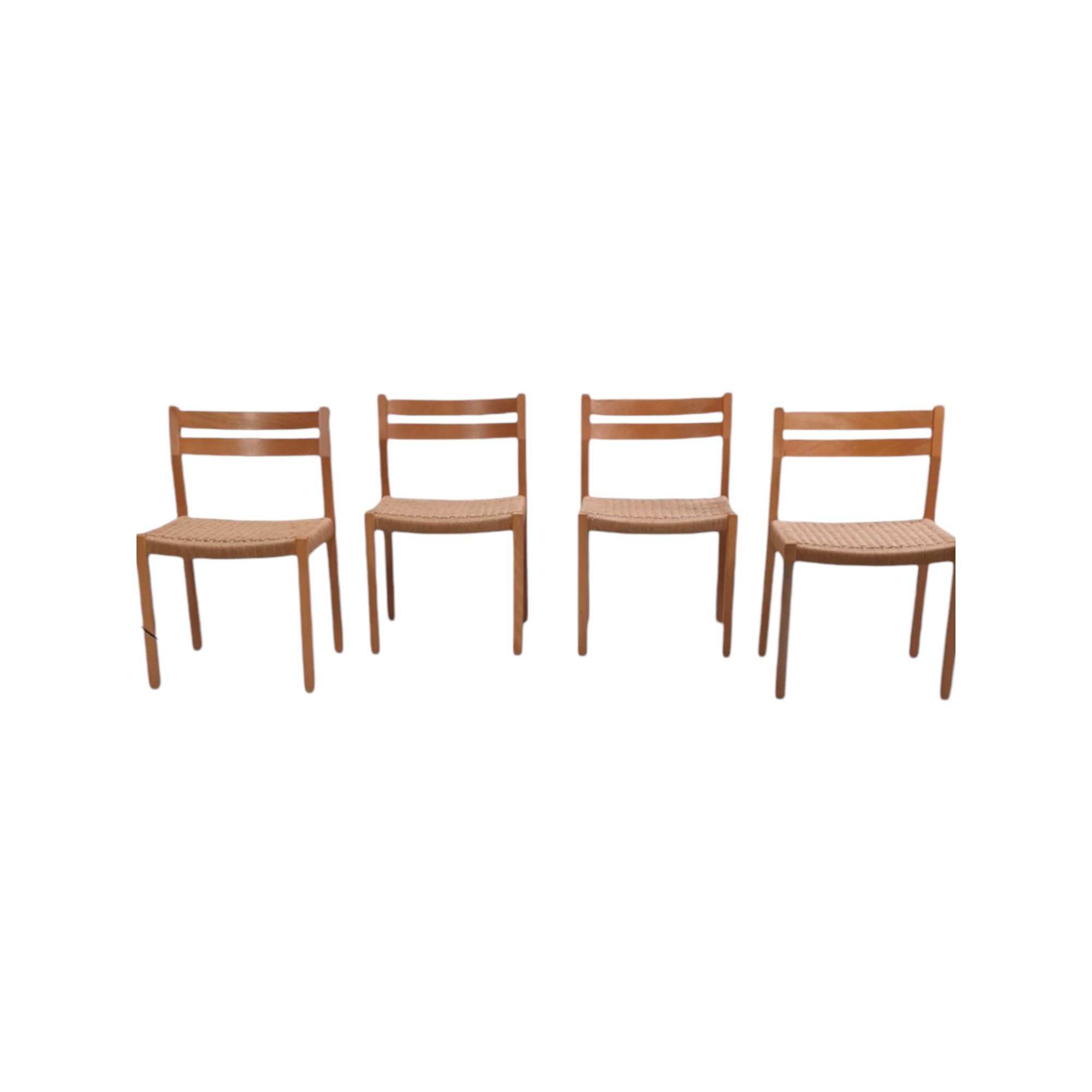 Elegante spisebordsstole, model 84, designet af den danske møbelarkitekt N. O. Møller i 1976. Stolene er udført i massivt eg med sæde i håndflettet papirgarn i naturfarve og produceret af den anerkendte møbelfabrik J. L. Møller.