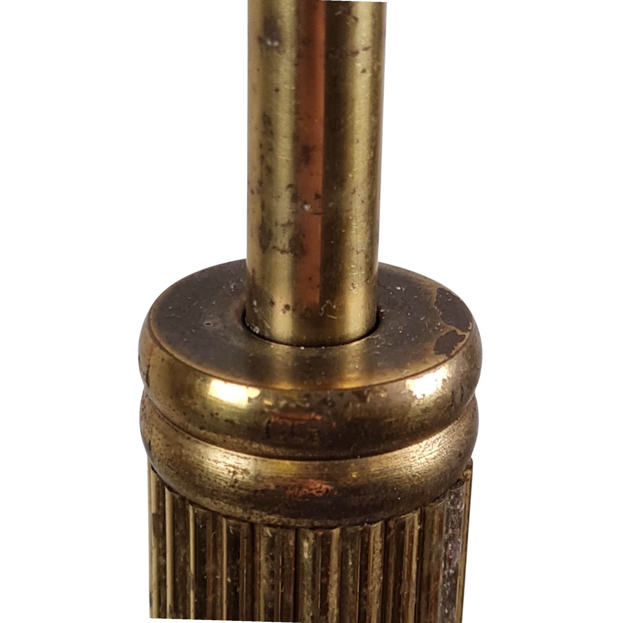 Messingfarvet standerlampe med kanelleret stamme og rund fod. Formgivet 1970’erne og antageligt dansk design.