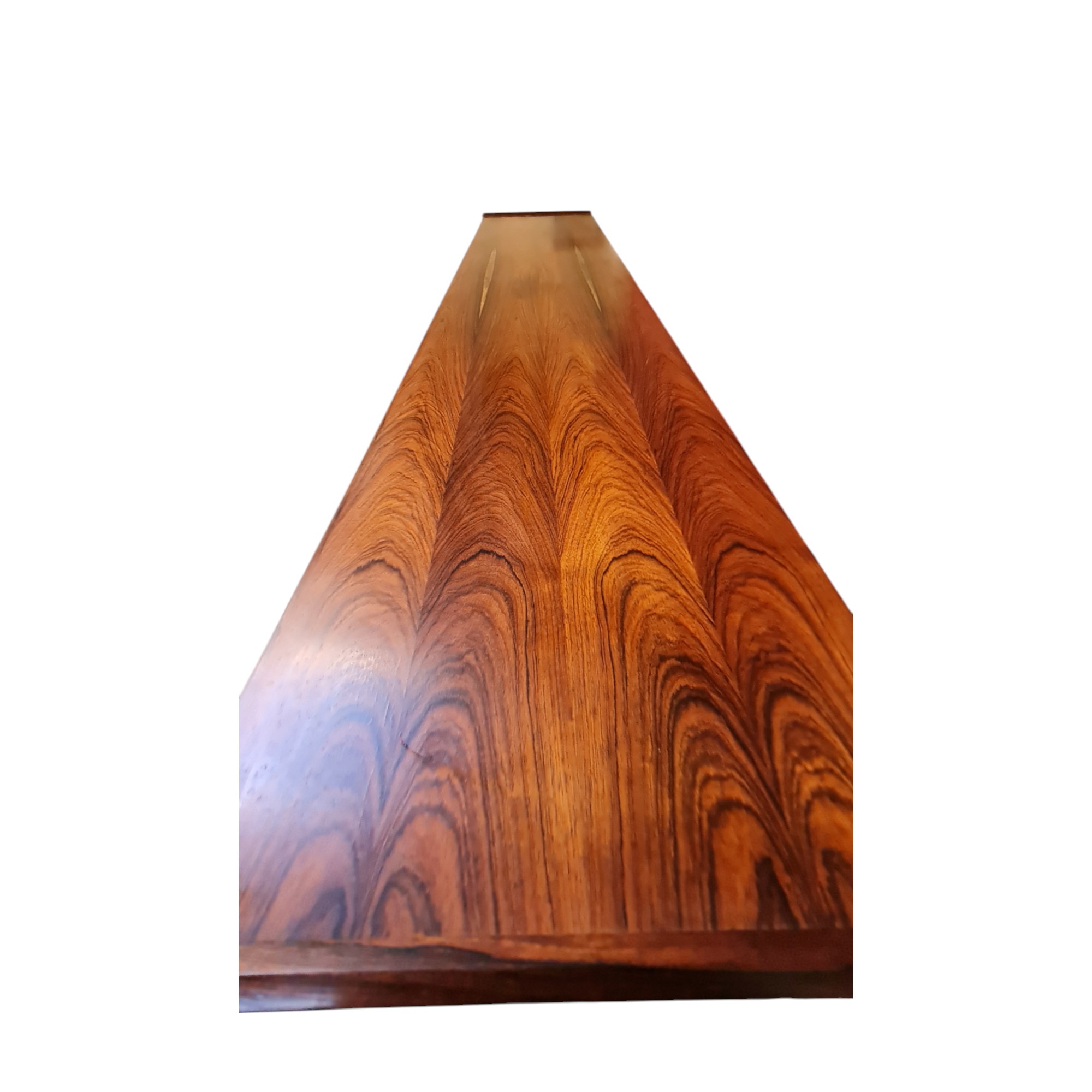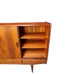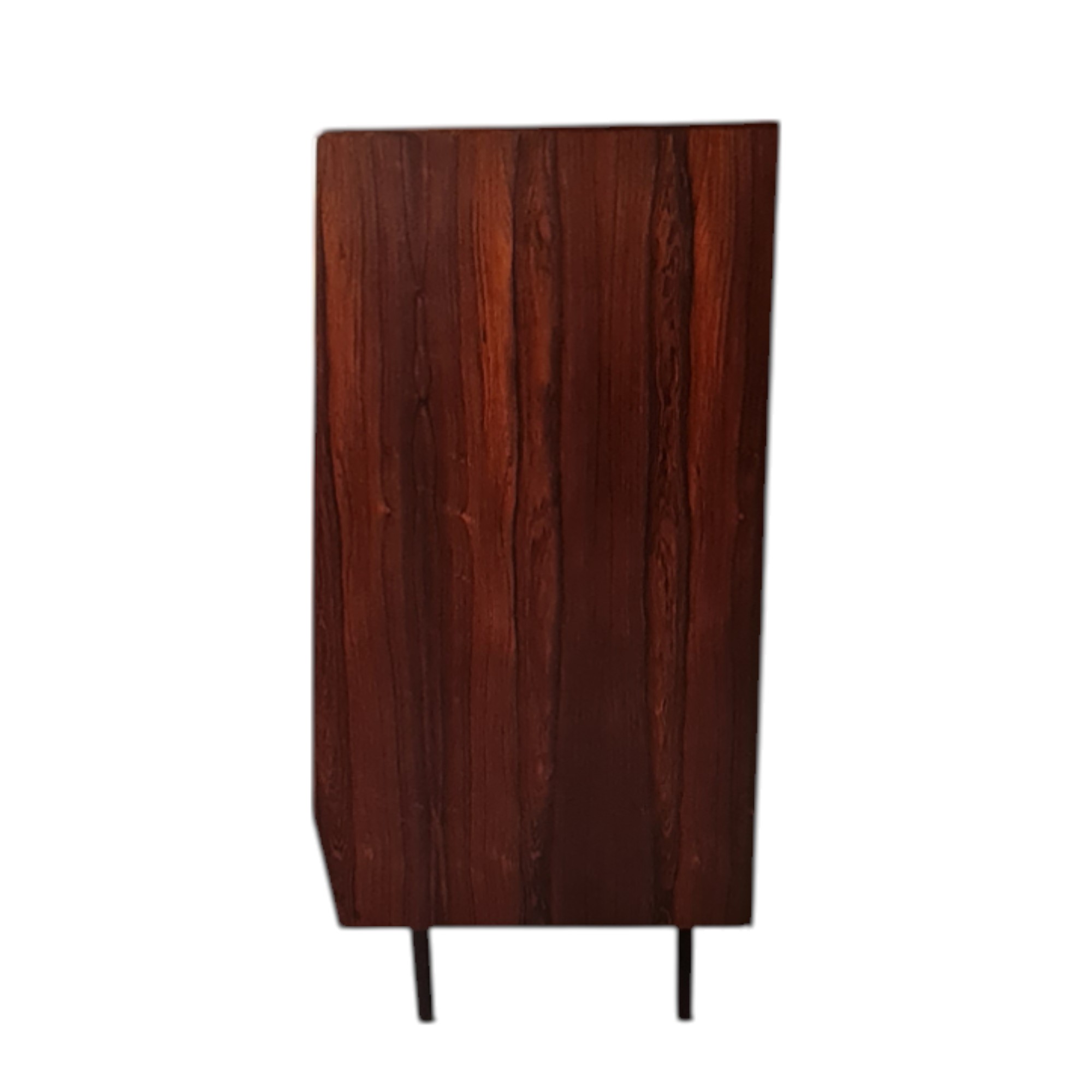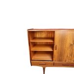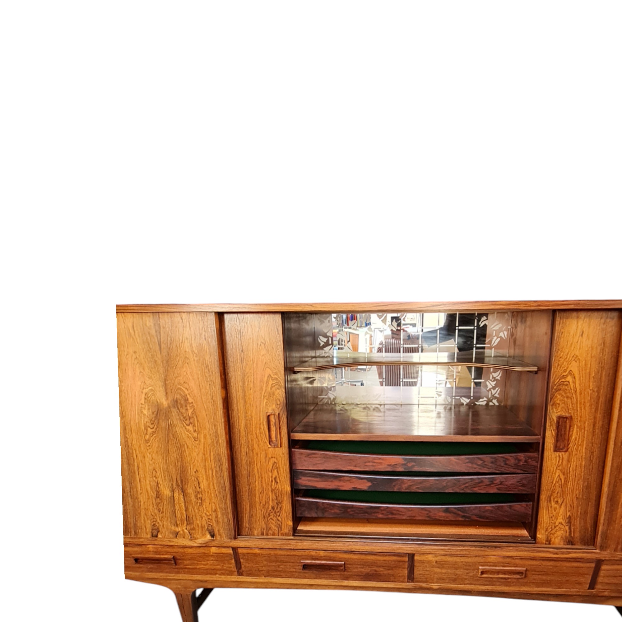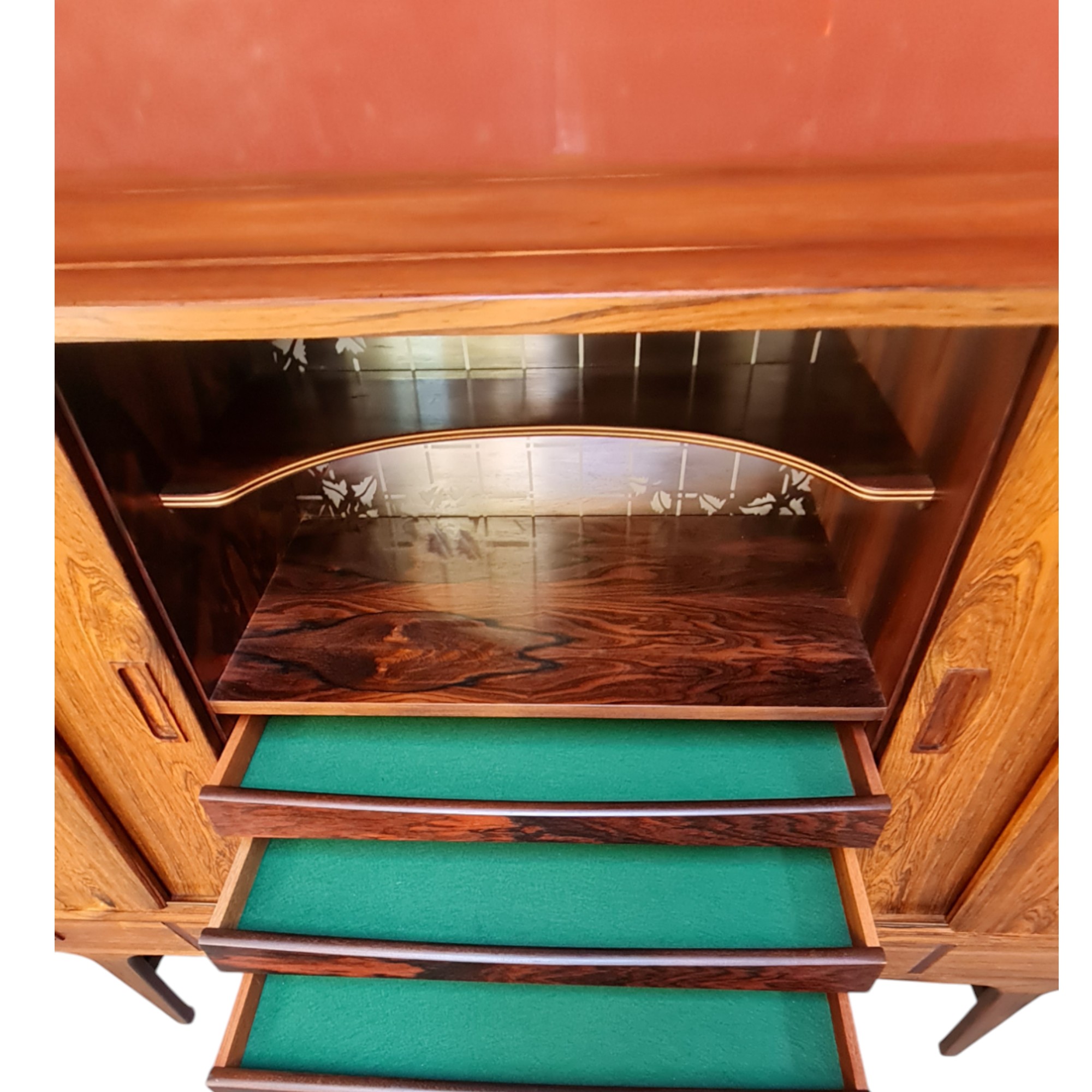 Flot og imponerende skænk i dansk design fra 1950’erne – udført i smuk palisander med enestående detaljer og forarbejdning. Skænken fremstår med fire skuffer i front samt fire skydelåger, bag hvilke der gemmer sig hylder og en særligt eksklusiv barinddeling med indvendige skuffer og finér i massiv palisander.
