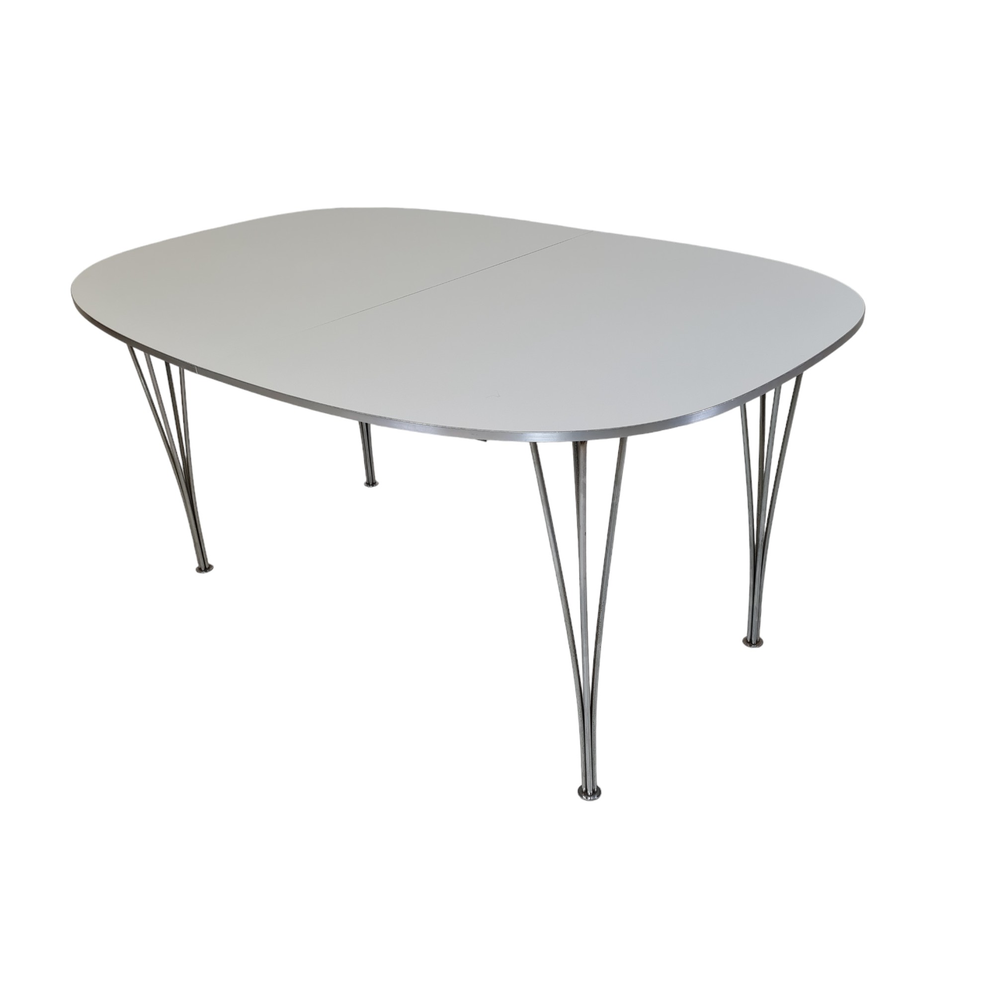 Ikonisk Super Ellipse spisebord tegnet af Piet Hein og Bruno Mathsson i 1968 – dette eksemplar er produceret i 1986 af Fritz Hansen. Bordet kombinerer funktionalitet med æstetik og har en tidløs form, der passer perfekt ind i både moderne og klassiske hjem.