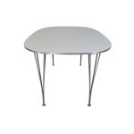 Det er udført med elegante stålspændeben og en slidstærk bordplade i hvidlaminat, som giver et let og luftigt udtryk. Bordet fremstår i pæn stand med almindelige aldersrelaterede brugsspor som små ridser og mærker – et originalt designikon med historie og karakter.