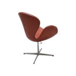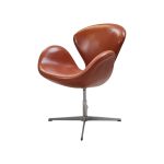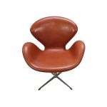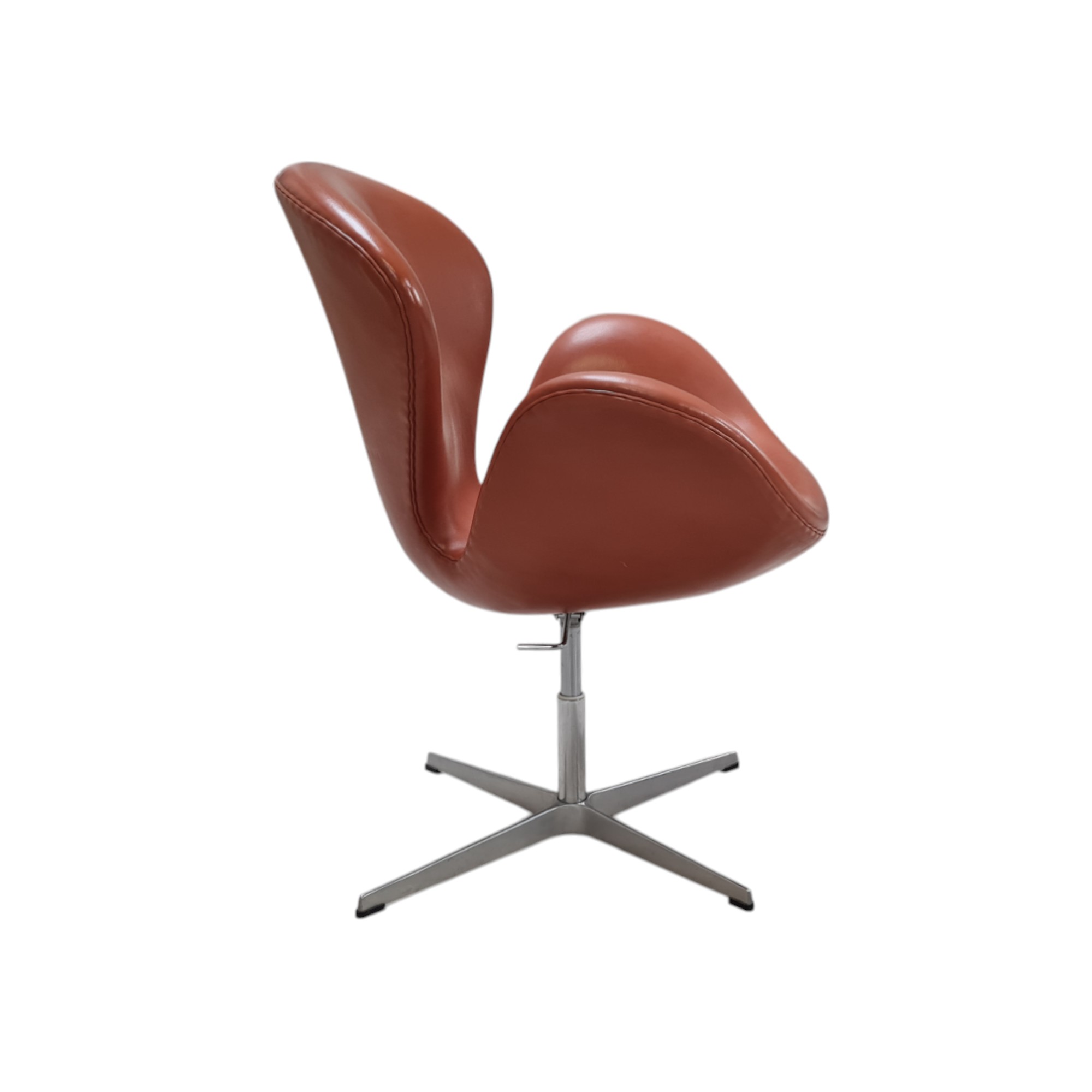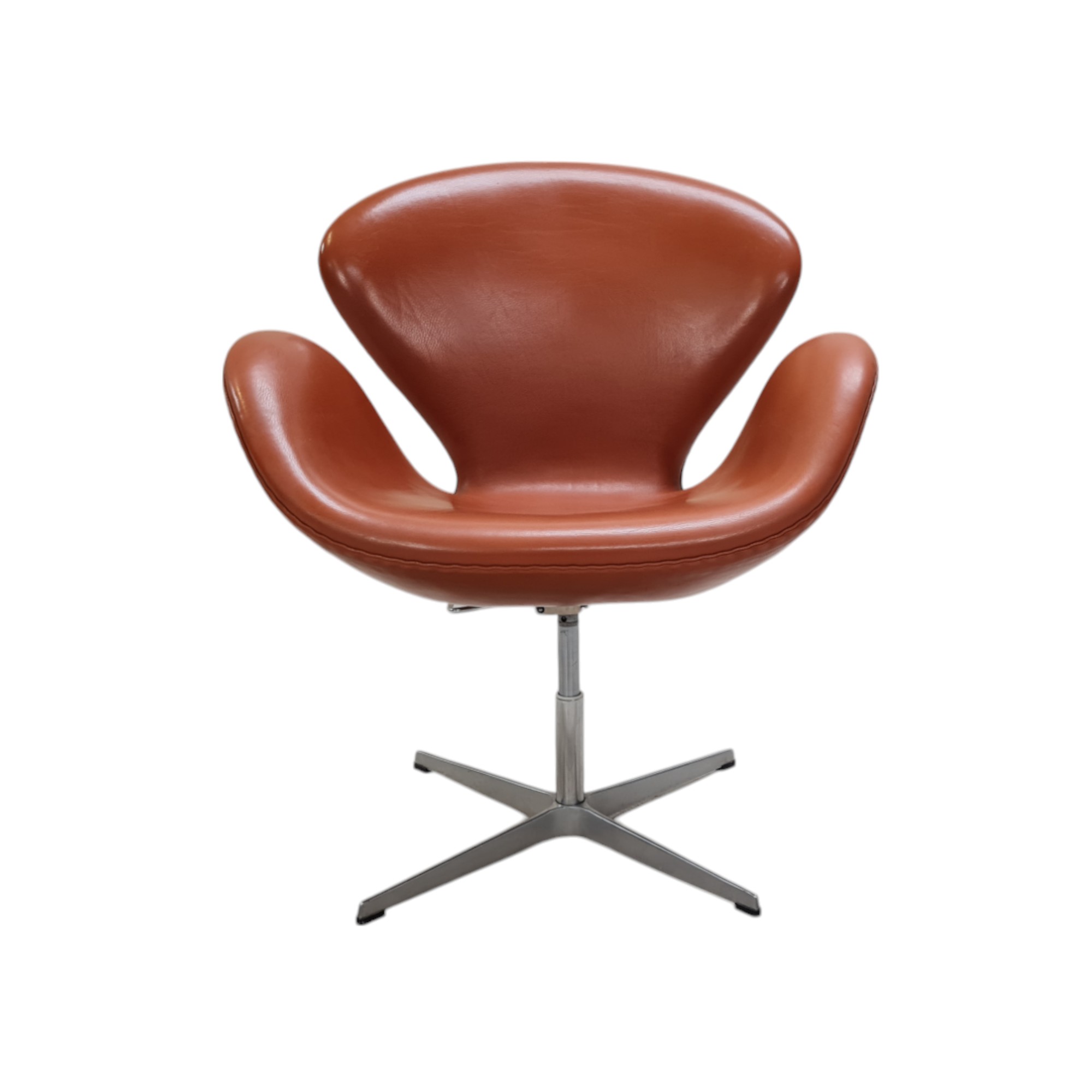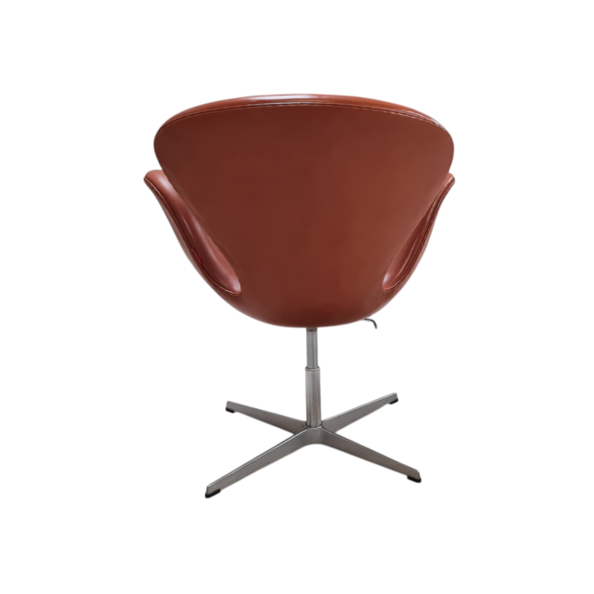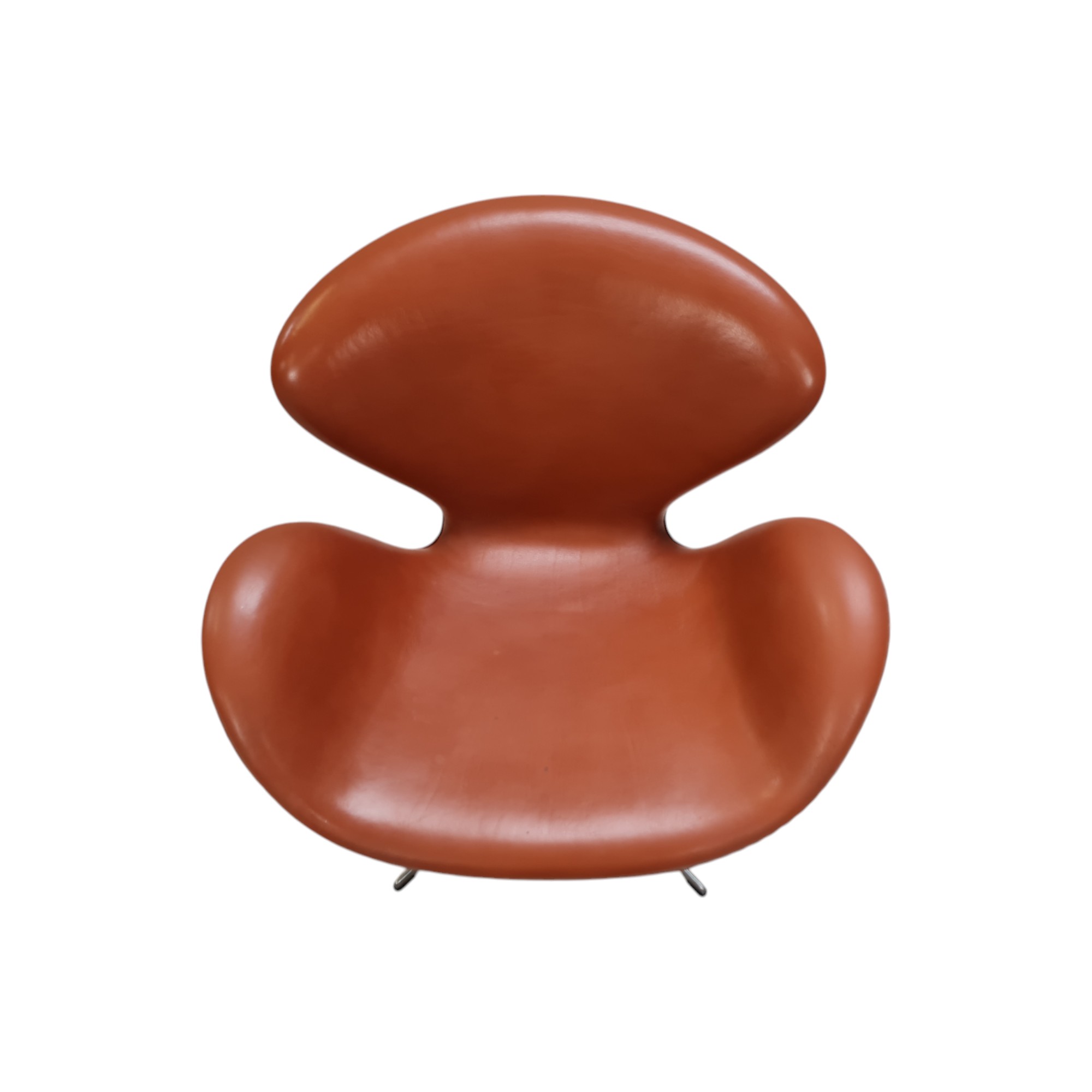 Et ikonisk stykke dansk design: Svanen, model 3320, tegnet af Arne Jacobsen og formgivet i 1958. Denne udgave er fremstillet i 1979 af Fritz Hansen og står med det karakteristiske stålstel og en smuk, rødbrun læderpolstring.