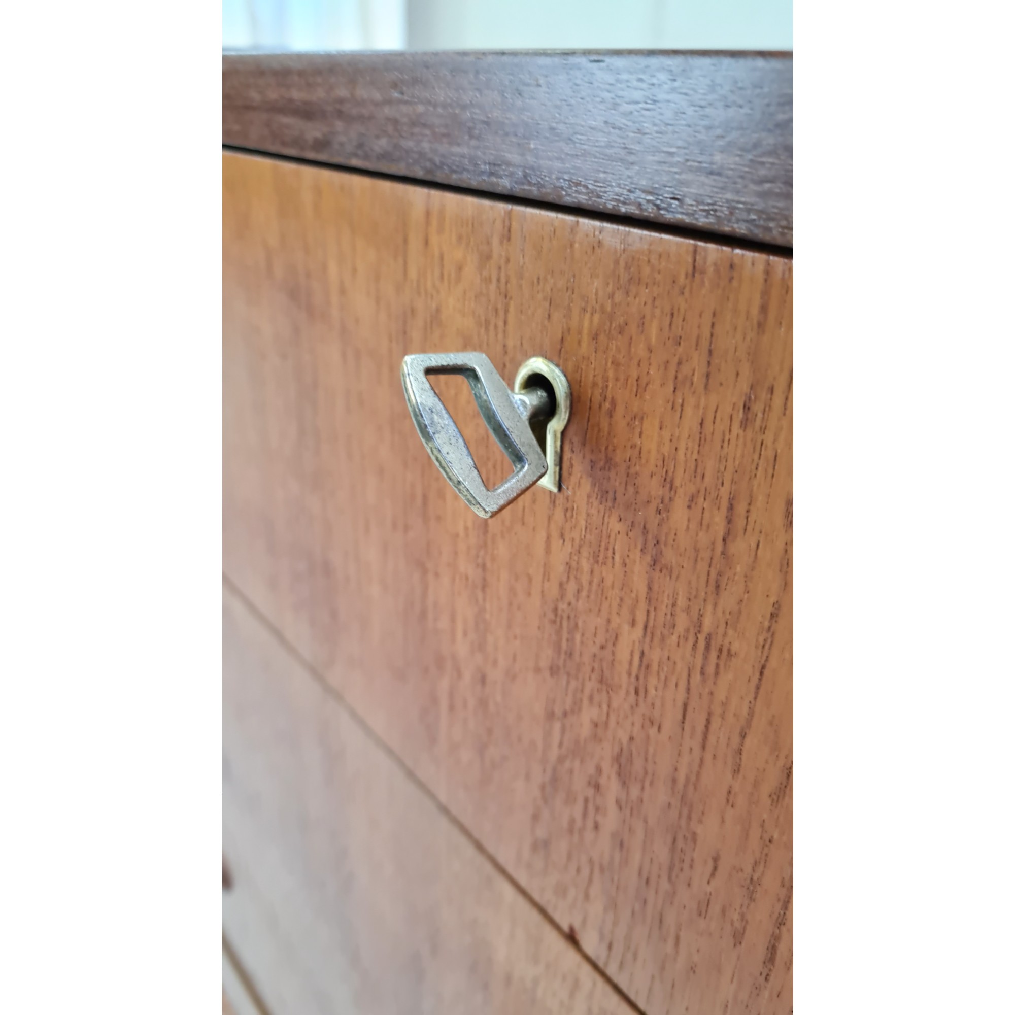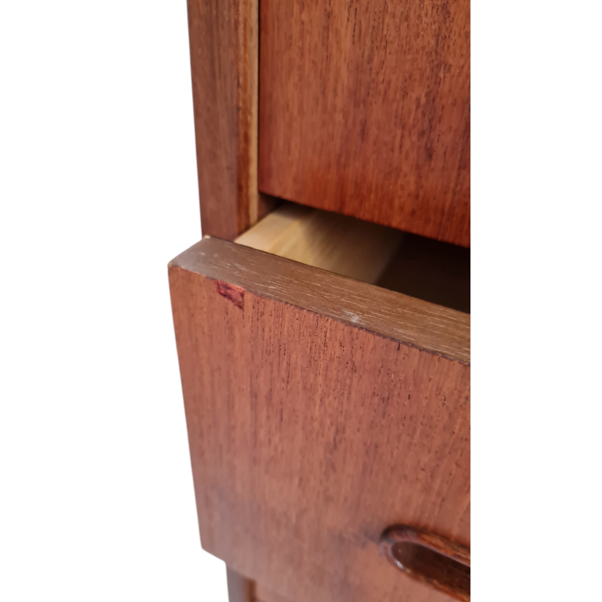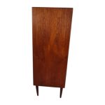 Kommoden er udført i fineret teak og har seks rummelige skuffer, som giver god plads til organisering af tøj, papir eller småting. Med sit høje og smalle format passer den perfekt både i soveværelset, entréen eller kontoret.