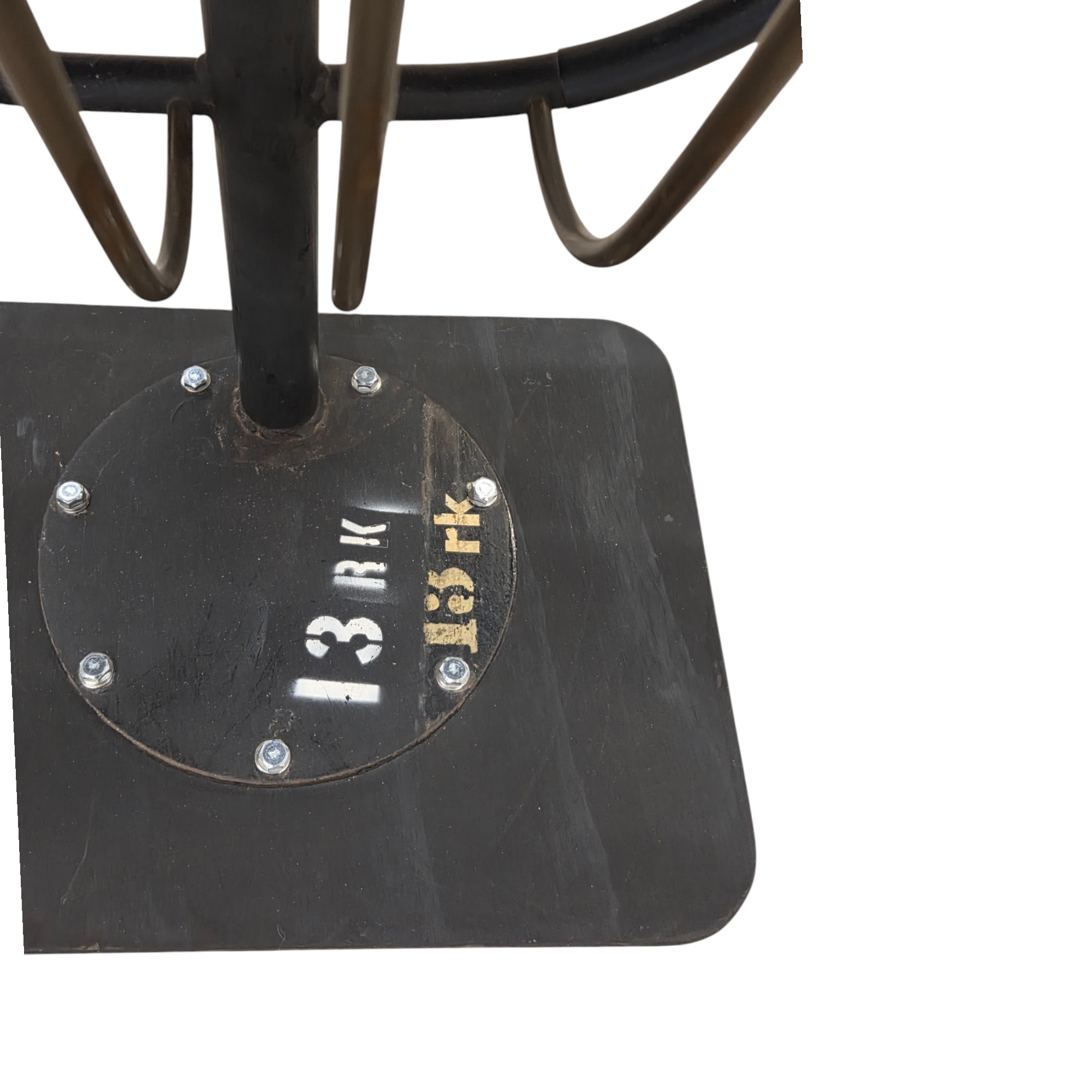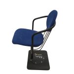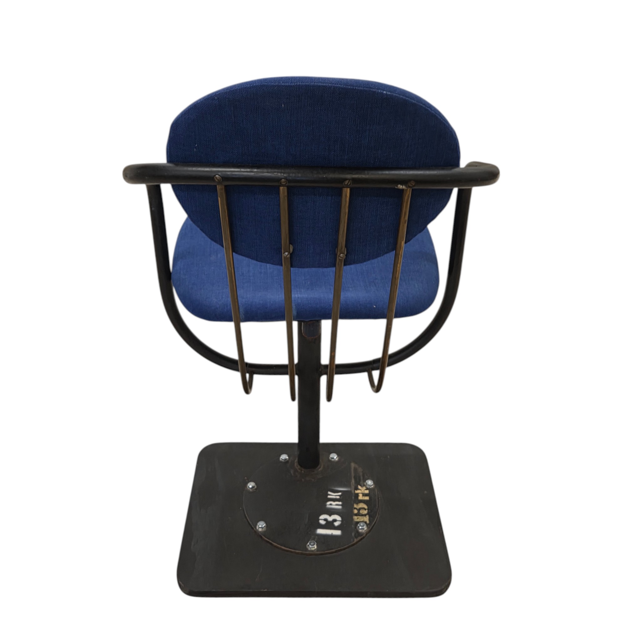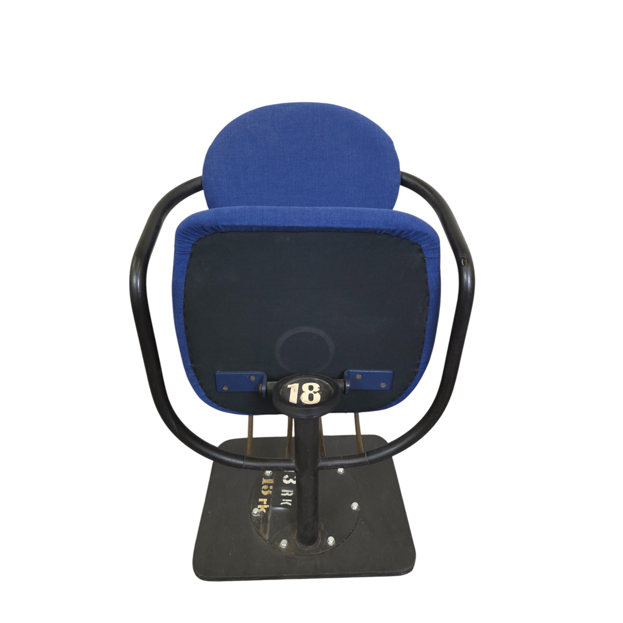 Denne model er udført i sortlakeret stål og polstret med blå uld. Stolene blev produceret i flere højder for at tilpasse sig teatrets niveauer. Dette eksemplar bærer nummer 18 fra række 13 og fremstår i meget flot stand med kun få, lette brugsspor.