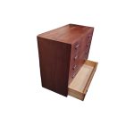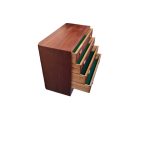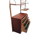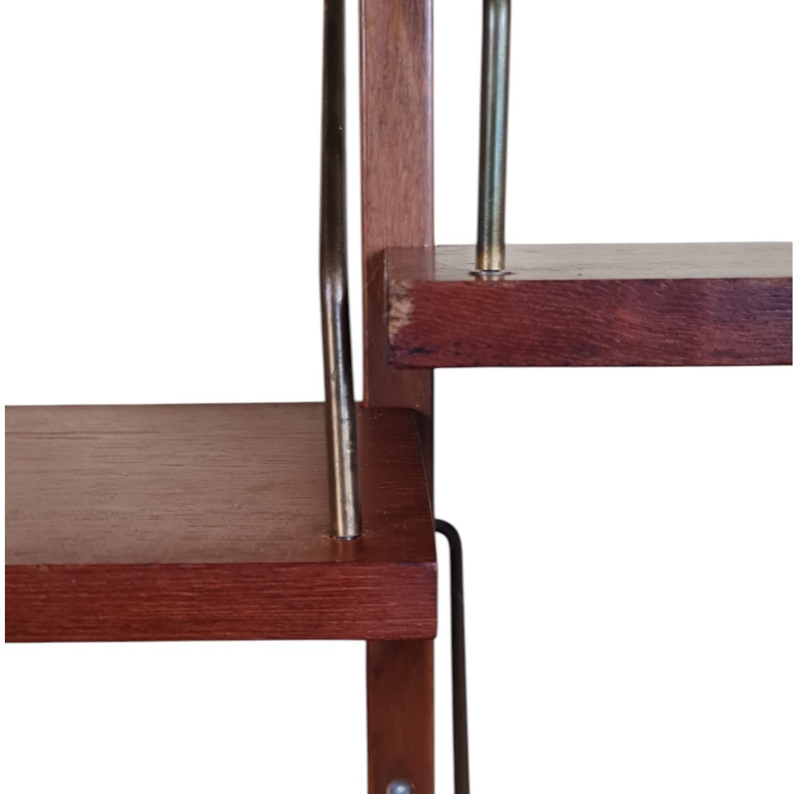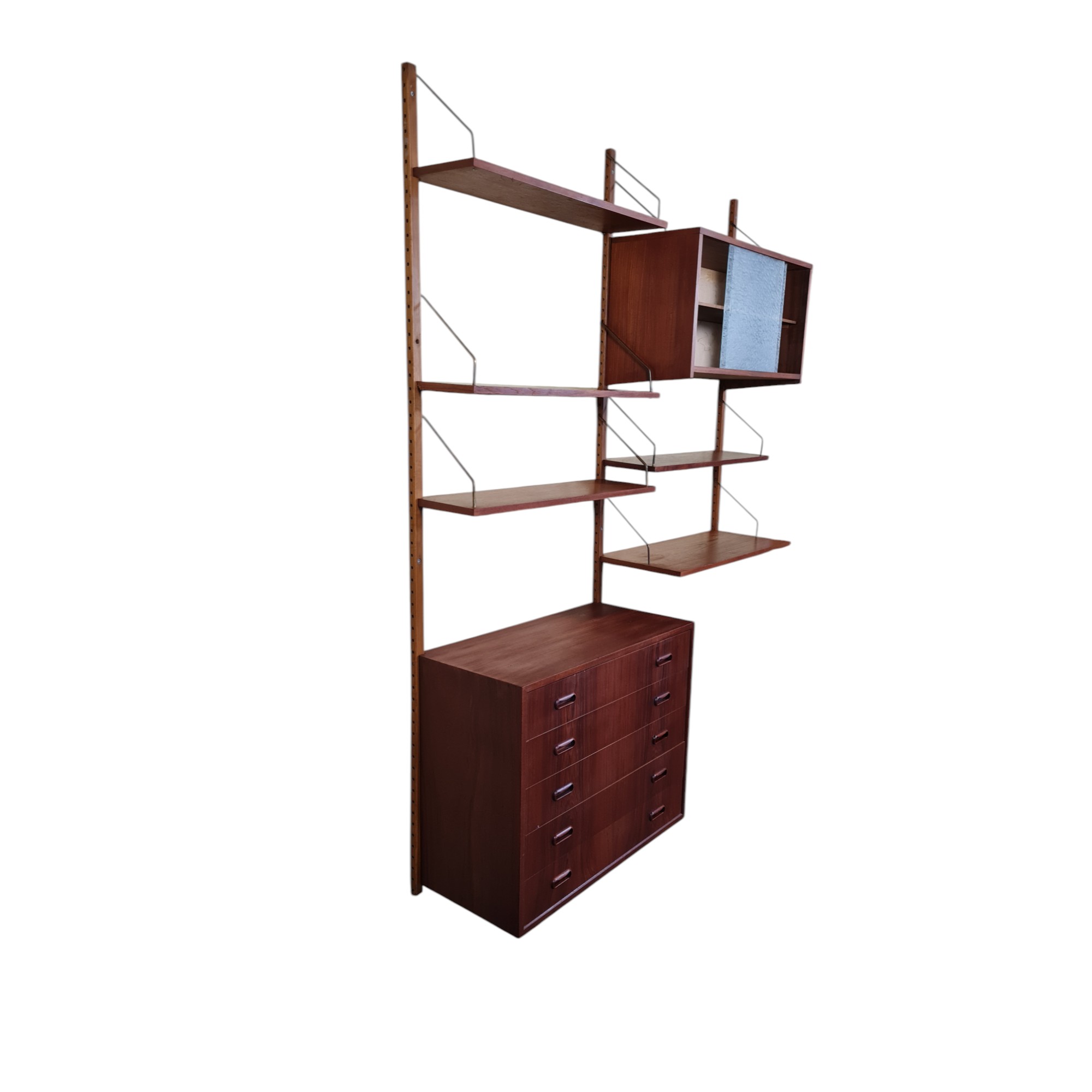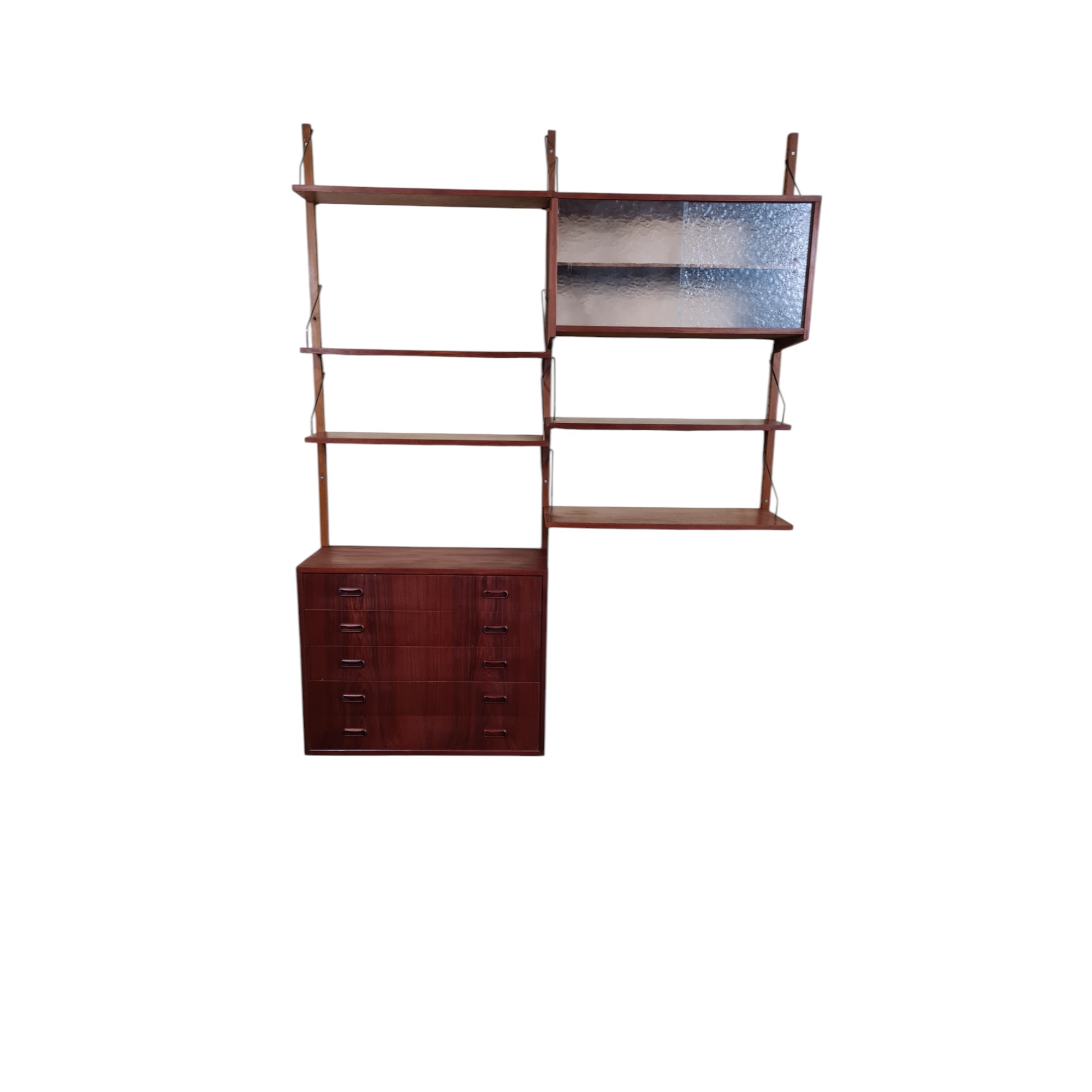 Flot væghængt reolsystem i to sektioner, formgivet i 1950’erne og udført i fineret teak. Systemet består af både vitrine- og skabsmodul samt fire hylder i varierende dybder – en fleksibel og stilren opbevaringsløsning, der kombinerer funktion med æstetik.