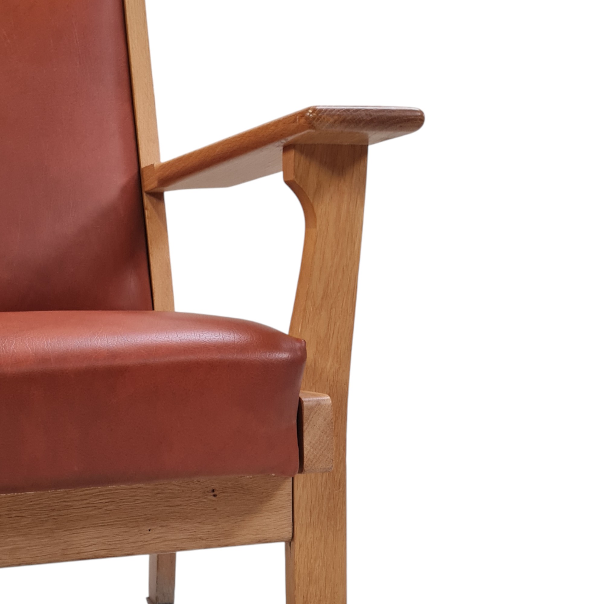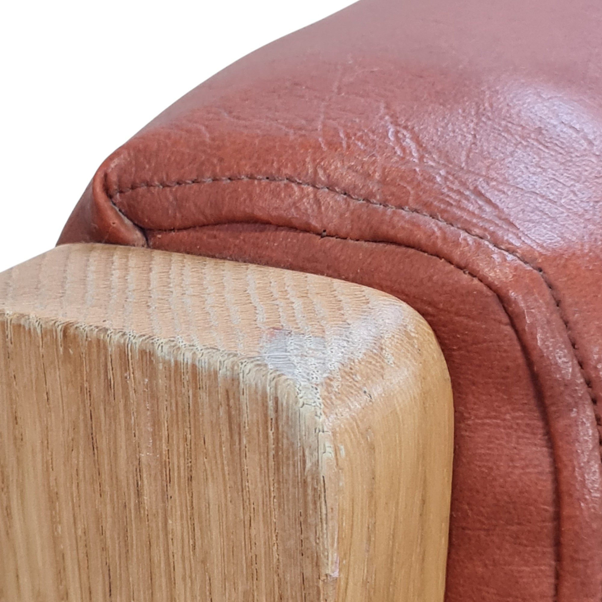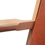 Stolen er udført i massiv bøg og polstret i cognacfarvet kunstlæder, hvilket giver et varmt og klassisk udtryk.